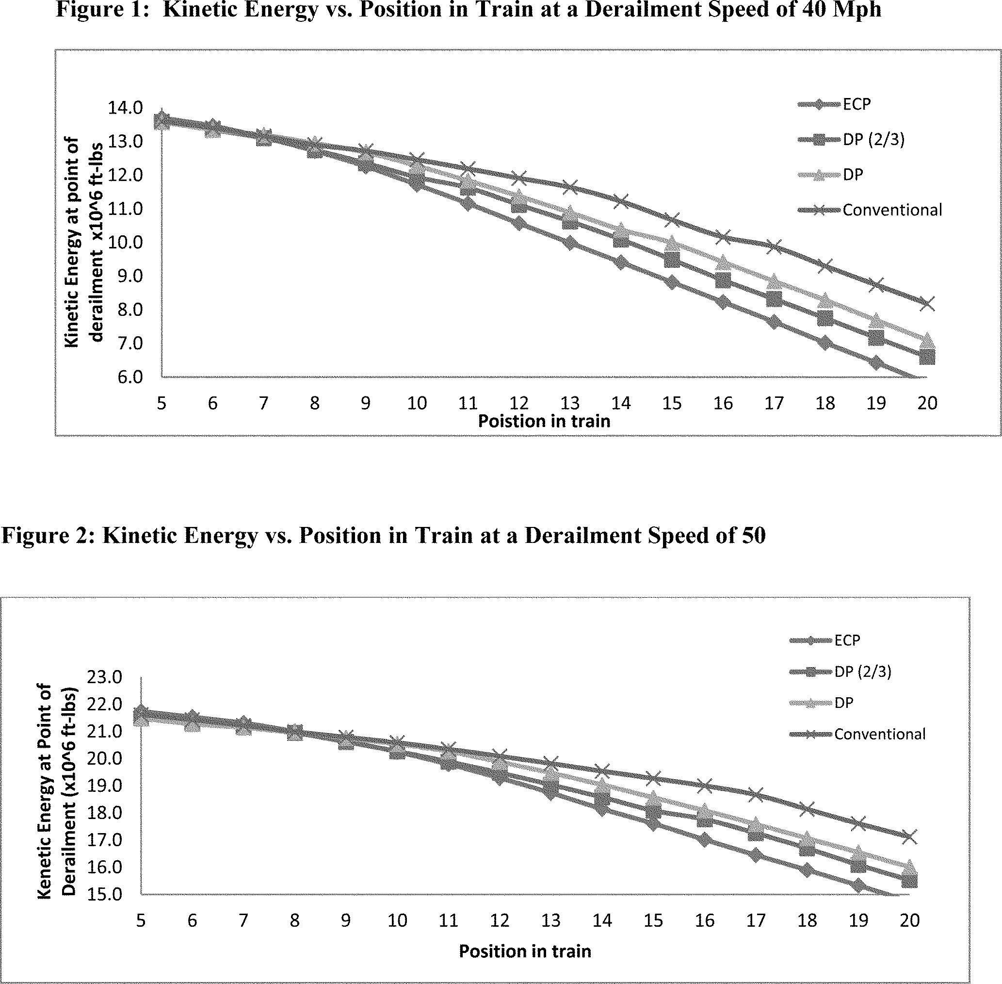 Modeling and simulation of puncture velocity indicate a puncture velocity of approximately 7.4 mph for a legacy DOT Specification 111; 9.6 mph for Option 3; and 12.3 mph for the cars under Options 1 and 2. Puncture velocity is based on an impact with a rigid 12″ × 12″ indenter with a weight of 297,000 pounds.