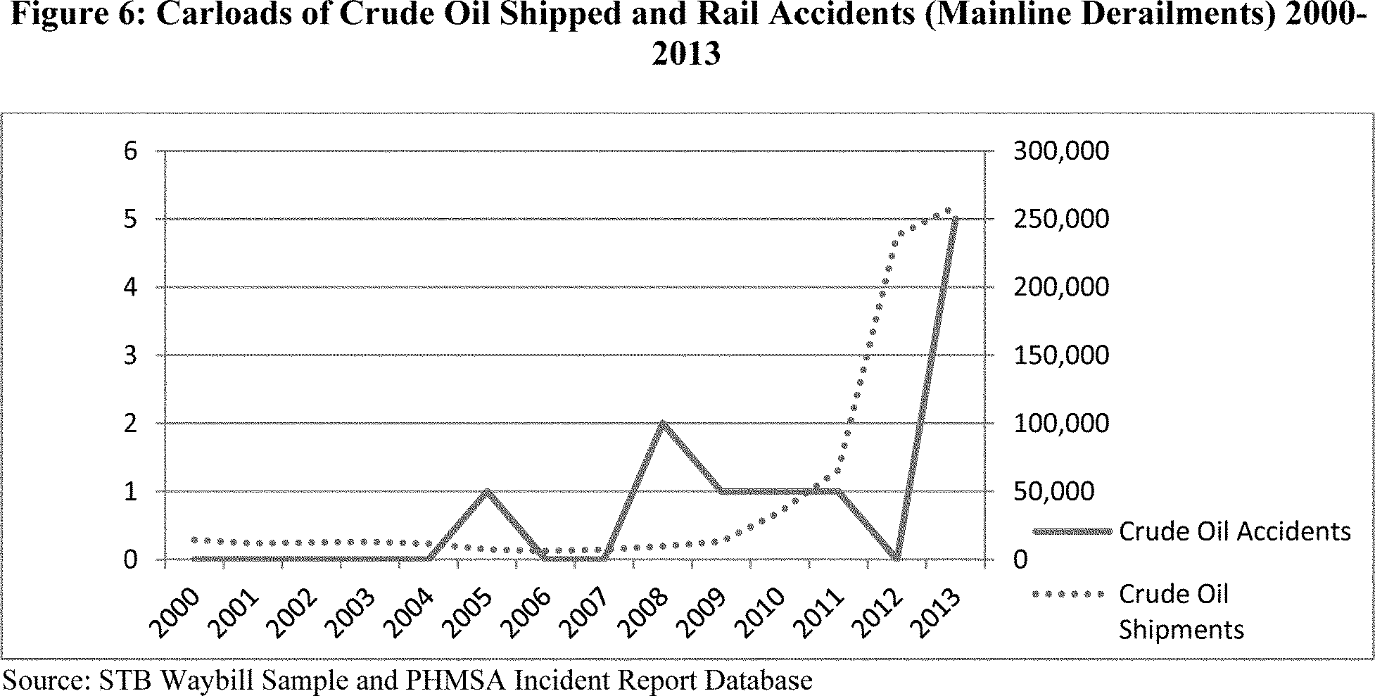 Volumes continued to increase in 2013, as the number of rail carloads of crude oil surpassed 400,000.[3]