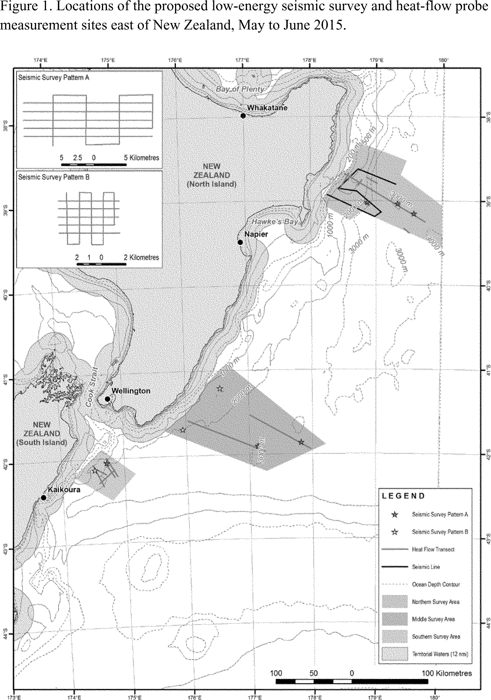 In support of a research project put forward by Oregon State University (OSU) and to be funded by NSF, SIO proposes to conduct a low-energy seismic survey in the Southwest Pacific Ocean, East of New Zealand, from May to June 2015. In addition to the low-energy seismic survey, scientific research activities would include conducting a bathymetric profile survey of the seafloor using transducer-based instruments such as a multi-beam echosounder and sub-bottom profiler; and heat-flow measurements from the seafloor using various methods and equipment at three sites off the southeast coast of North Island and northeast coast of South Island, New Zealand. Water depths in the survey area are approximately 200 to 3,000 meters (m) (656.2 to 9,842.5 feet [ft]).
