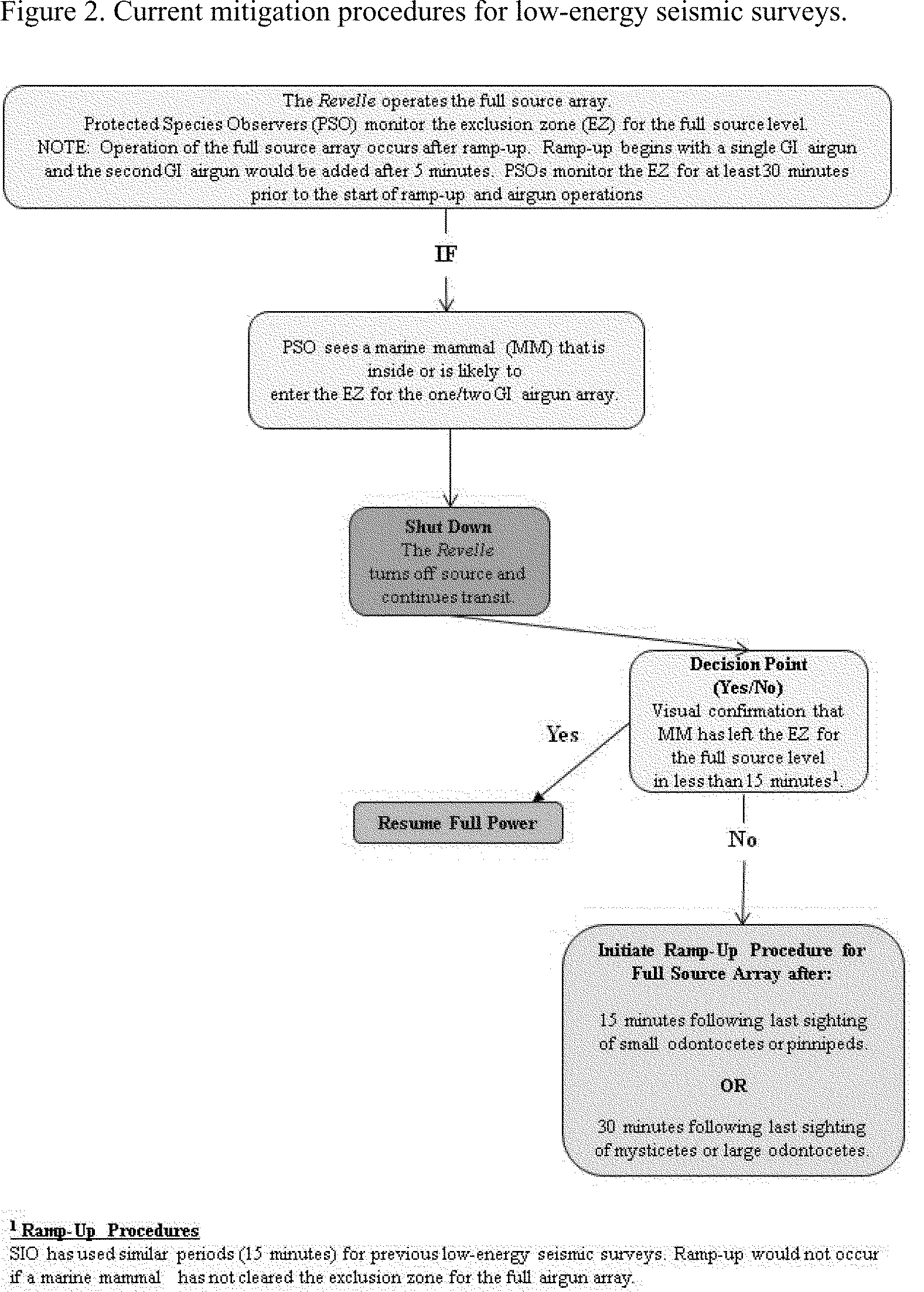 rough seas, fog, darkness), or if marine mammals are near, approaching, or in the exclusion zone, the airguns may not be ramped-up. If one airgun is already running at a source level of at least 180 dB re 1 μ Pa (rms), SIO may start the second airgun without observing the entire exclusion zone for 30 minutes prior, provided no marine mammals are known to be near the exclusion zone (in accordance with Condition 7[e] below).