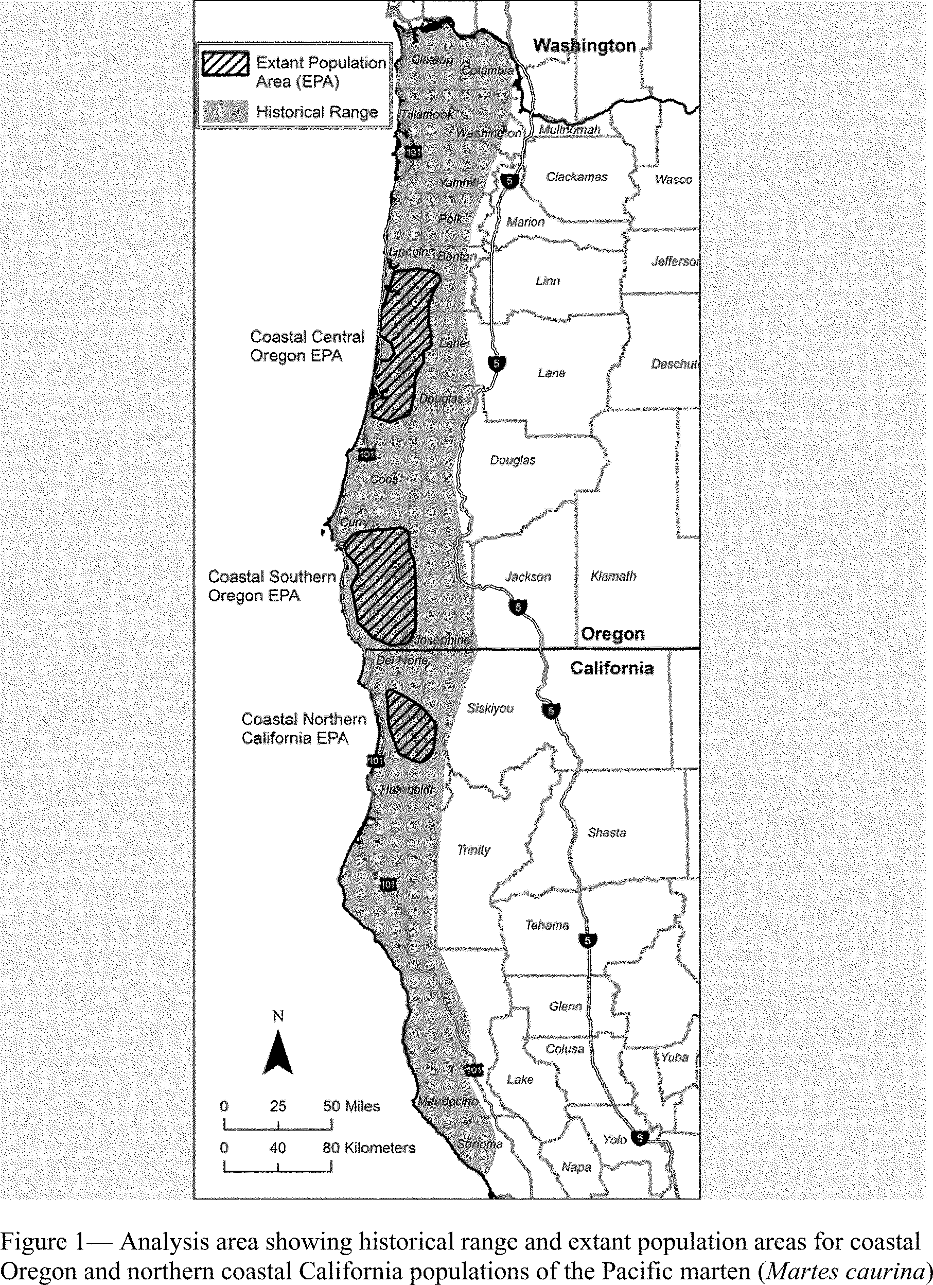 We consider the historical range of the coastal marten to include coastal Oregon from the Columbia River (Clatsop and Columbia counties) south into northern Sonoma County, California, including suitable habitat from the coast eastward to an elevation of 1,524 m (5,000 ft). This range encompasses the coastal central Oregon extant population area, the coastal southern Oregon extant population area, the coastal northern California extant population area, and the intervening habitat. Based on the best available information at this time, these populations account for the current distribution of the DPS.