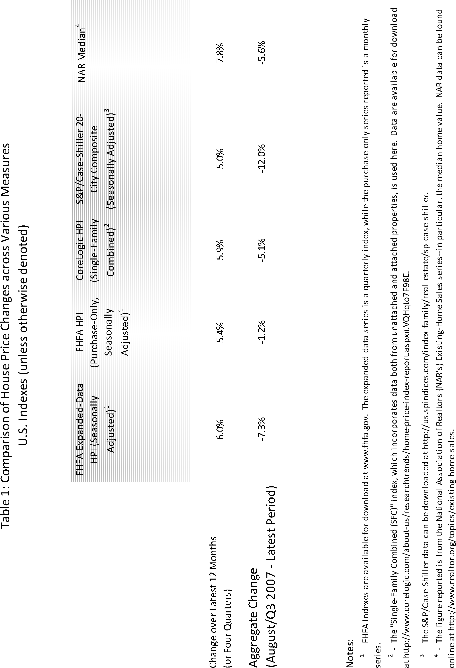 Using the expanded-data HPI and several other commonly-cited measures of home prices changes, Figure 1 and Table 1 compare price trends calculated by the expanded-data HPI and other estimates of price change. Figure 1 indicates that all of the indexes report a very similar evolution of prices since 2007. The metrics generally show significant price declines between 2007 and sometime in 2011 and then a robust recovery. The measures show that the