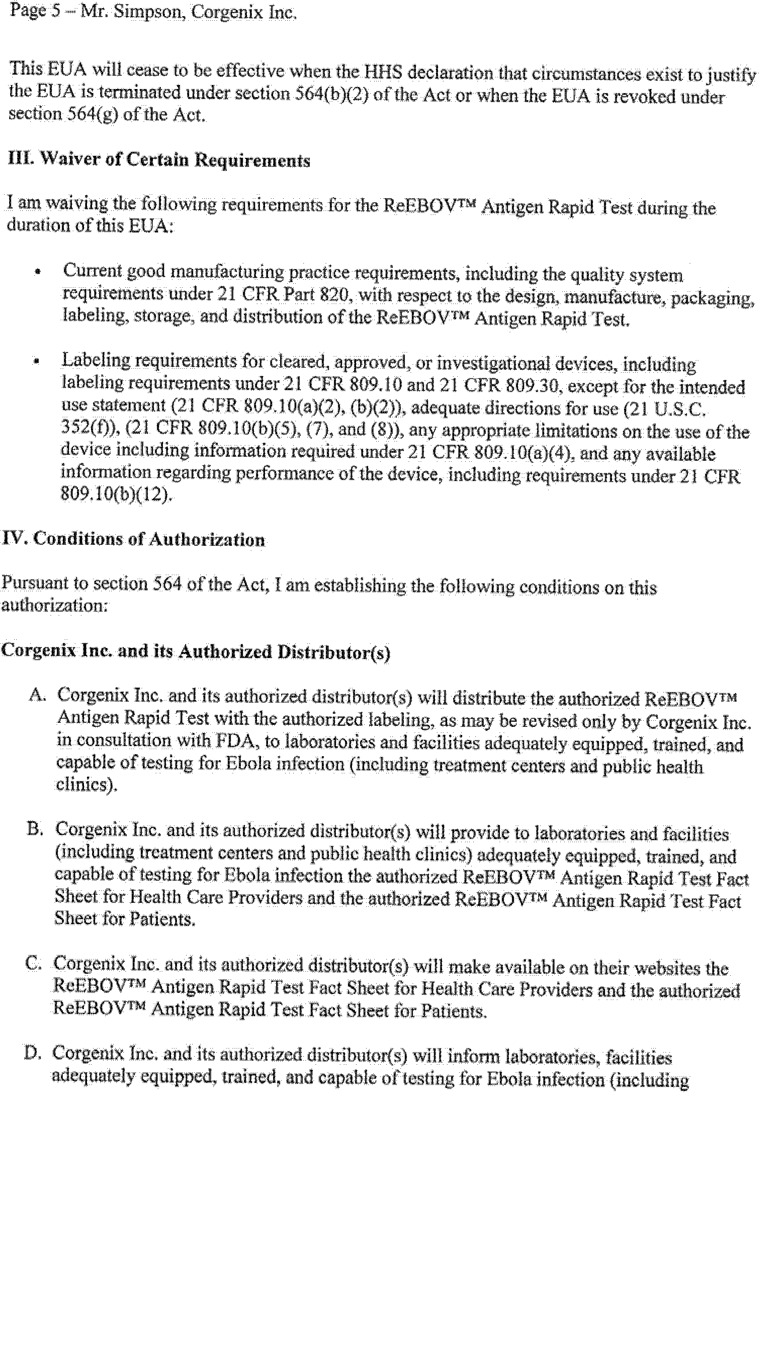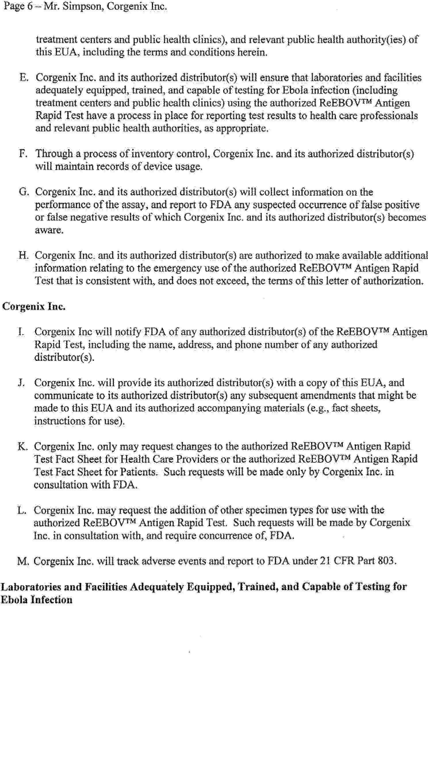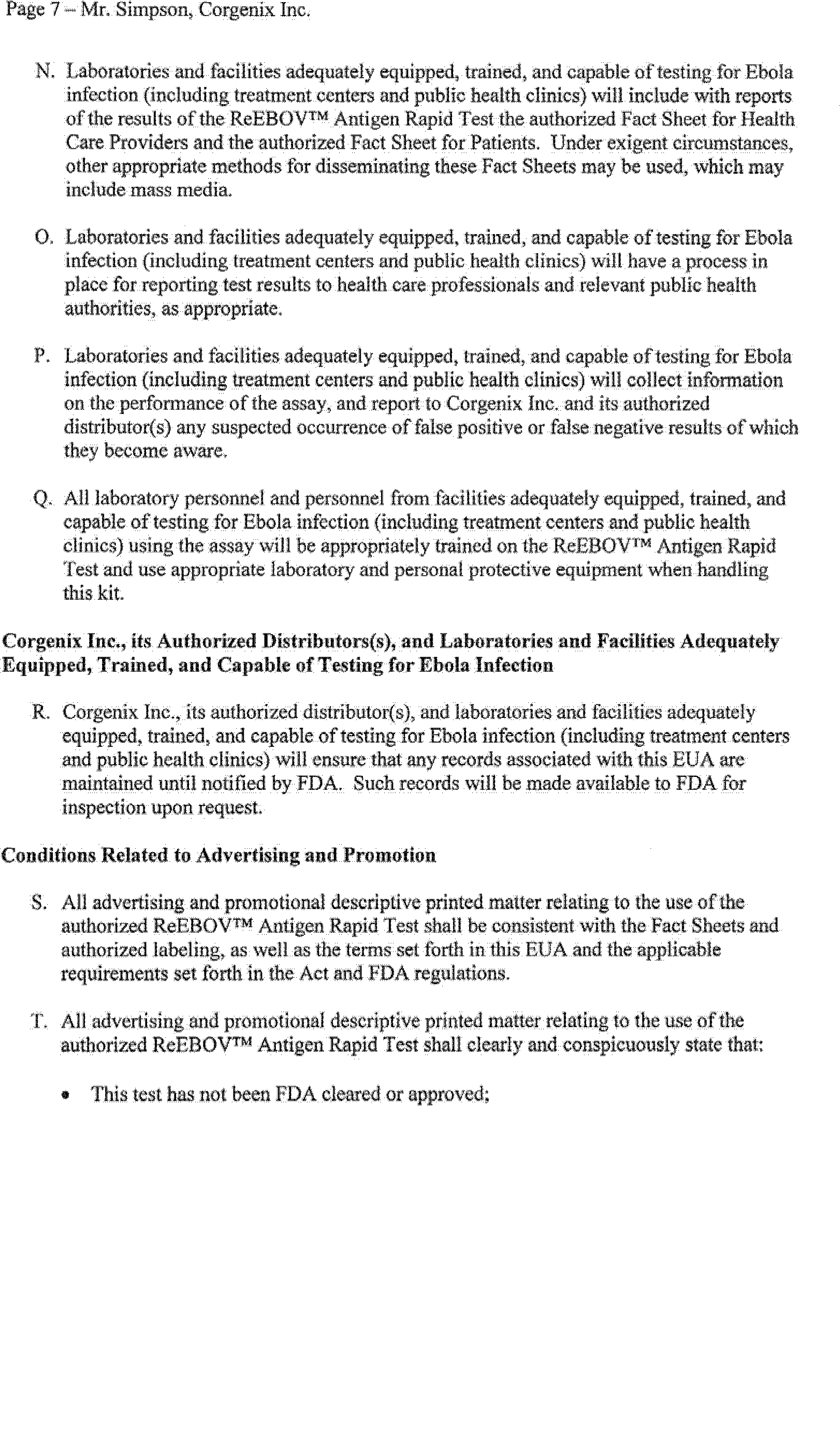 Antigen Rapid Test, subject to the terms of the Authorization. On March 16, 2015, in response to a request from Corgenix on March 10, 2015, FDA amended and reissued in its entirety the EUA to allow, in addition to Corgenix, distributors that are authorized by Corgenix to distribute the ReEBOVTM