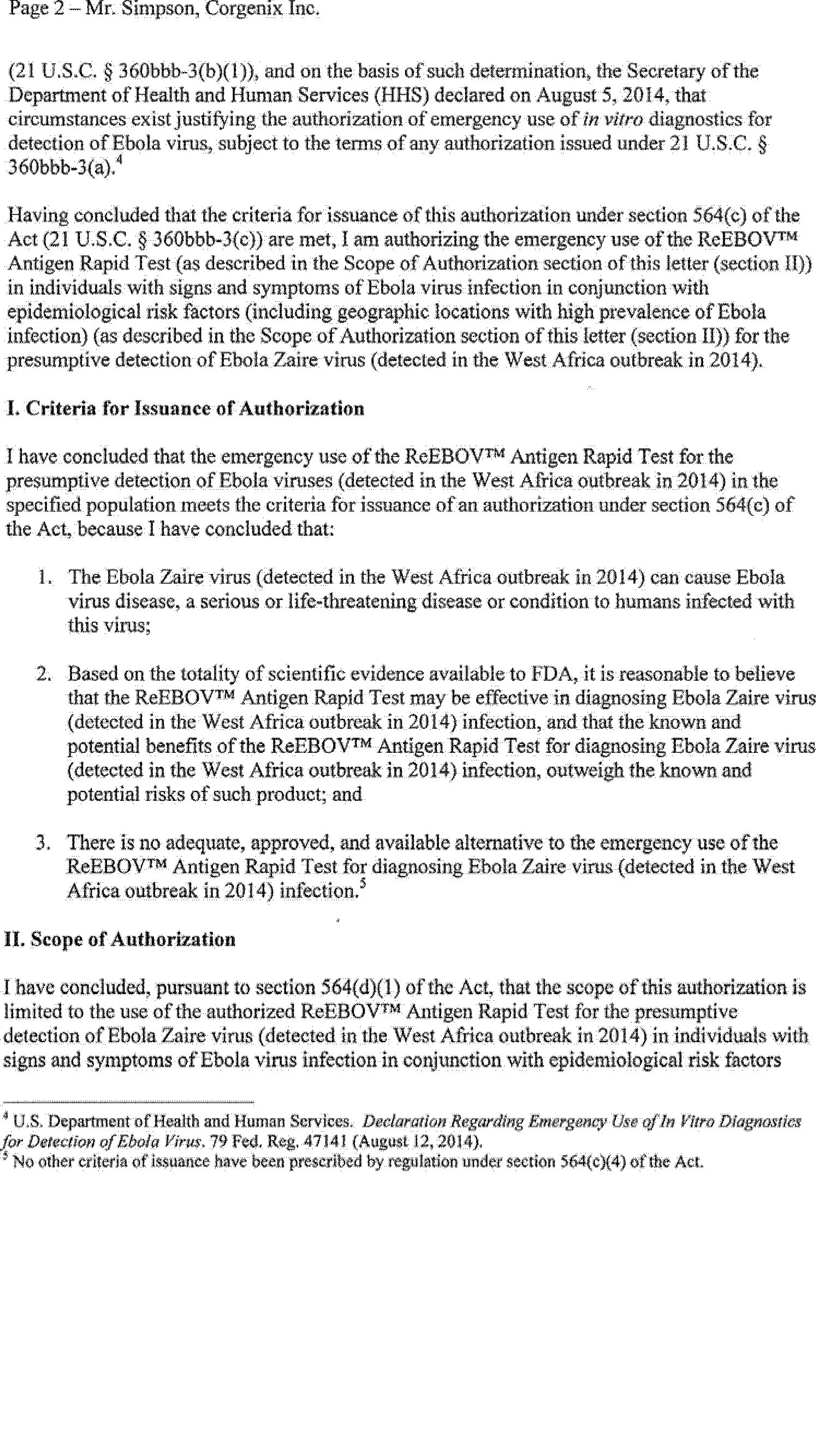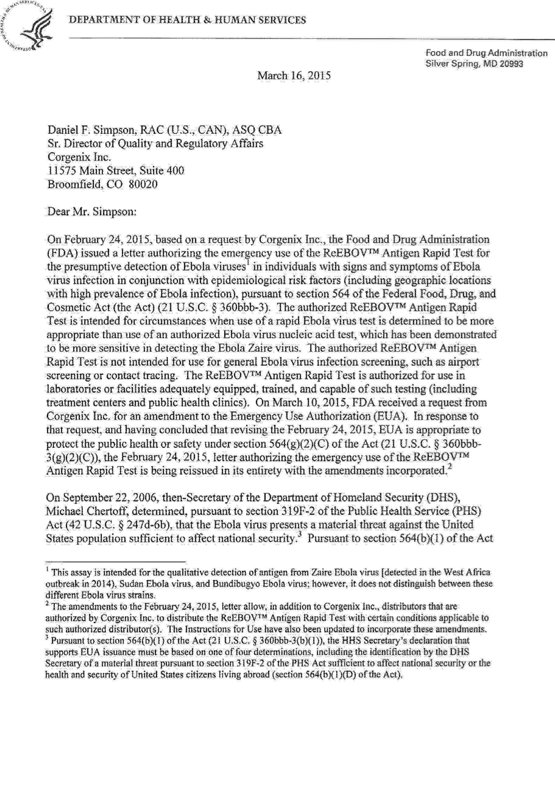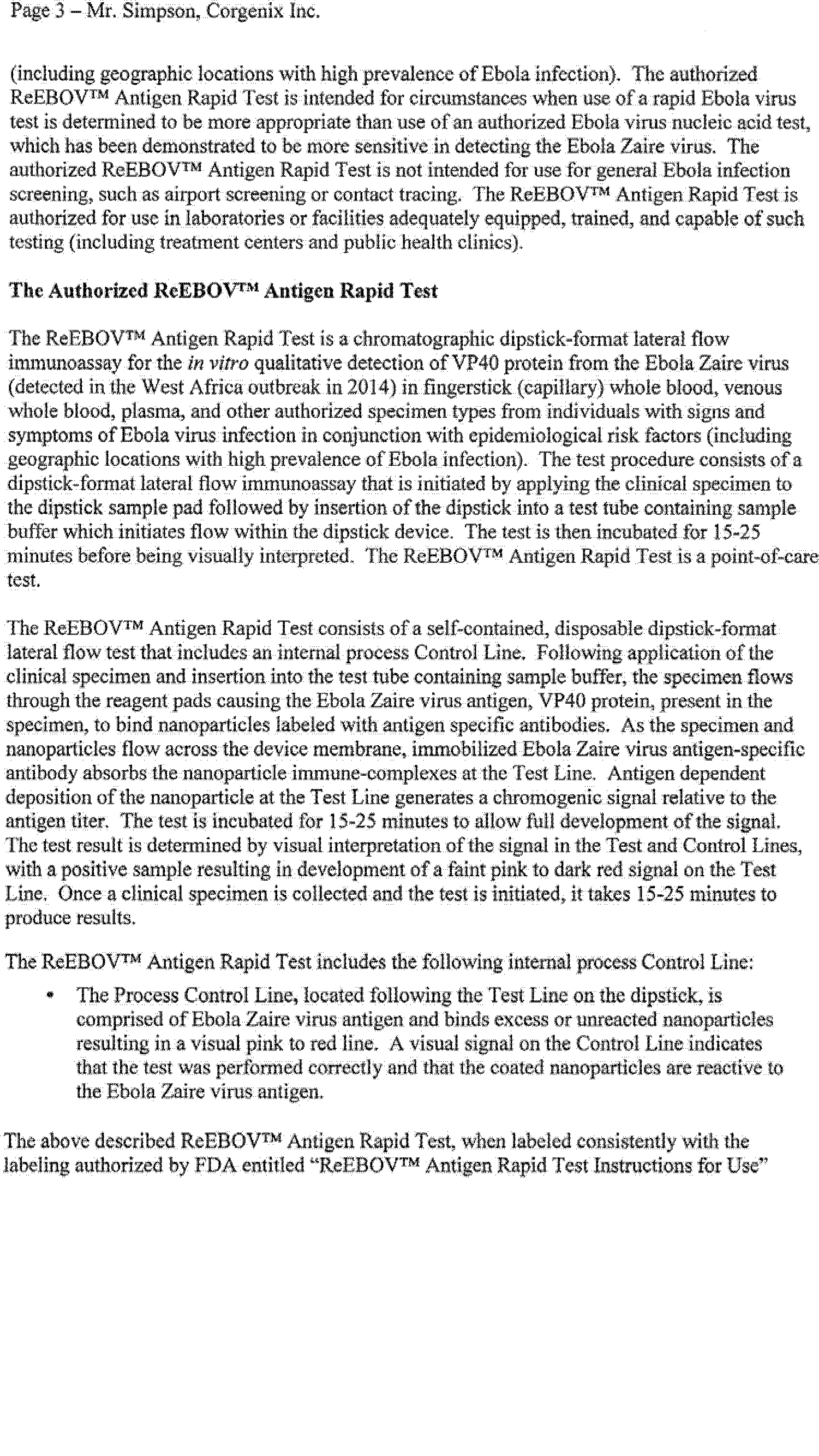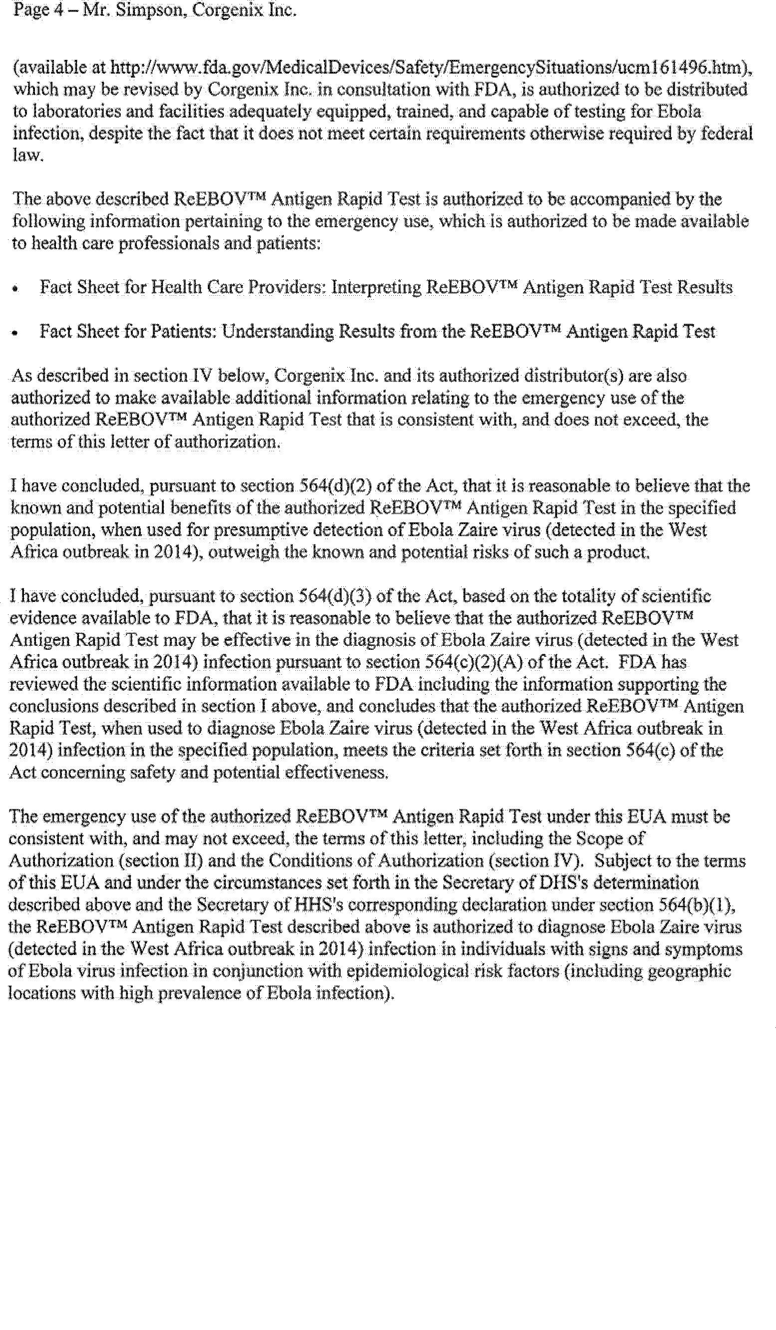 Antigen Rapid Test, subject to the terms of the Authorization. On March 16, 2015, in response to a request from Corgenix on March 10, 2015, FDA amended and reissued in its entirety the EUA to allow, in addition to Corgenix, distributors that are authorized by Corgenix to distribute the ReEBOVTM