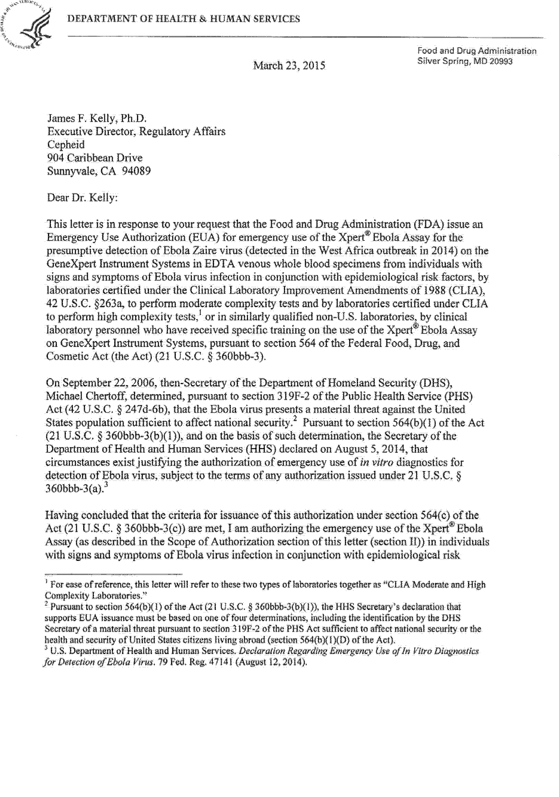 The Authorization for the Cepheid Xpert® Ebola Assay issued on March 23, 2015, in its entirety (not including the authorized versions of the fact sheets and other written materials) follows and provides an explanation of the reasons for its issuance, as required by section 564(h)(1) of the FD&C Act: