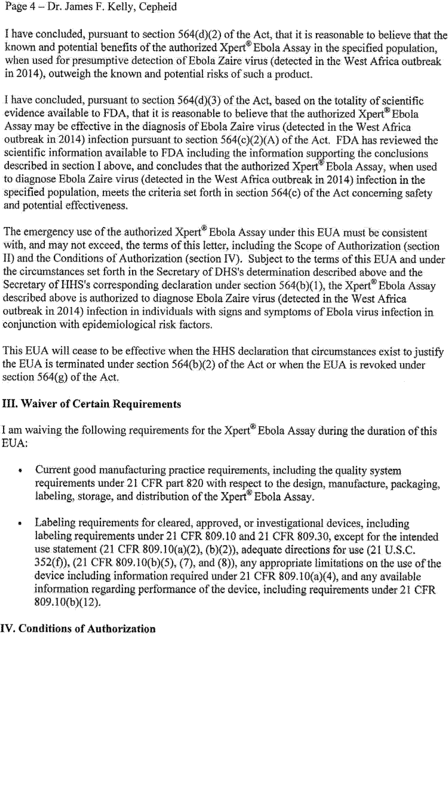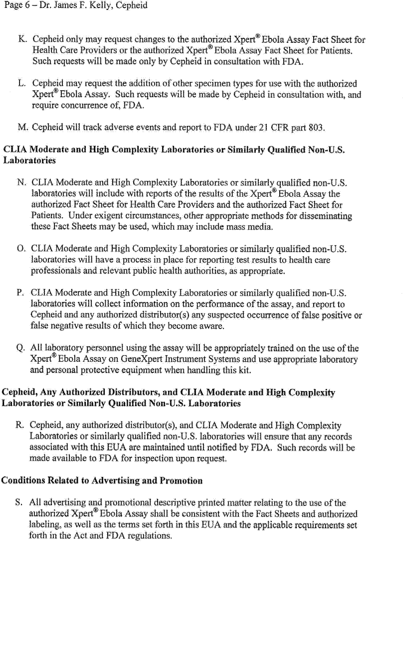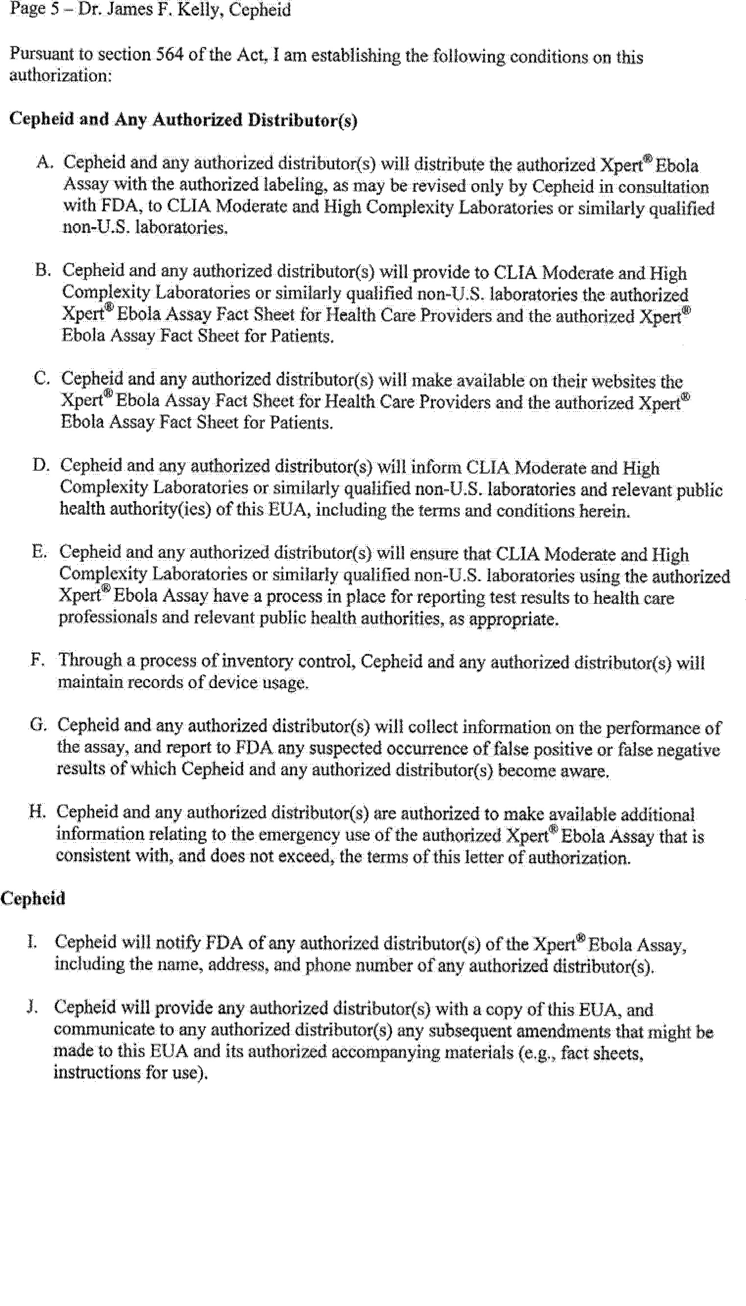Antigen Rapid Test, with certain conditions applicable to such authorized distributor(s), subject to the terms of this Authorization. This EUA, as amended and reissued on March 16, 2015, which includes an explanation for its reissuance, is reprinted in this document. Because the March 16, 2015, Authorization for Corgenix's assay replaces in its entirety the EUA issued on February 24, 2015, the original Authorization issued on February 24, 2015, is not reprinted in this document. On February 26, 2015, Cepheid submitted a complete request for, and on March 23, 2015, FDA issued, an EUA for the Xpert® Ebola Assay, subject to the terms of this Authorization.