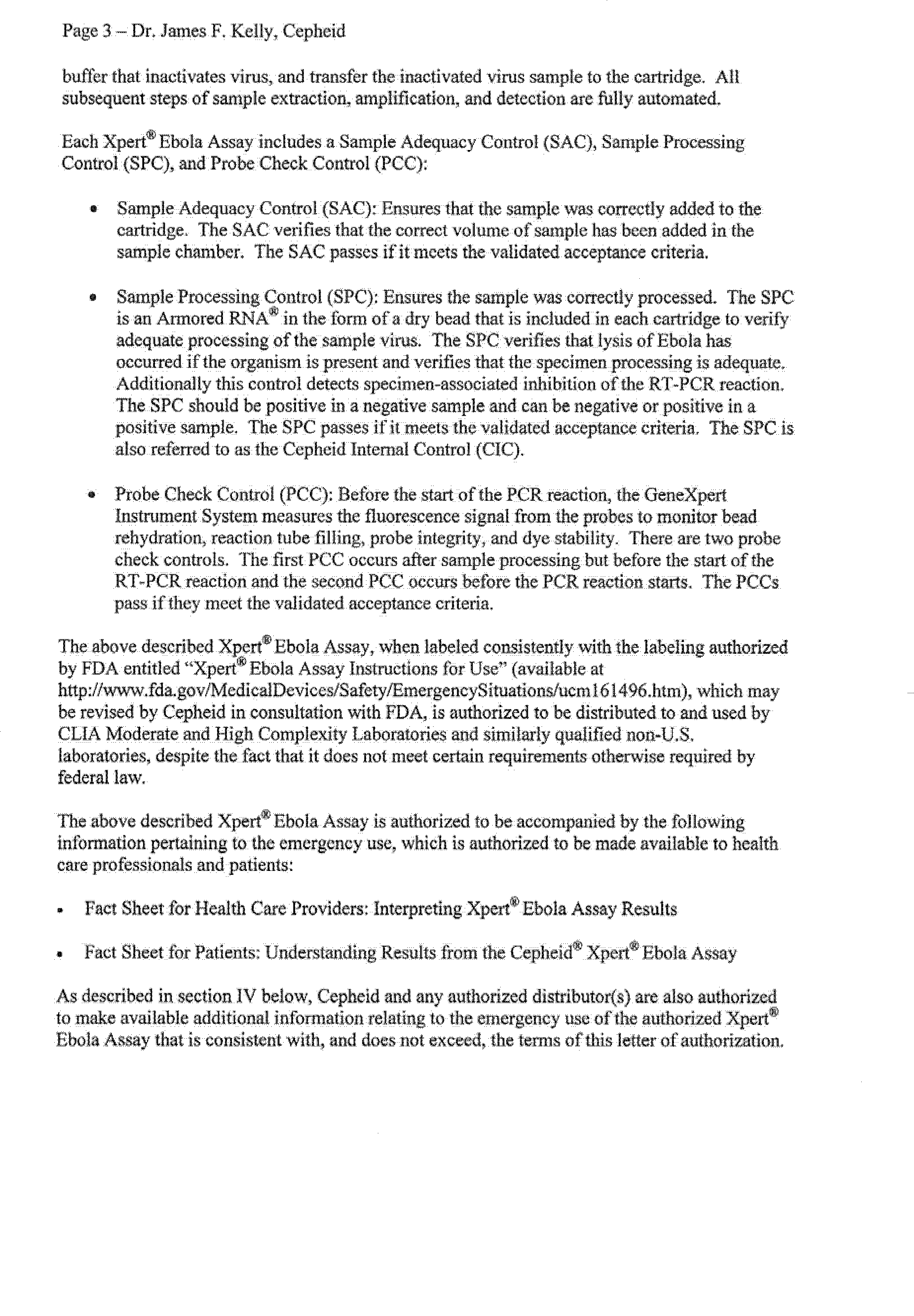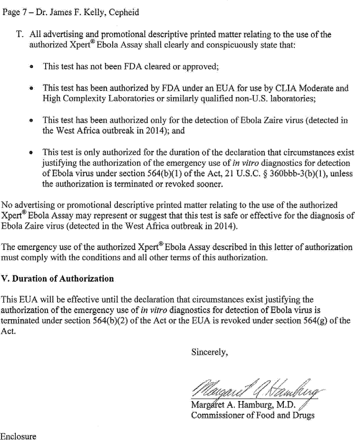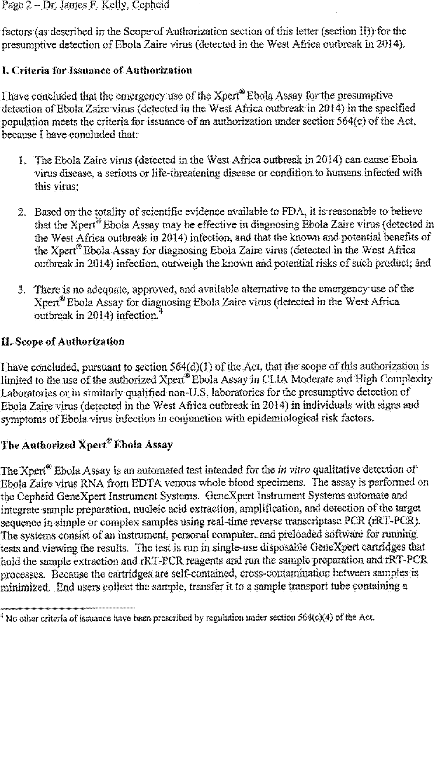 Antigen Rapid Test, with certain conditions applicable to such authorized distributor(s), subject to the terms of this Authorization. This EUA, as amended and reissued on March 16, 2015, which includes an explanation for its reissuance, is reprinted in this document. Because the March 16, 2015, Authorization for Corgenix's assay replaces in its entirety the EUA issued on February 24, 2015, the original Authorization issued on February 24, 2015, is not reprinted in this document. On February 26, 2015, Cepheid submitted a complete request for, and on March 23, 2015, FDA issued, an EUA for the Xpert® Ebola Assay, subject to the terms of this Authorization.