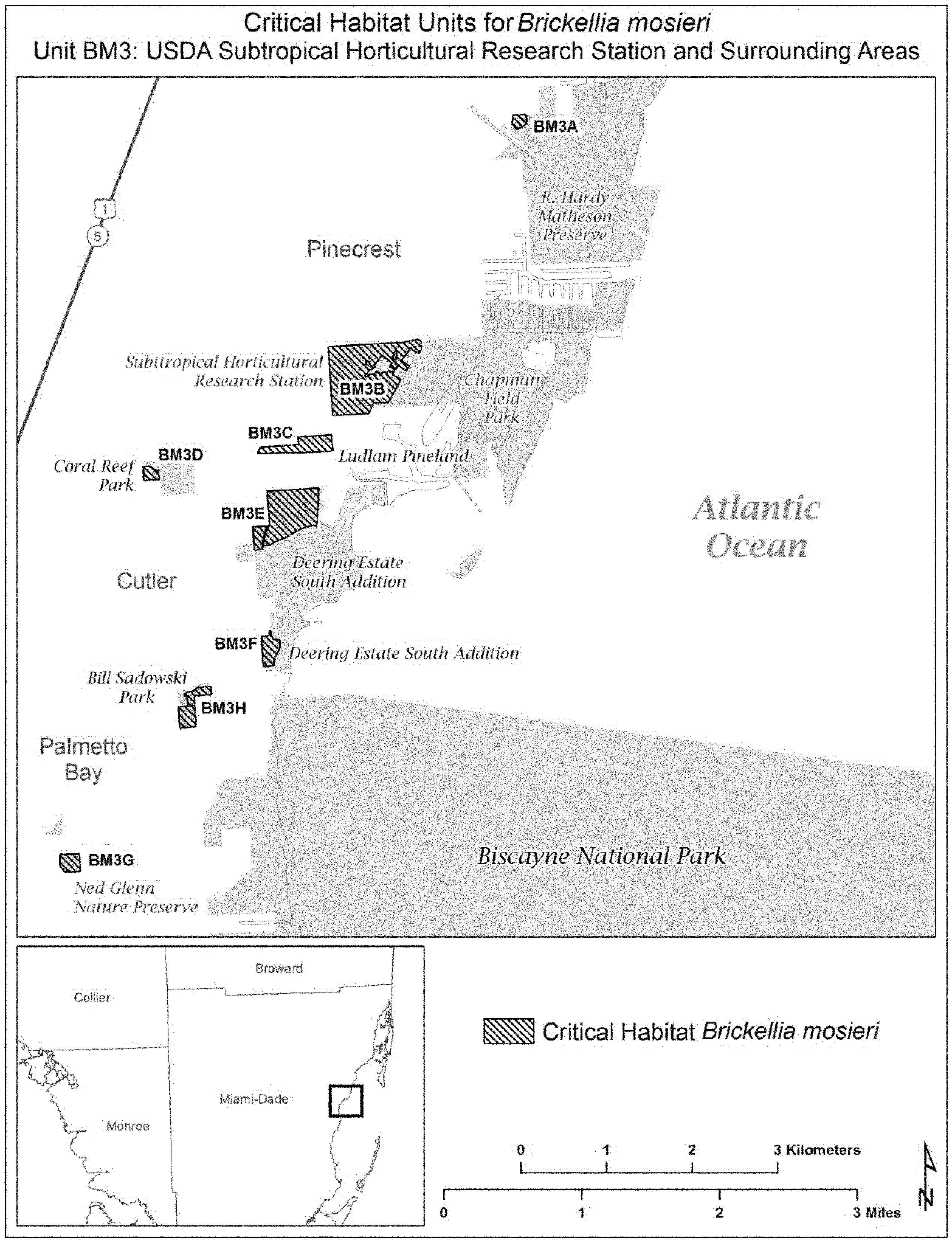(8) Unit BM3: USDA Subtropical Horticultural Research Station and surrounding areas, Miami-Dade County, Florida. Map of Unit BM3 follows: