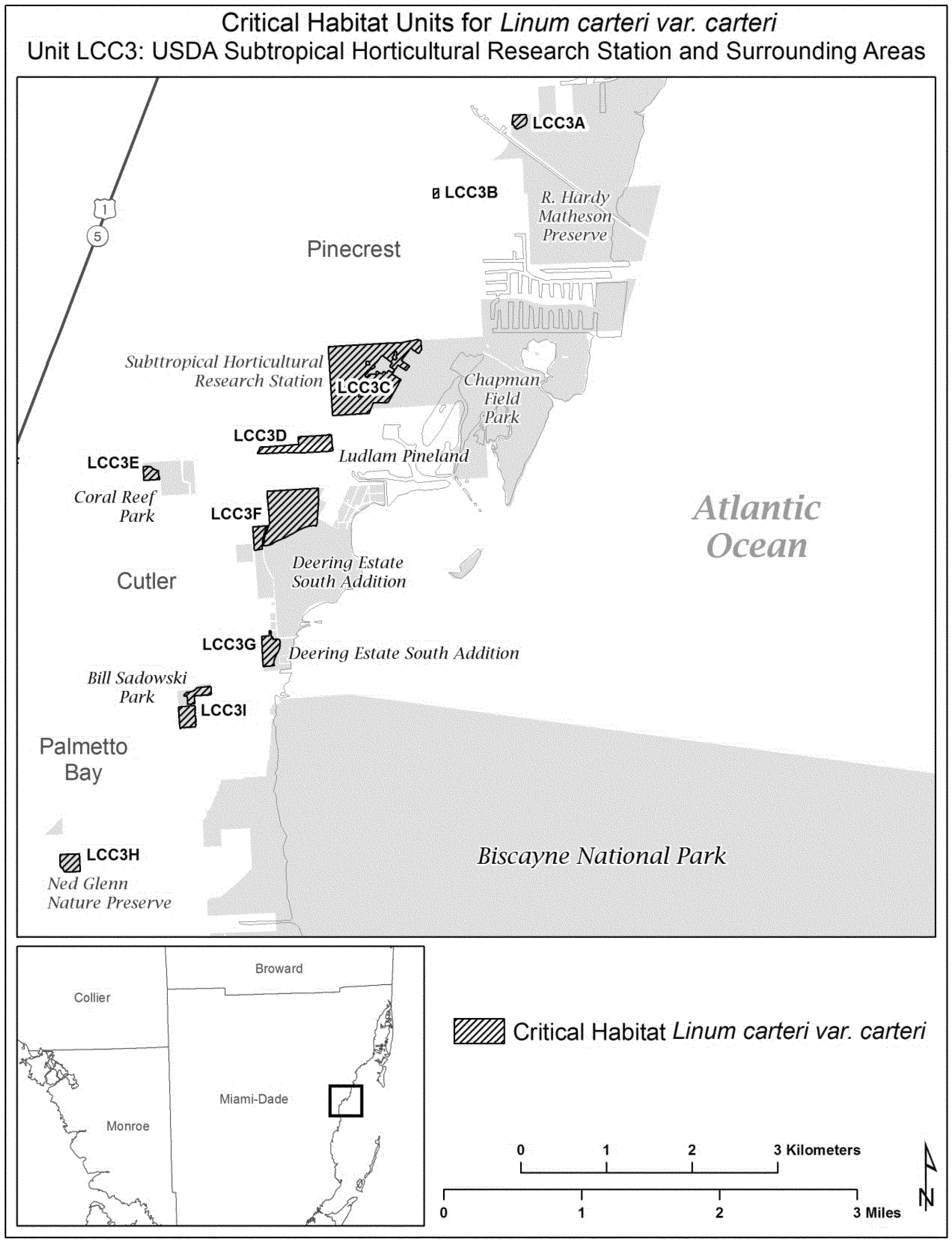 (8) Unit LCC3: USDA Subtropical Horticultural Research Station and surrounding areas, Miami-Dade County, Florida. Map of Unit LCC3 follows: