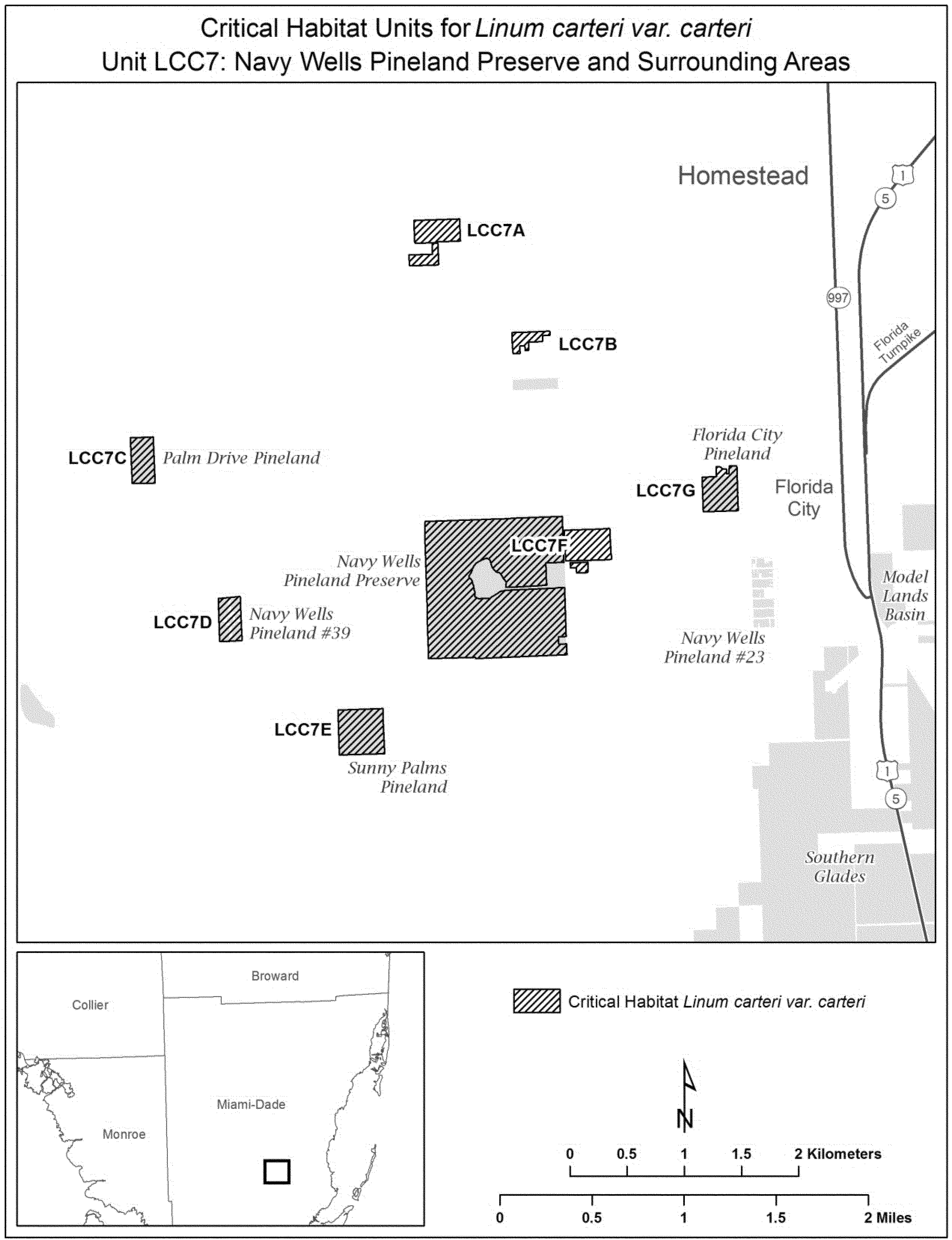 (12) Unit LCC7: Navy Wells Pineland Preserve and surrounding areas, Miami-Dade County, Florida. Map of Unit LCC7 follows: