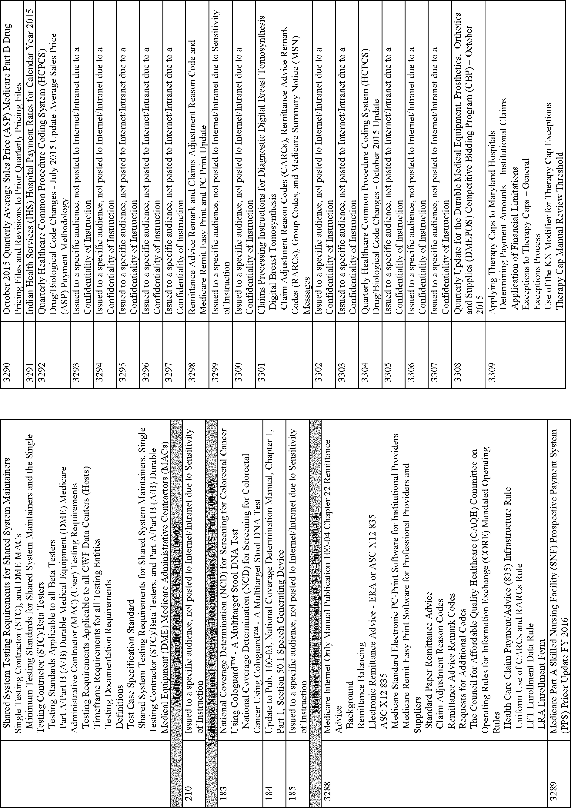 This quarterly notice lists CMS manual instructions, substantive and interpretive regulations, and other Federal Register notices that were published from July through September 2015, relating to the Medicare and Medicaid programs and other programs administered by CMS.