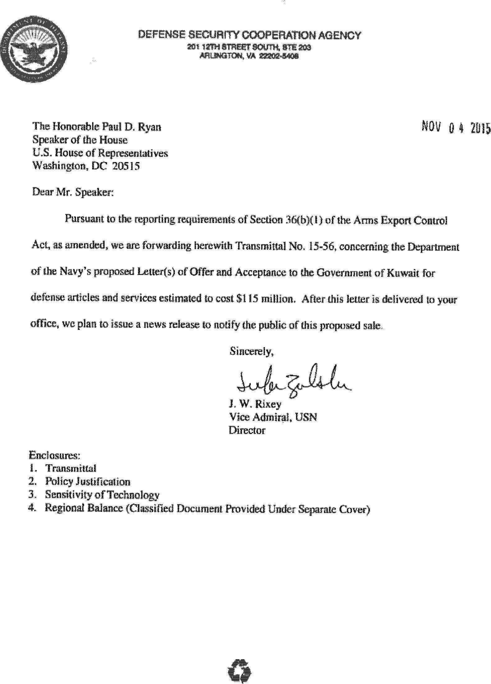 The following is a copy of a letter to the Speaker of the House of Representatives, Transmittal 15-56 with attached Policy Justification and Sensitivity of Technology.