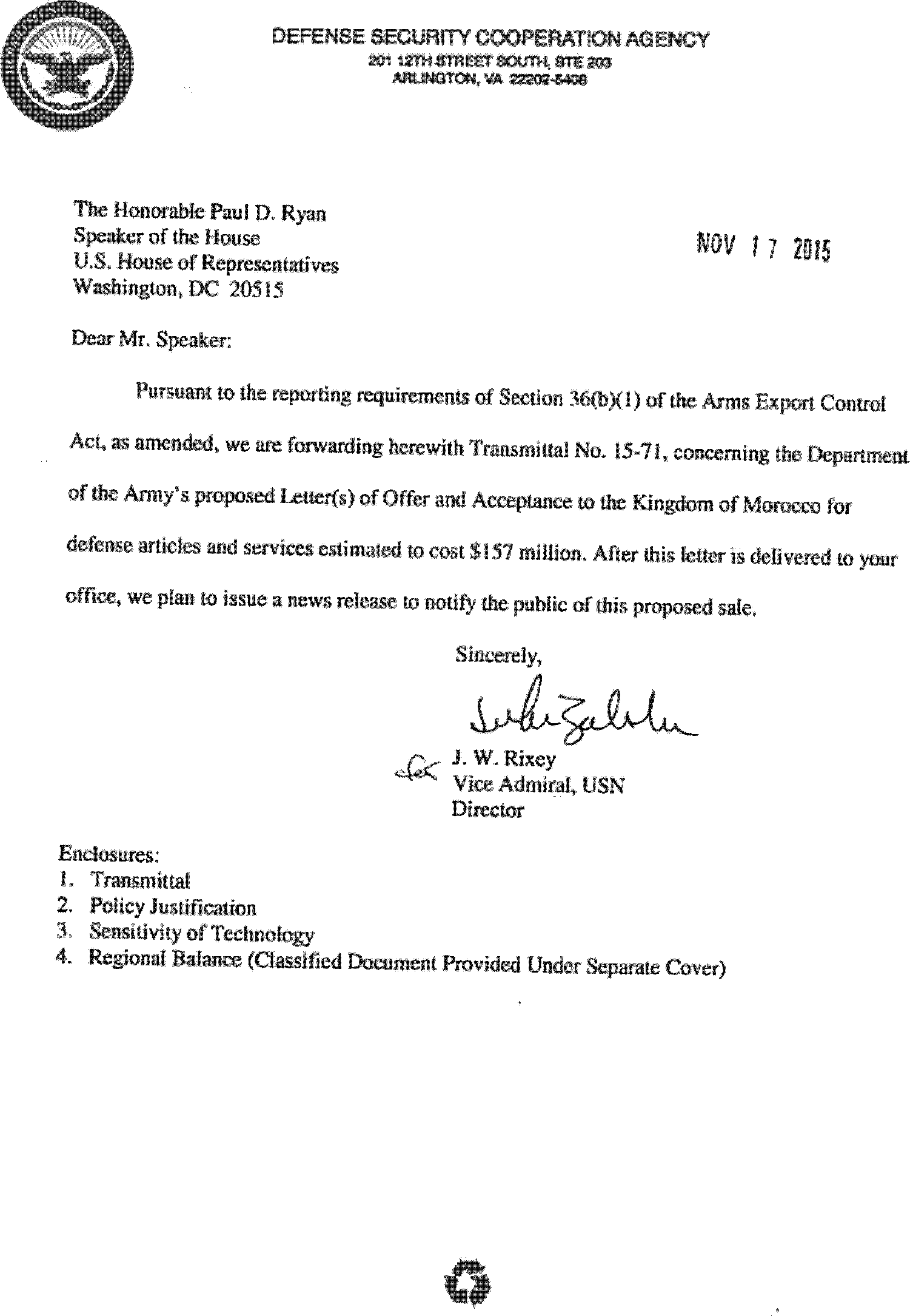 The following is a copy of a letter to the Speaker of the House of Representatives, Transmittal 15-71 with attached Policy Justification and Sensitivity of Technology.