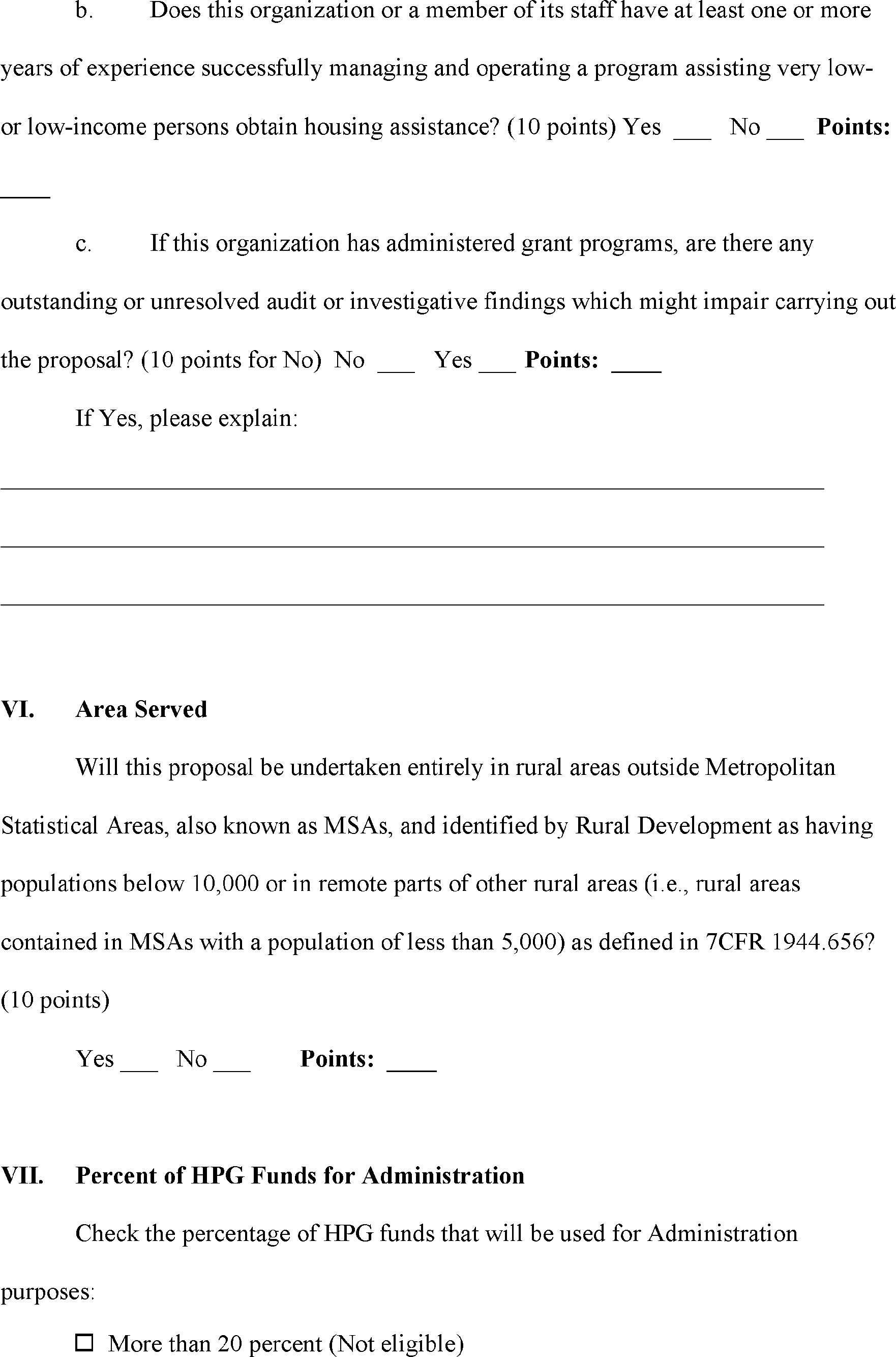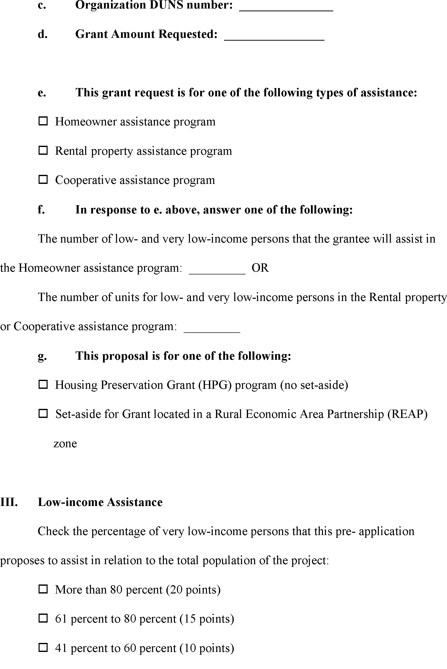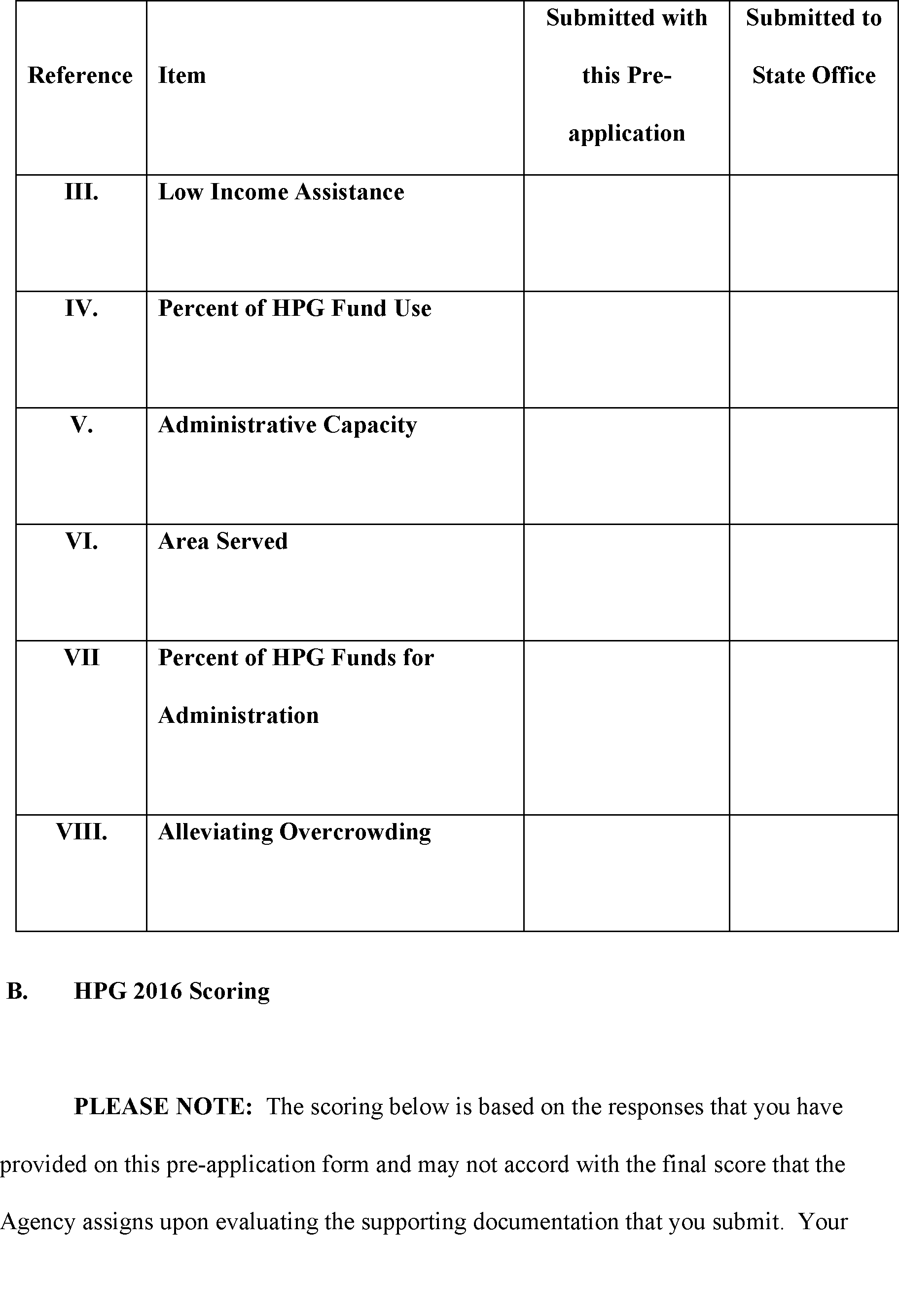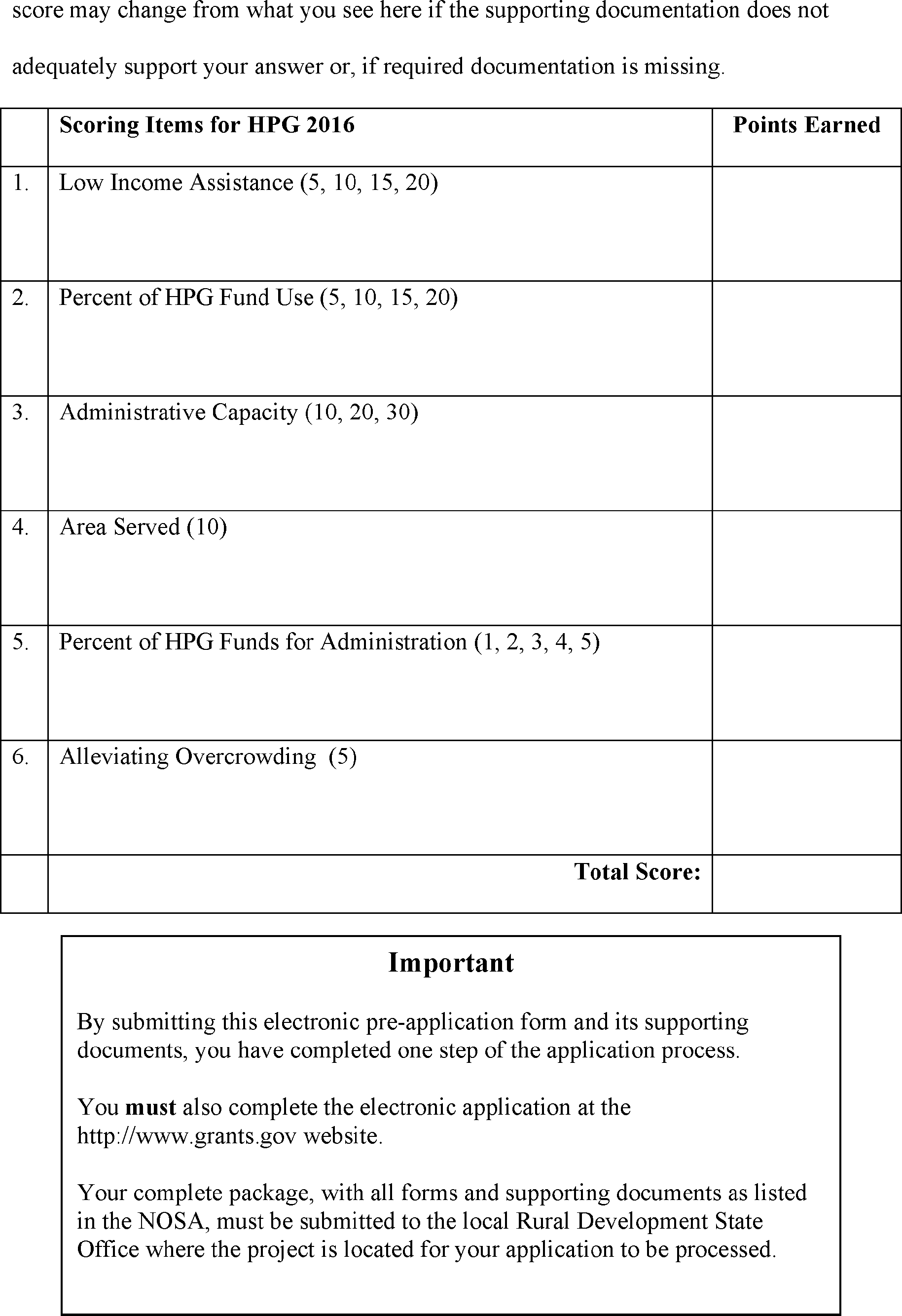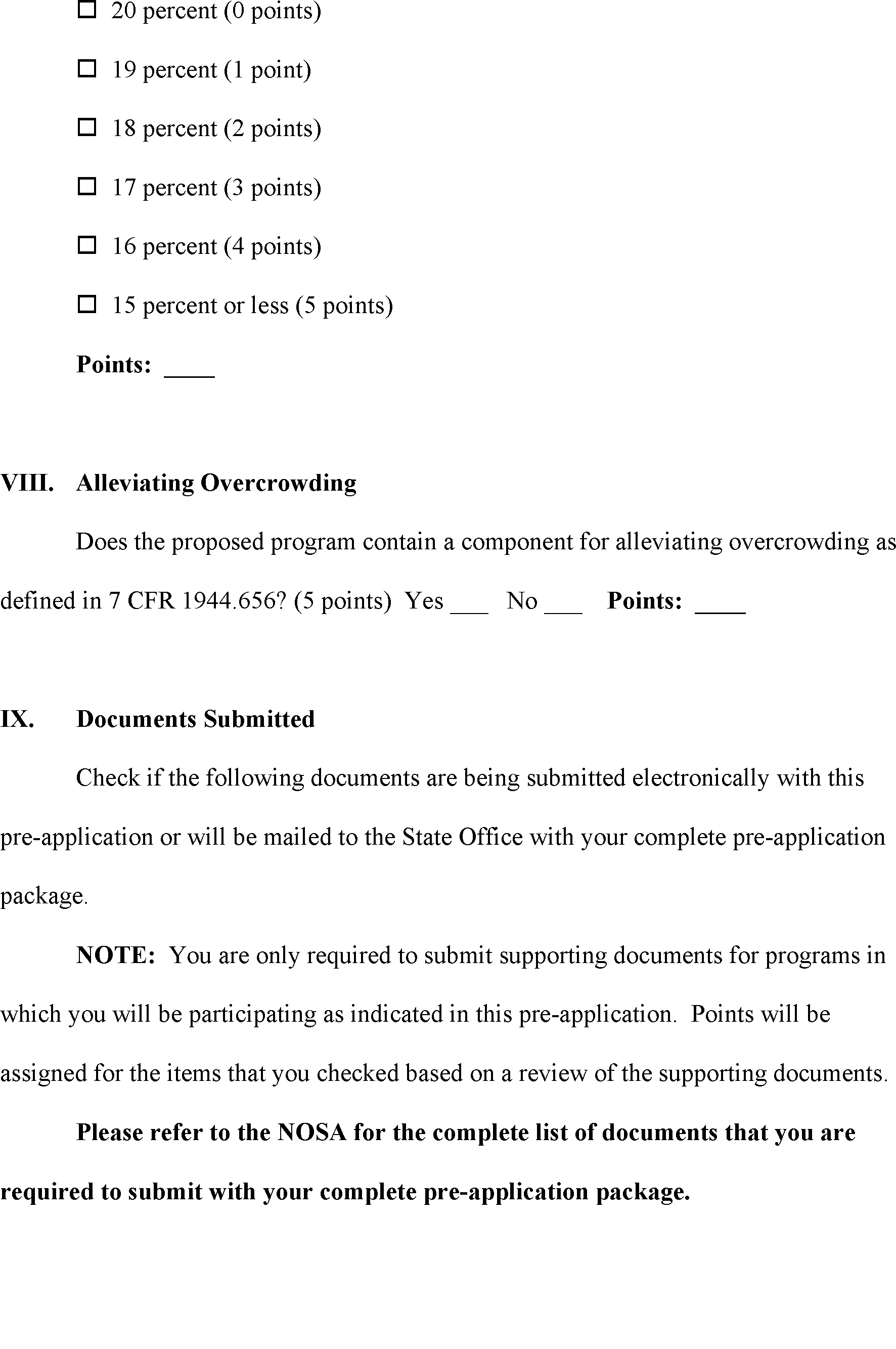 Supporting documentation required by this pre-application may be attached to the email generated when you click the Send Form button to submit the form. However if the attachments are too numerous or large in size, the email box will not be able to accept them. In that case, submit the supporting documentation for this pre-application to the State Office with your complete application package under item IX.