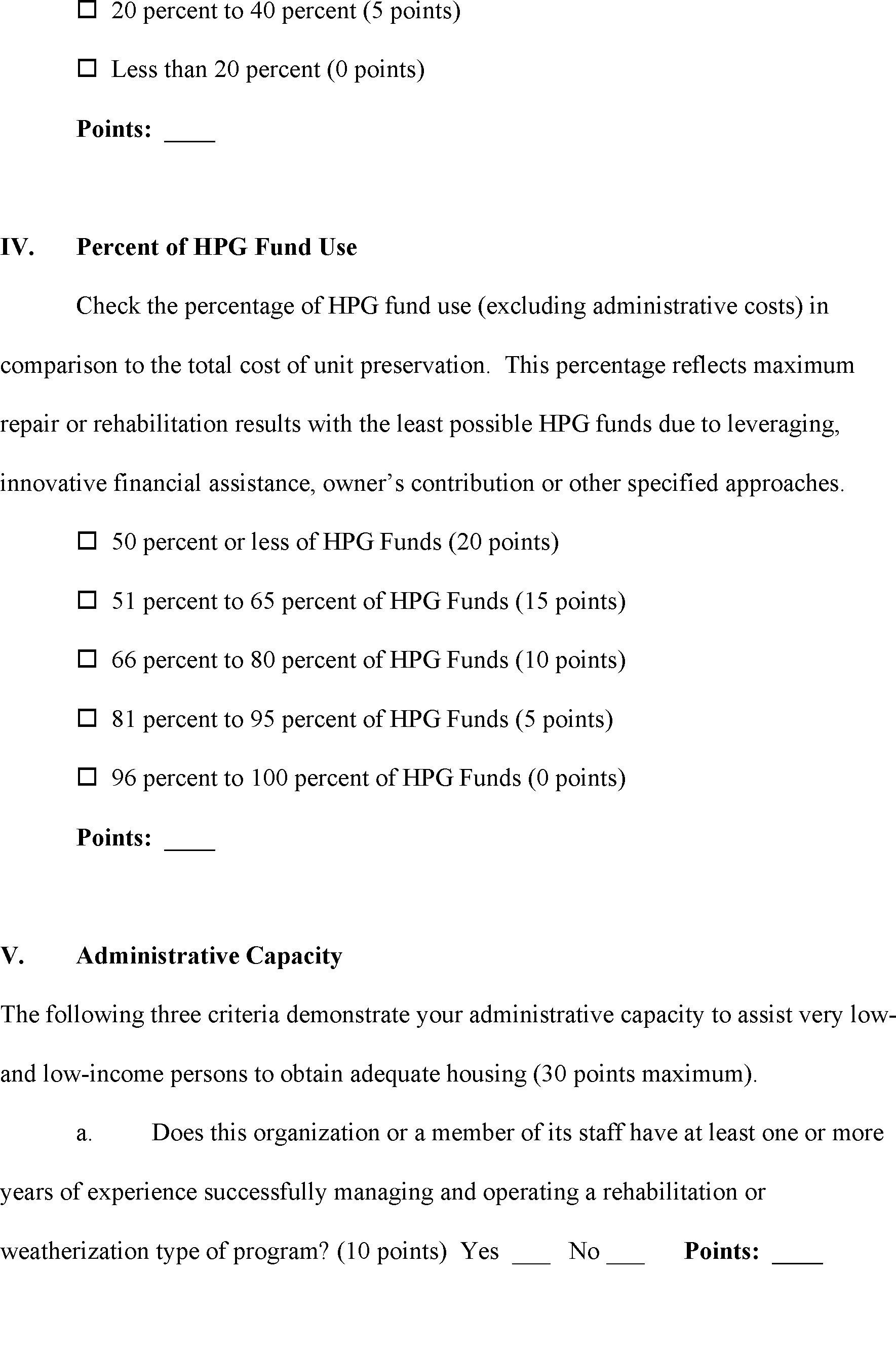 (b) The applicant's proposal may be expected to result in the following percentage of HPG fund use (excluding administrative costs) to total cost of unit preservation. This percentage reflects maximum repair or rehabilitation with the least possible HPG funds due to leveraging, innovative financial assistance, owner's contribution or other specified approaches. Points are awarded based on the following percentage of HPG funds (excluding administrative costs) to total funds:
