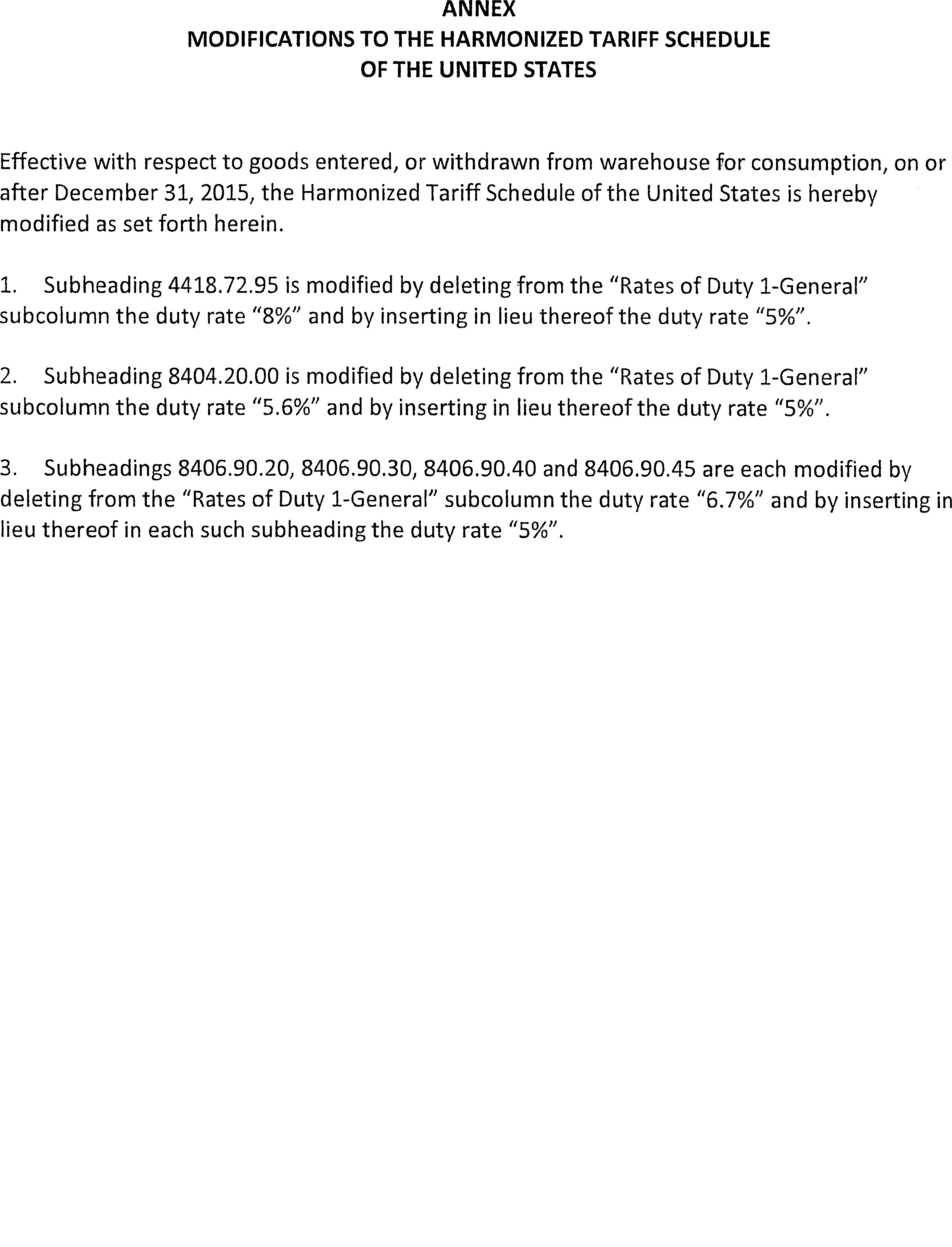 (2) The modifications to the HTS set forth in the Annex to this proclamation shall be effective with respect to goods entered, or withdrawn from warehouse for consumption, on or after December 31, 2015. ( printed page 81156)