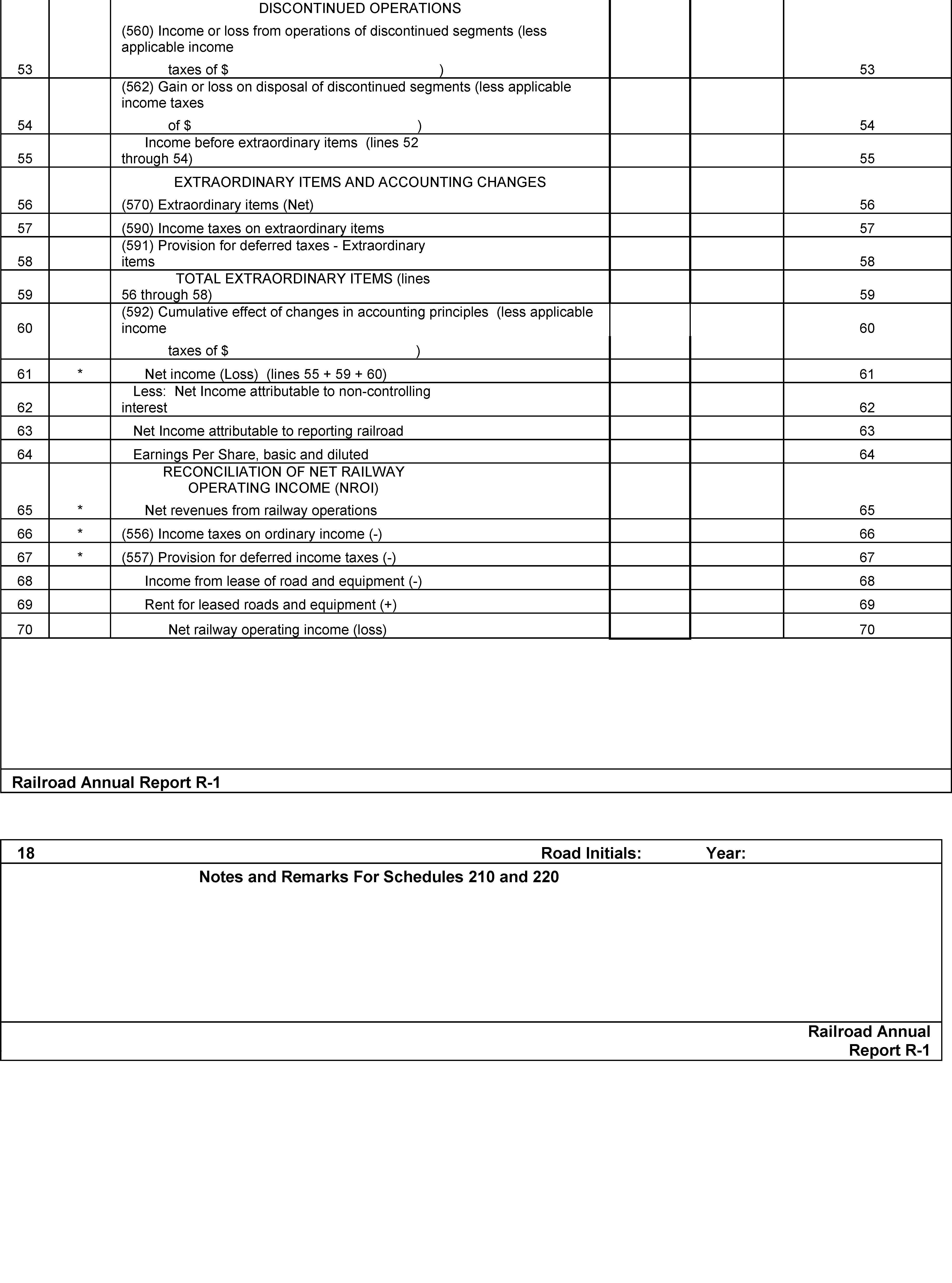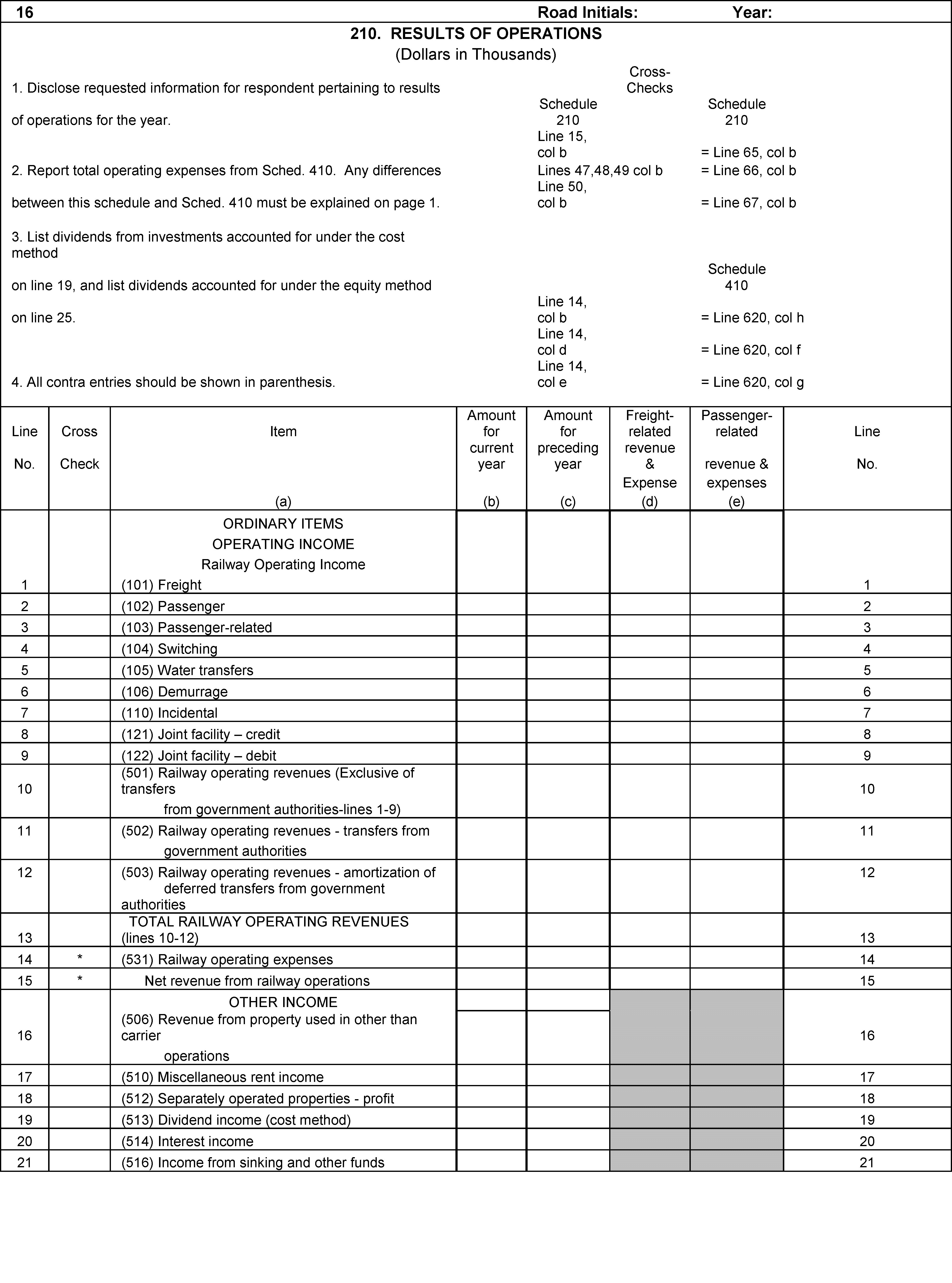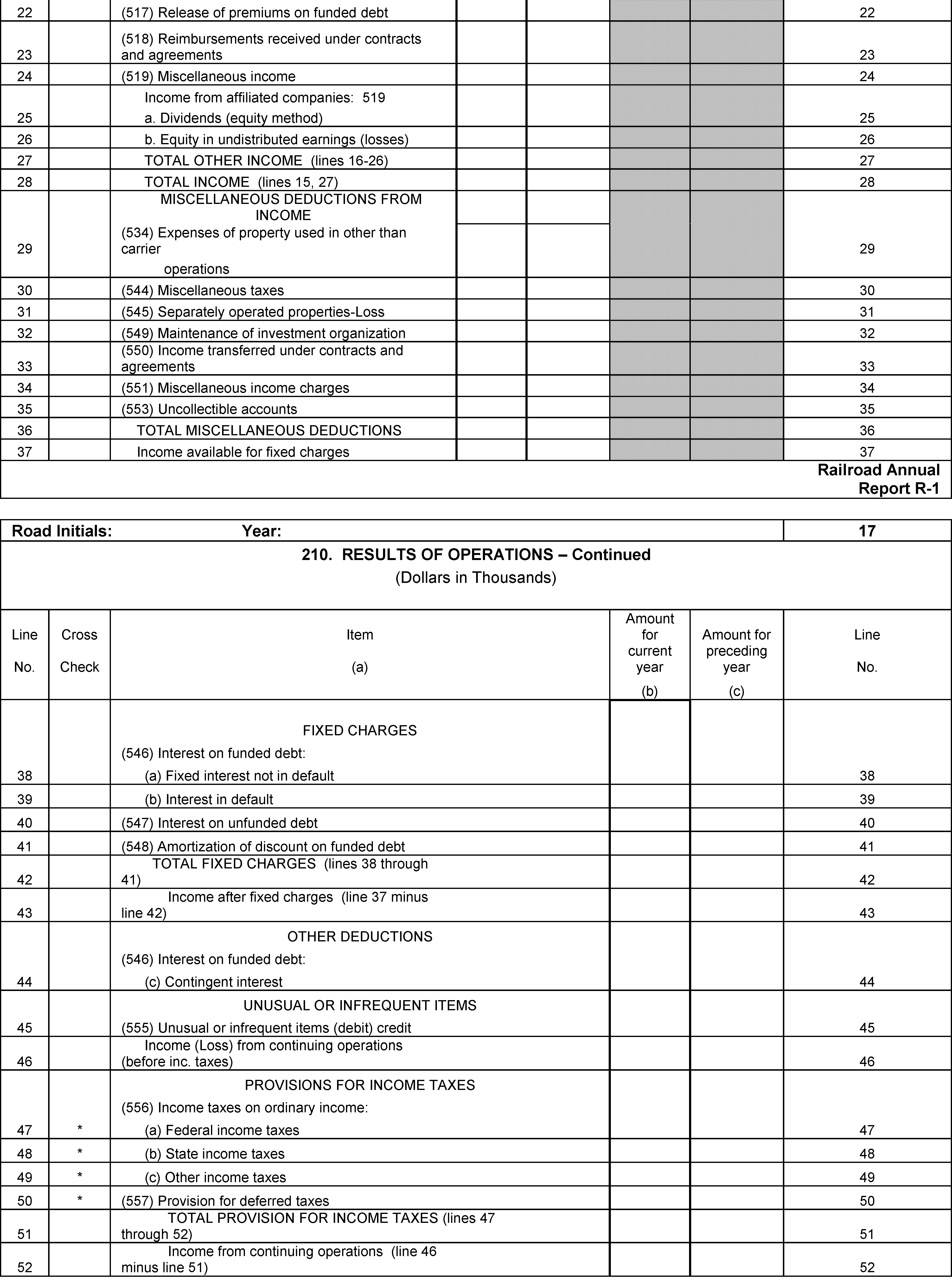 Docket No. EP 712, that the Board make certain changes to either conform Form R-1 schedules to GAAP or otherwise harmonize Form R-1 reporting requirements. In Schedule 210, Results of Operations, AAR suggests that the Board change the description in Line 41 from “Amortization of Discount on Funded Debt,” to “Amortization of Premium or Discount on Funded Debt,” to reflect that premium amortization is included in interest expenses. AAR also suggests removing Line 22 where amortization of premium on funded debt is currently reported. In Schedule 412, Way and Structures, AAR suggests adding a separate line for “Shop Machinery” to reconcile the amortization expenses and depreciation for road accounts required in Schedules 412 and 335, Accumulated Depreciation—Road and Equipment Owned and Used. For Schedule 415, Supporting Schedule—Equipment, AAR proposes that the Board combine owned and capitalized leases in the schedule and eliminate lines pertaining to “Machinery” because, according to AAR, this data is not in or supported by Schedule 410, Equipment Accounts. Finally, for Schedule 755, Railroad Operating Statistics, AAR suggests eliminating Line 89—Caboose Miles—due to the significant reduction in the use of cabooses by reporting rail carriers.