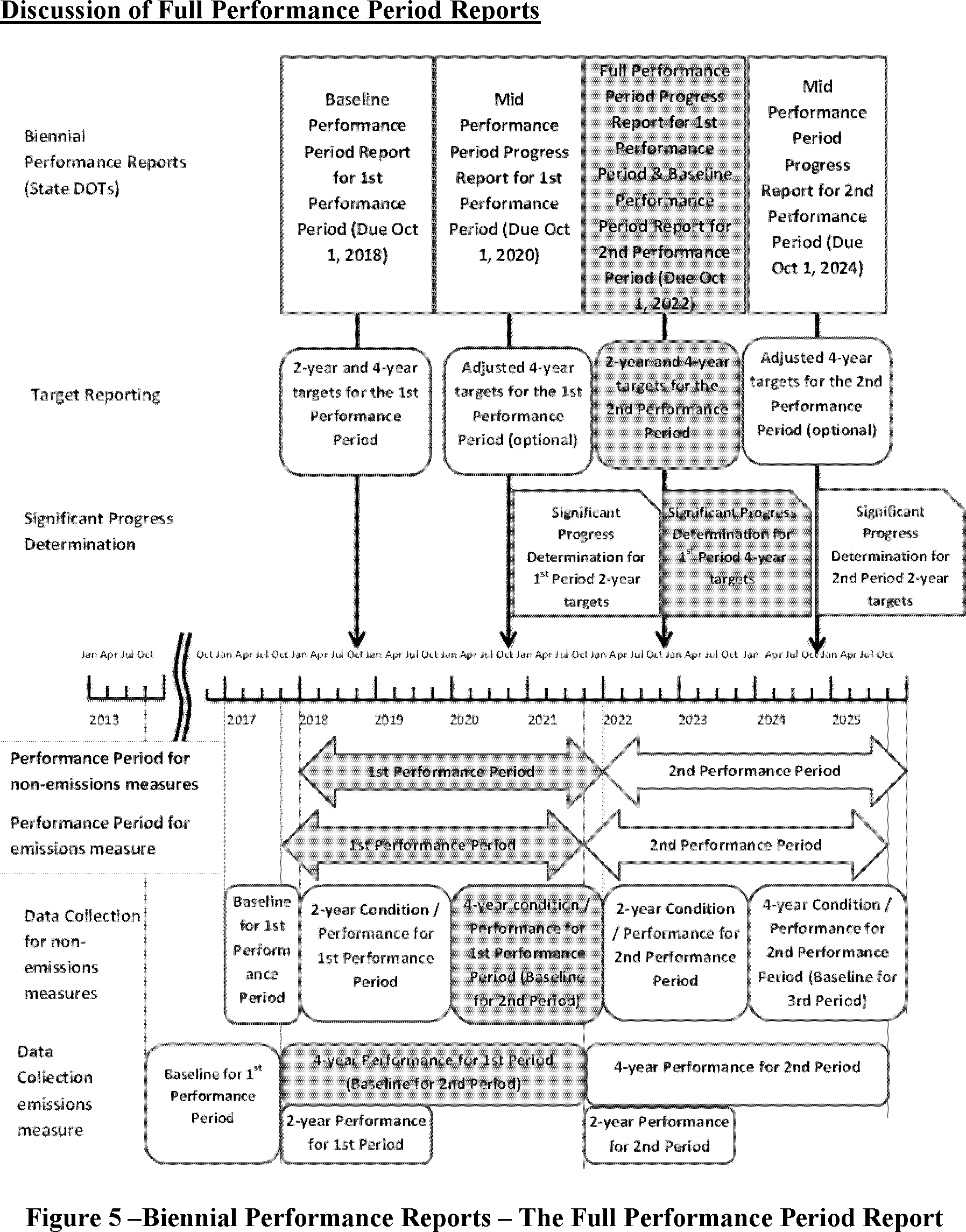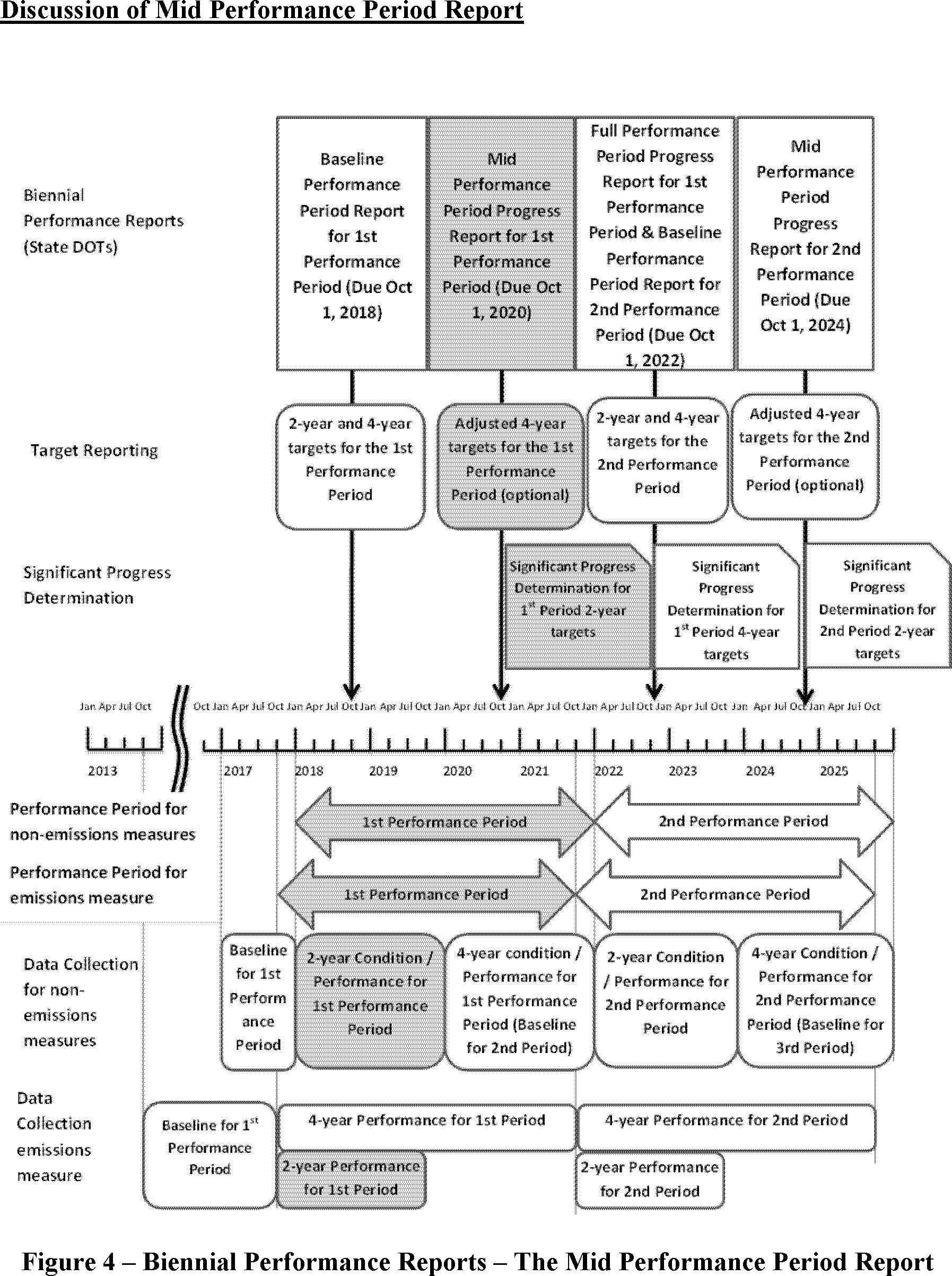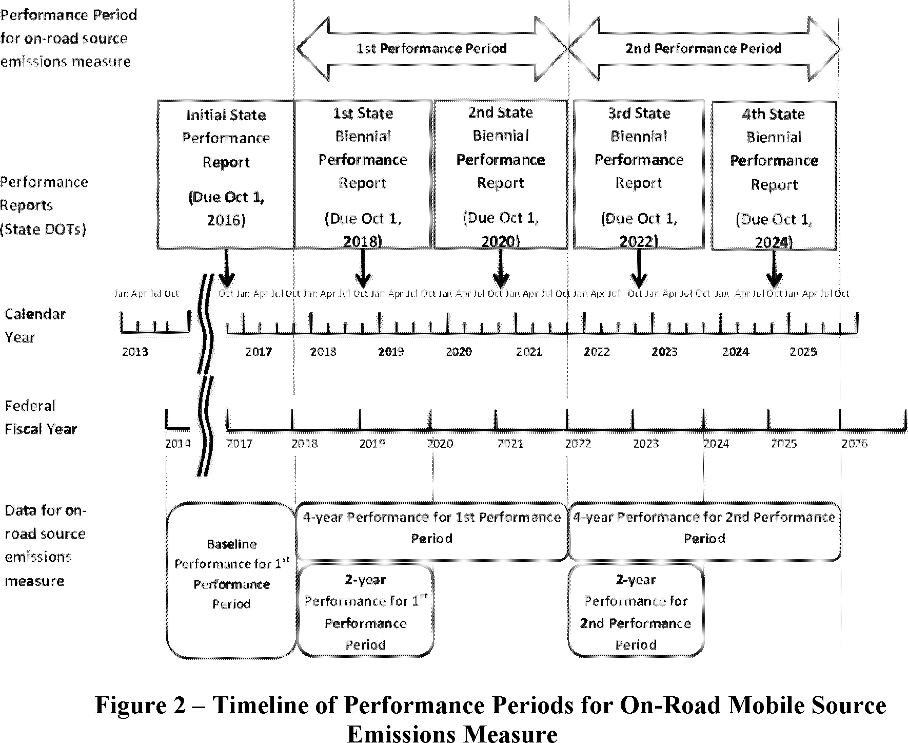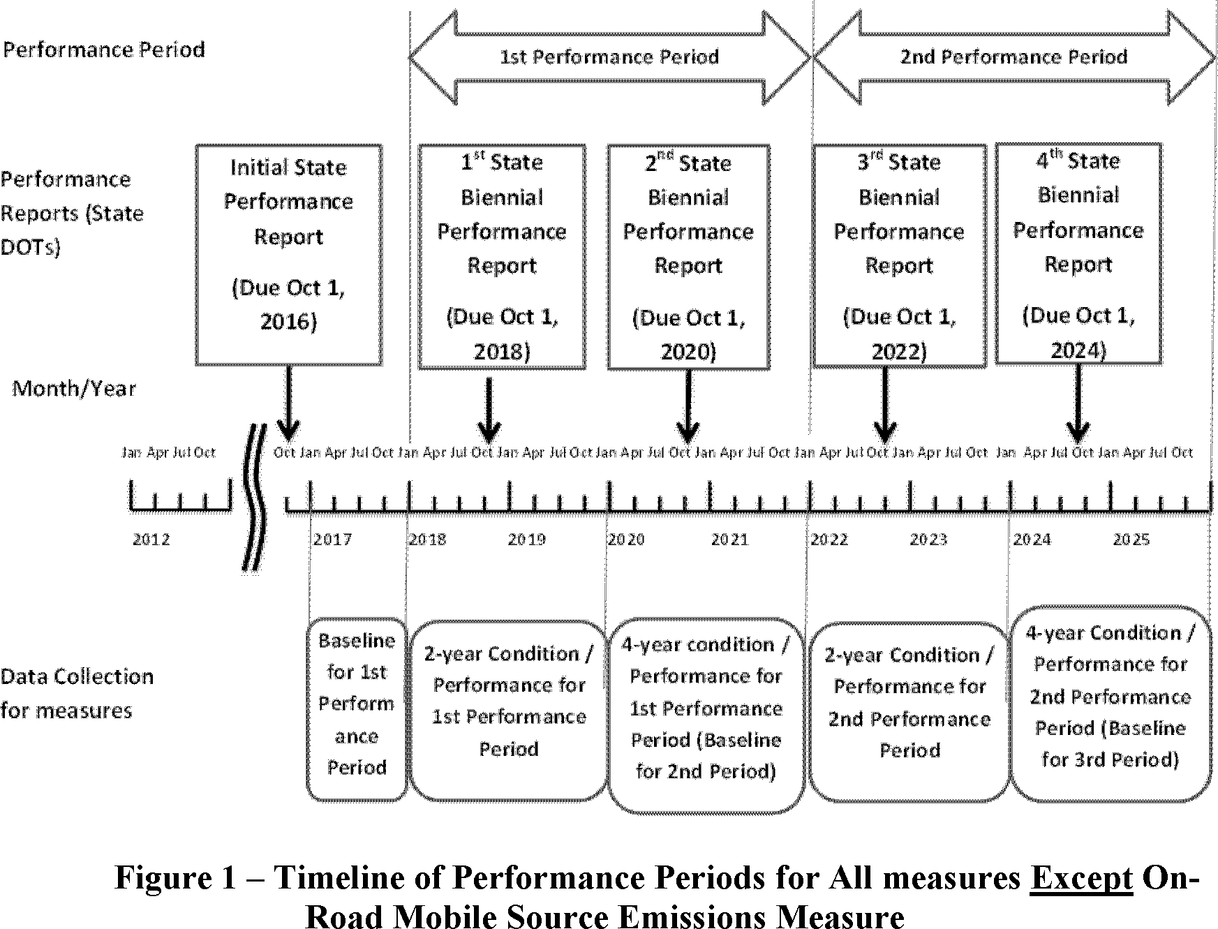 Based on the timing of each individual rulemaking, FHWA would provide additional guidance to stakeholders on how to best integrate the new requirements into their existing processes. Under this approach, FHWA expects that even though the implementation for each rule would occur after each final rule is published, implementation for the second and the third performance measure final rules would ultimately be aligned through a common performance period. In the second performance management measure NPRM, FHWA proposed that the first 4-year performance period would start on January 1, 2016. However, FHWA proposes in this NPRM that the first performance period would begin on January 1, 2018. This would align the performance periods and reporting requirements for the proposed measures in the second and third performance management measure NPRMs. The FHWA has placed on the docket a timeline that illustrates how this transition could be implemented.[3]