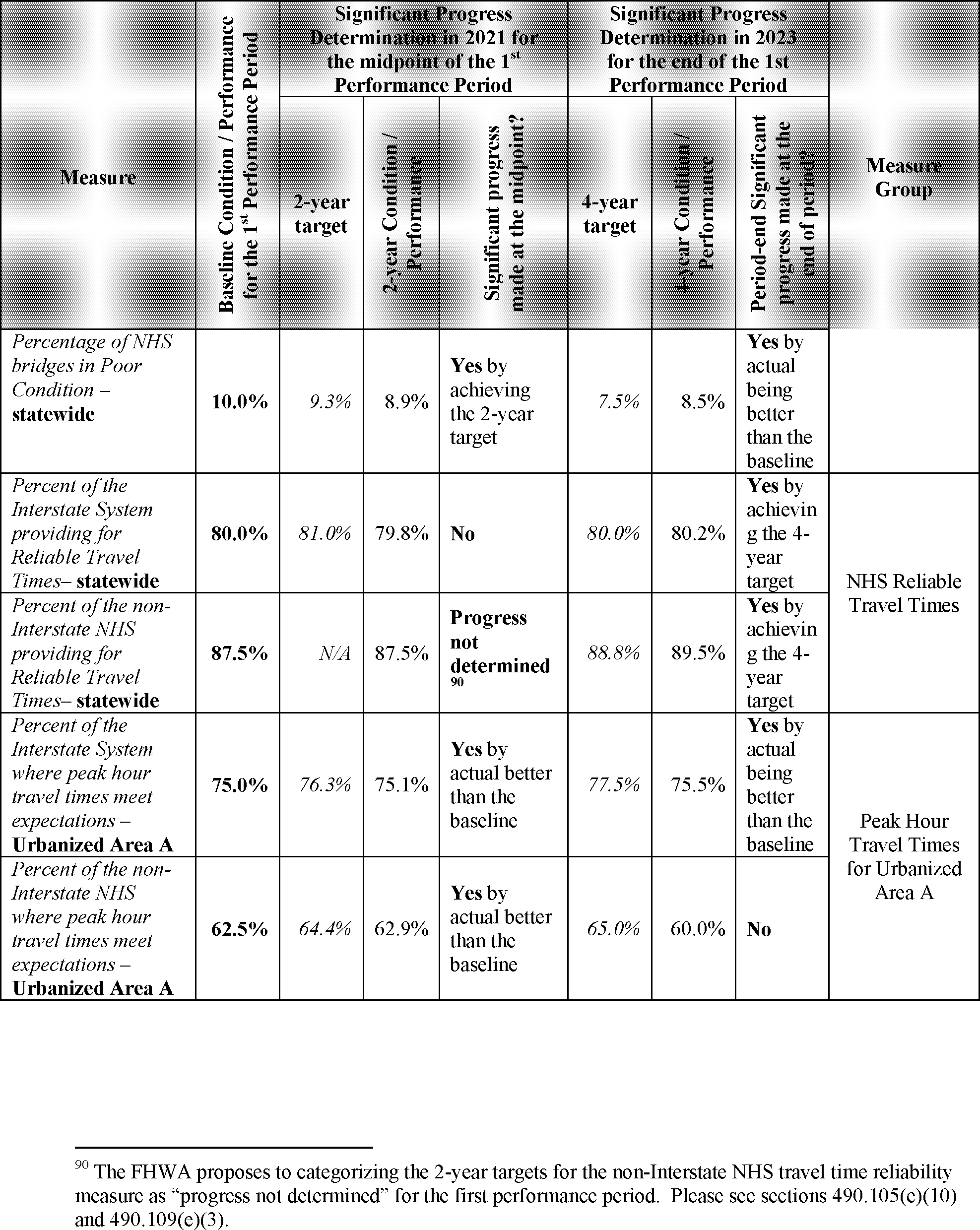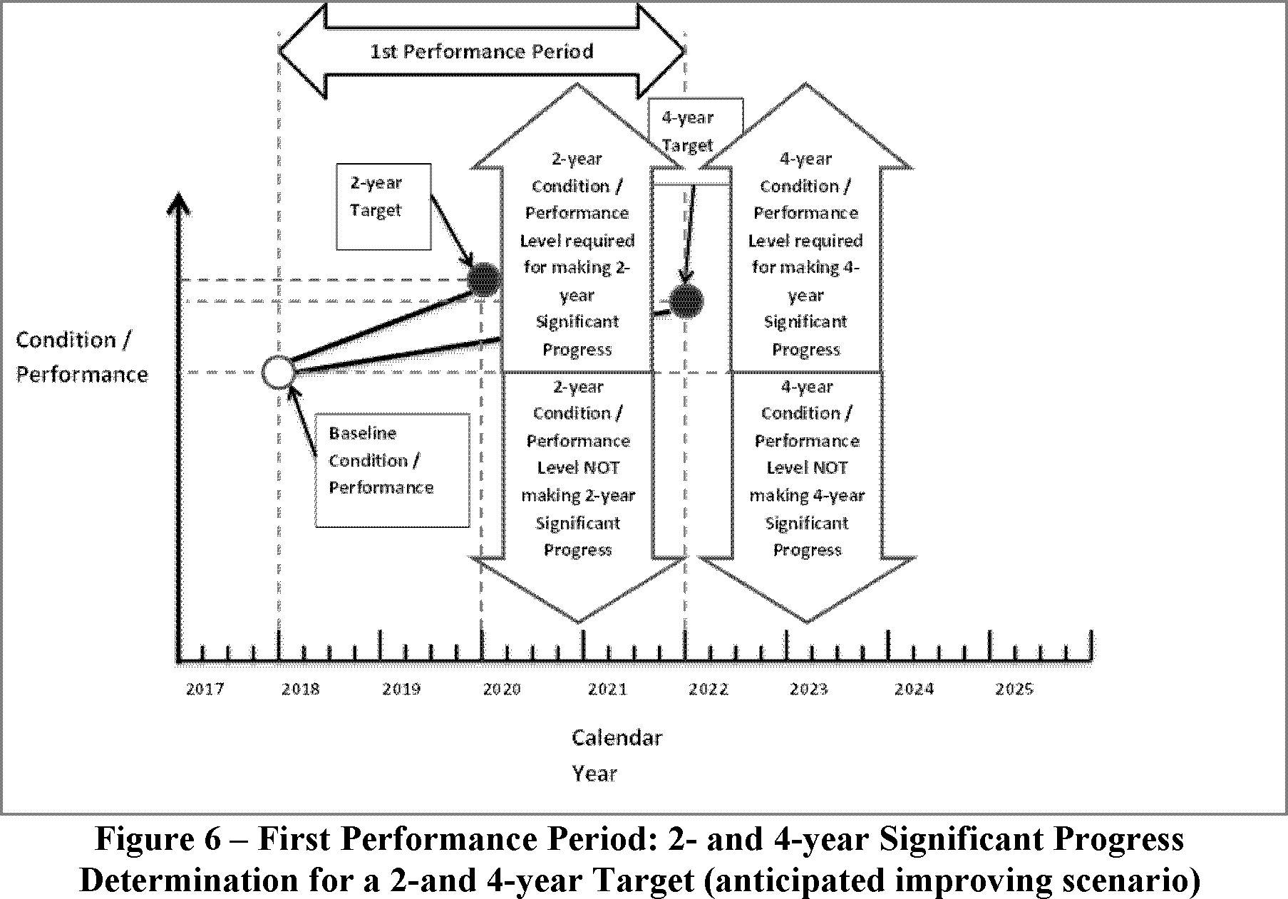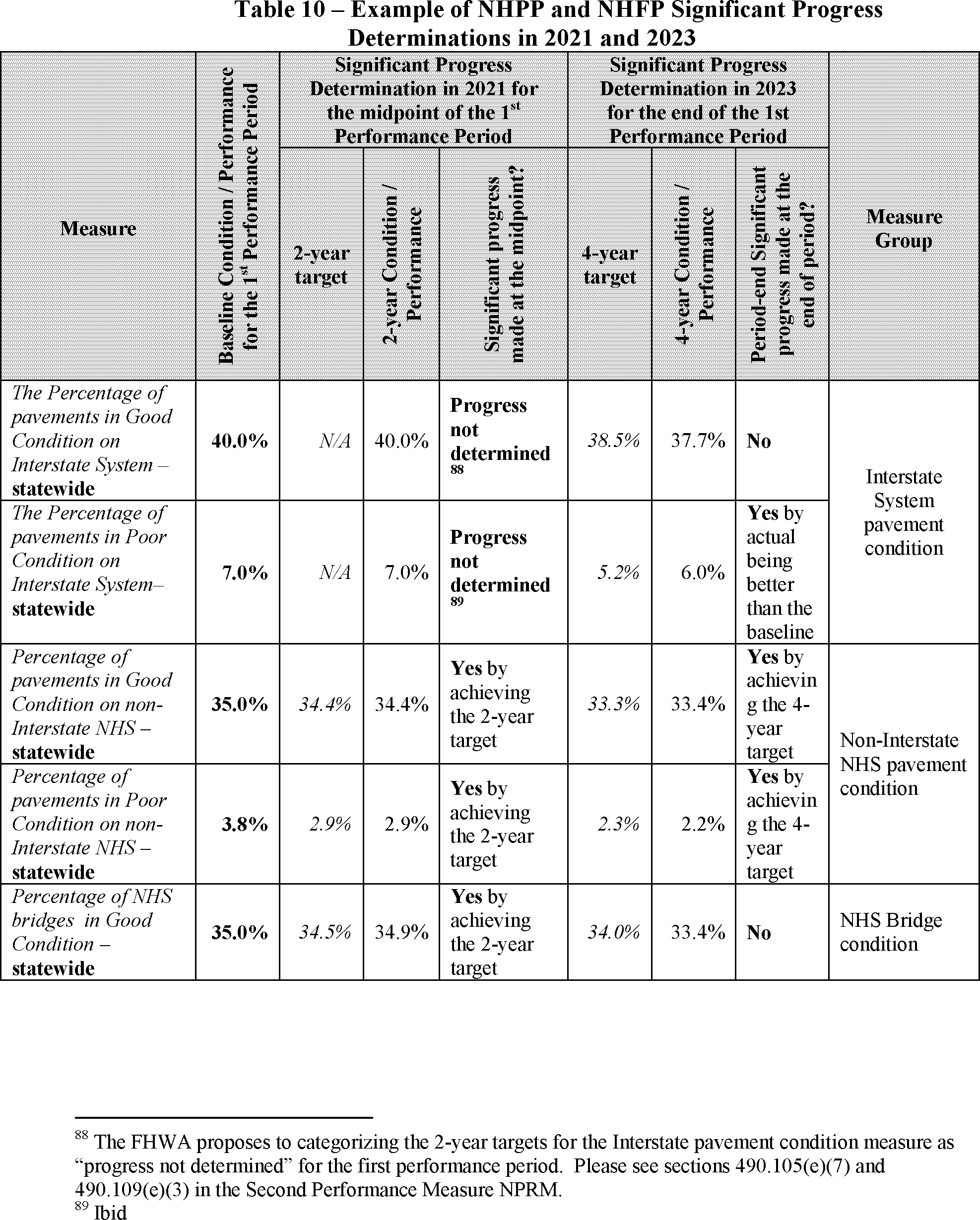 In addition, this NPRM builds on the framework of the previous performance rulemakings and the process proposed for State DOTs and MPOs to establish targets for each of the measures; the methodology to determine whether State DOTs have achieved or made significant progress toward their NHPP or National Highway Freight Program (NHFP) targets (targets for national measures areas 5, 6, 7, 10, 11, and 12, in the above list); and the process for State DOTs to use to report on progress toward achieving their targets.