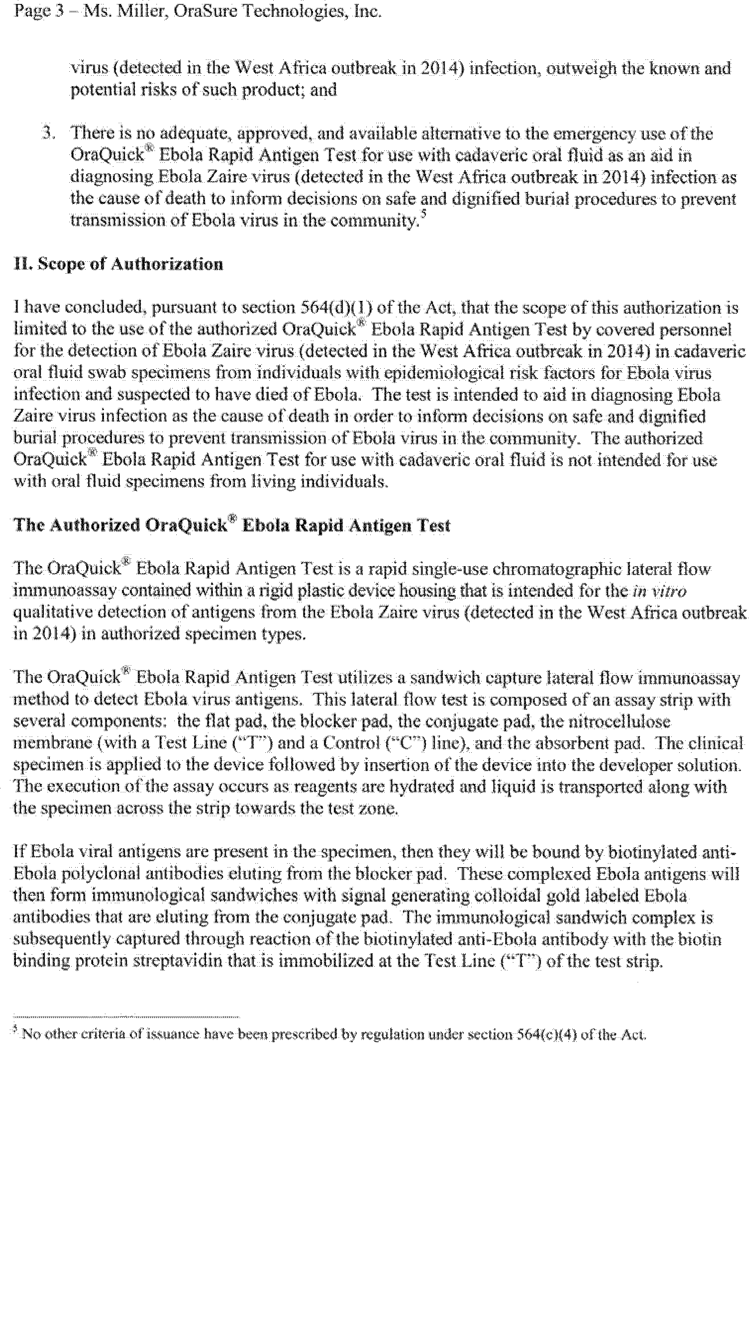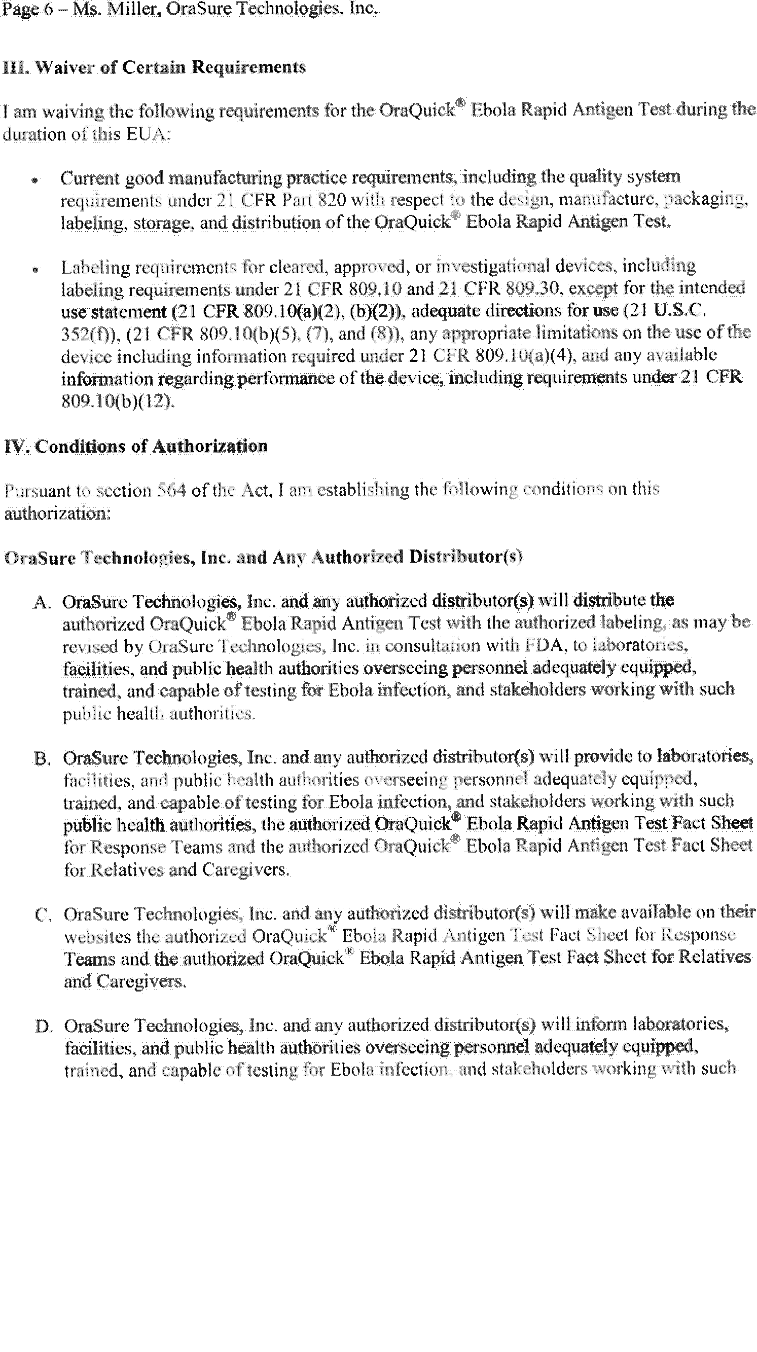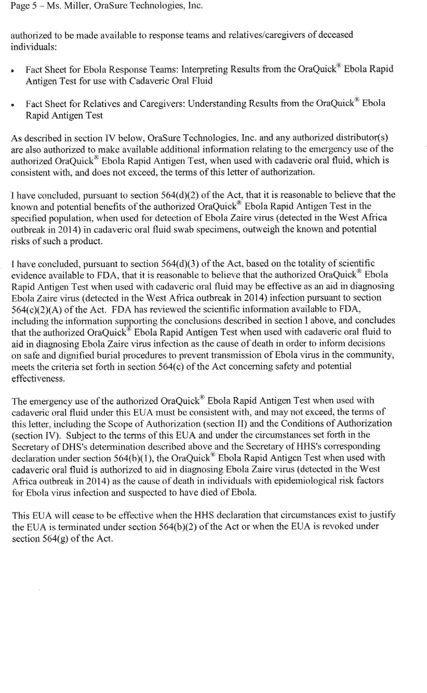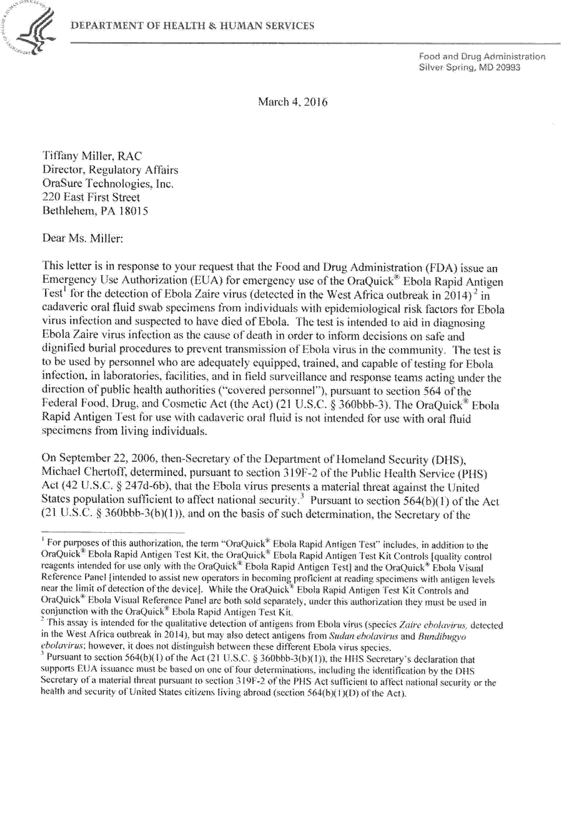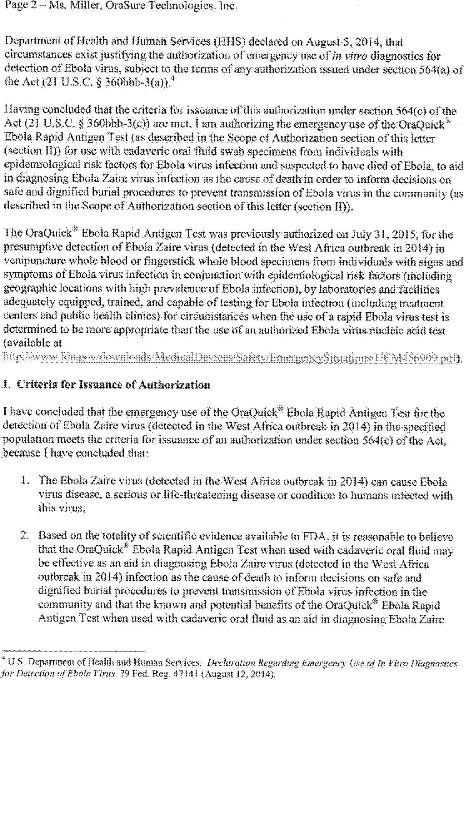 on August 12, 2014 (79 FR 47141). On February 29, 2016, OraSure Technologies, Inc. submitted a complete request for, and on March 4, 2016, FDA issued, an EUA for the OraQuick® Ebola Rapid Antigen Test, subject to the terms of the Authorization.