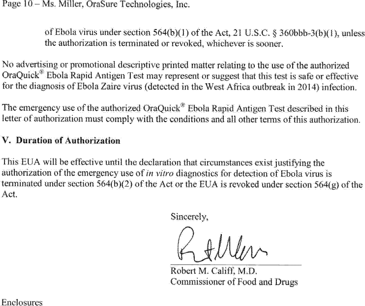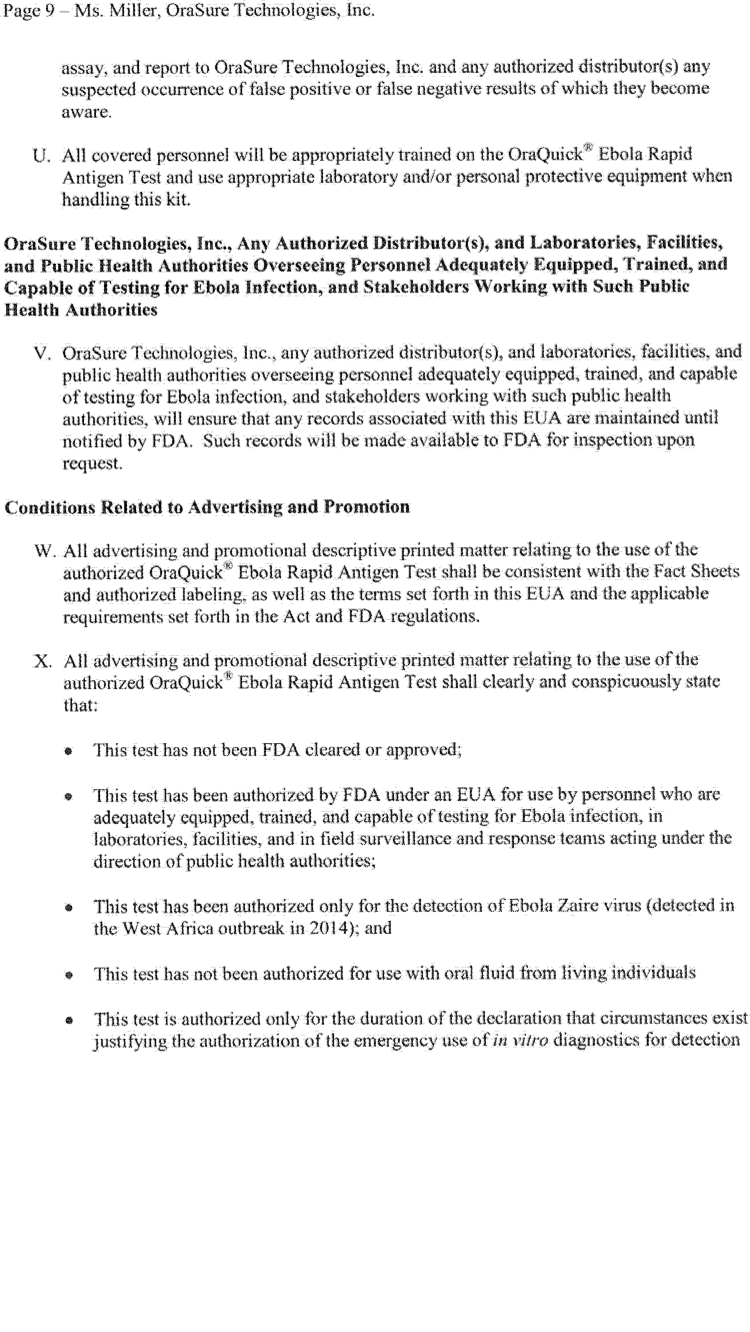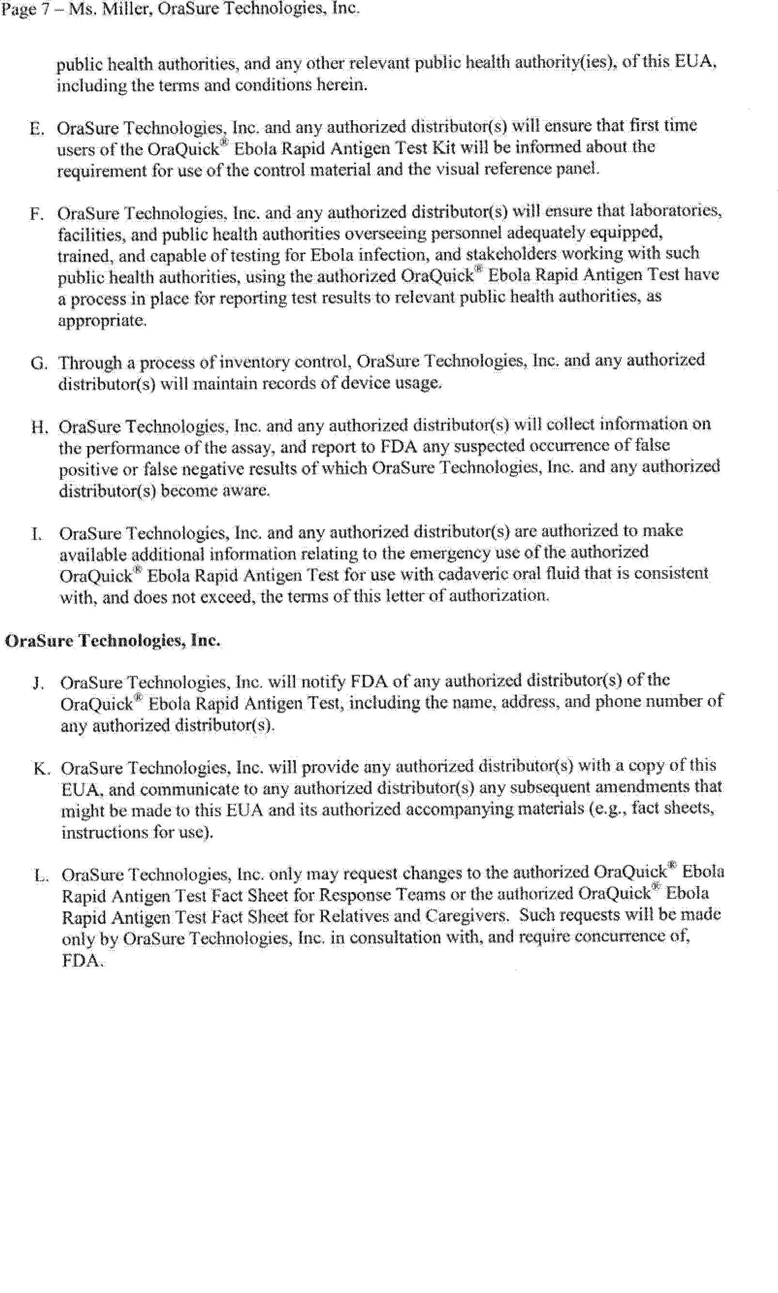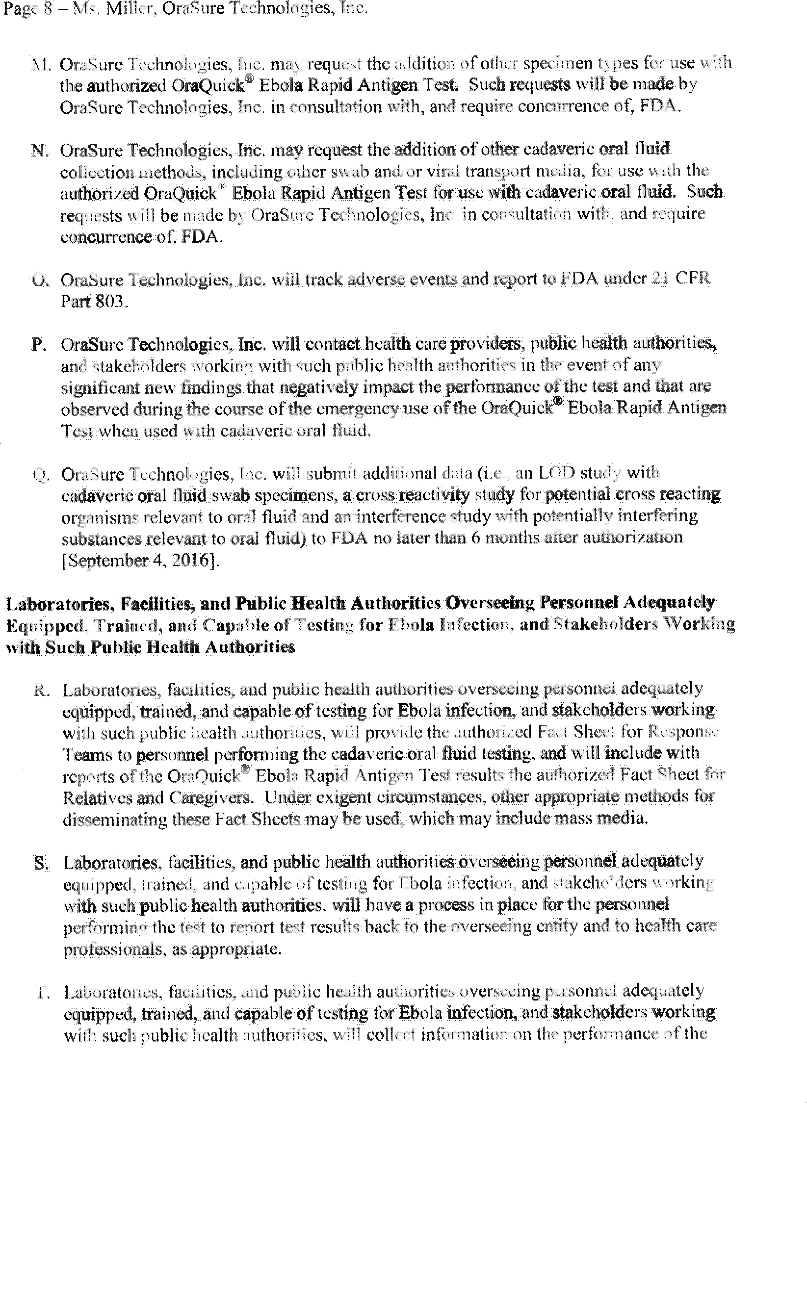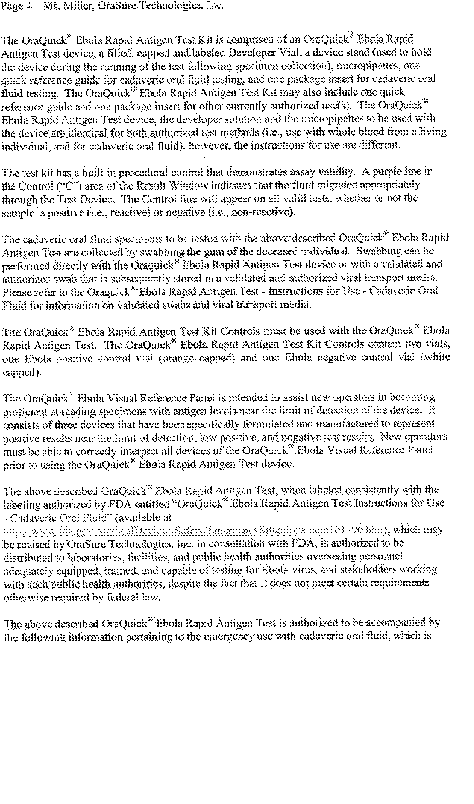 on August 12, 2014 (79 FR 47141). On February 29, 2016, OraSure Technologies, Inc. submitted a complete request for, and on March 4, 2016, FDA issued, an EUA for the OraQuick® Ebola Rapid Antigen Test, subject to the terms of the Authorization.