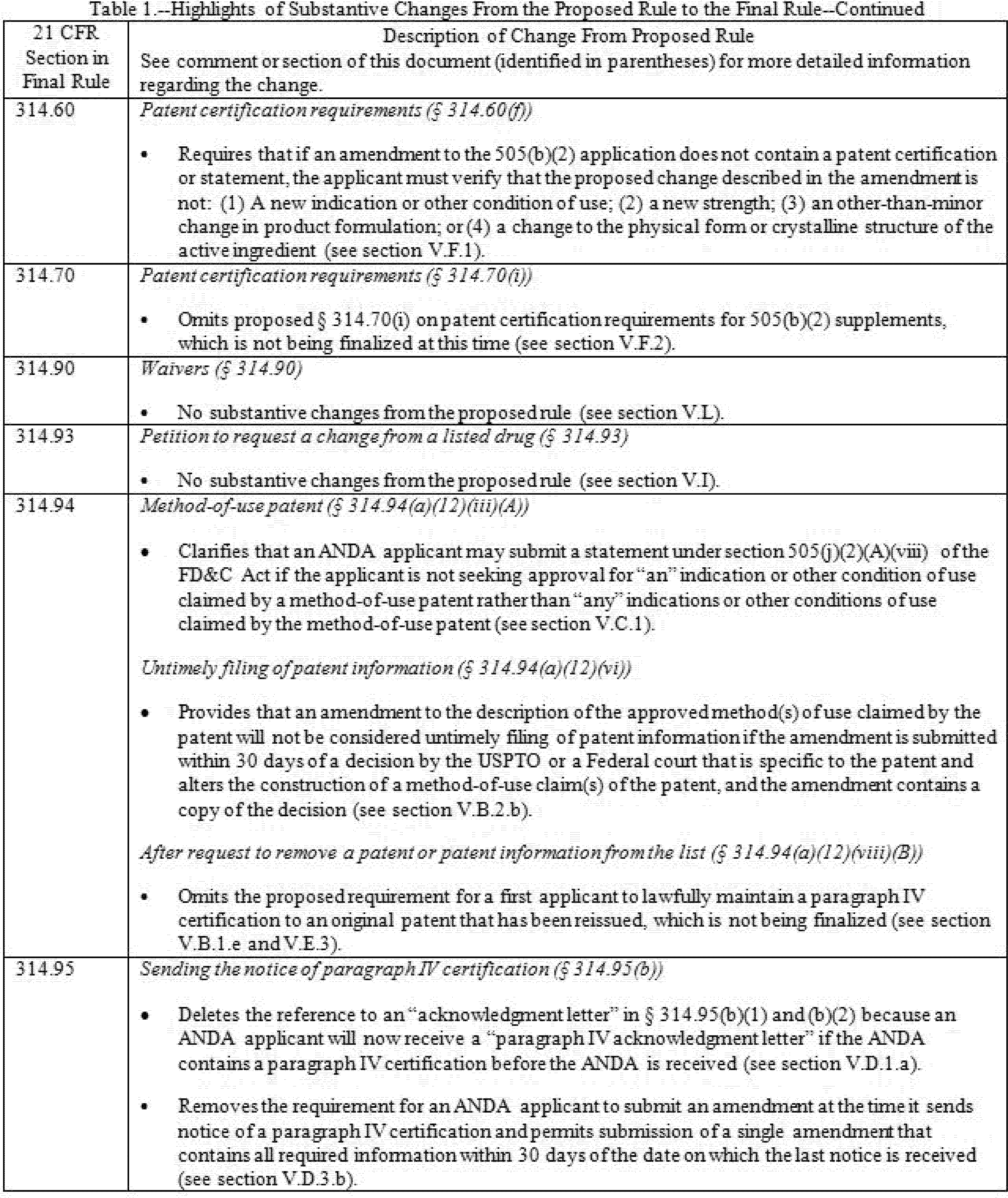 We are expanding the category of untimely filed patent information to include certain amendments to the NDA holder's description of the approved method(s) of use claimed by the patent, if such changes are not submitted: (1) Within 30 days of patent issuance; (2) within 30 days of approval of a corresponding change to product labeling; or (3) within 30 days of a decision by the U.S. Patent and Trademark Office (USPTO) or a Federal court that is specific to the patent and alters the construction of a method-of-use claim(s) of the patent. This revision to our regulations is intended to reduce delays in approval related to overbroad or ambiguous patent use codes.