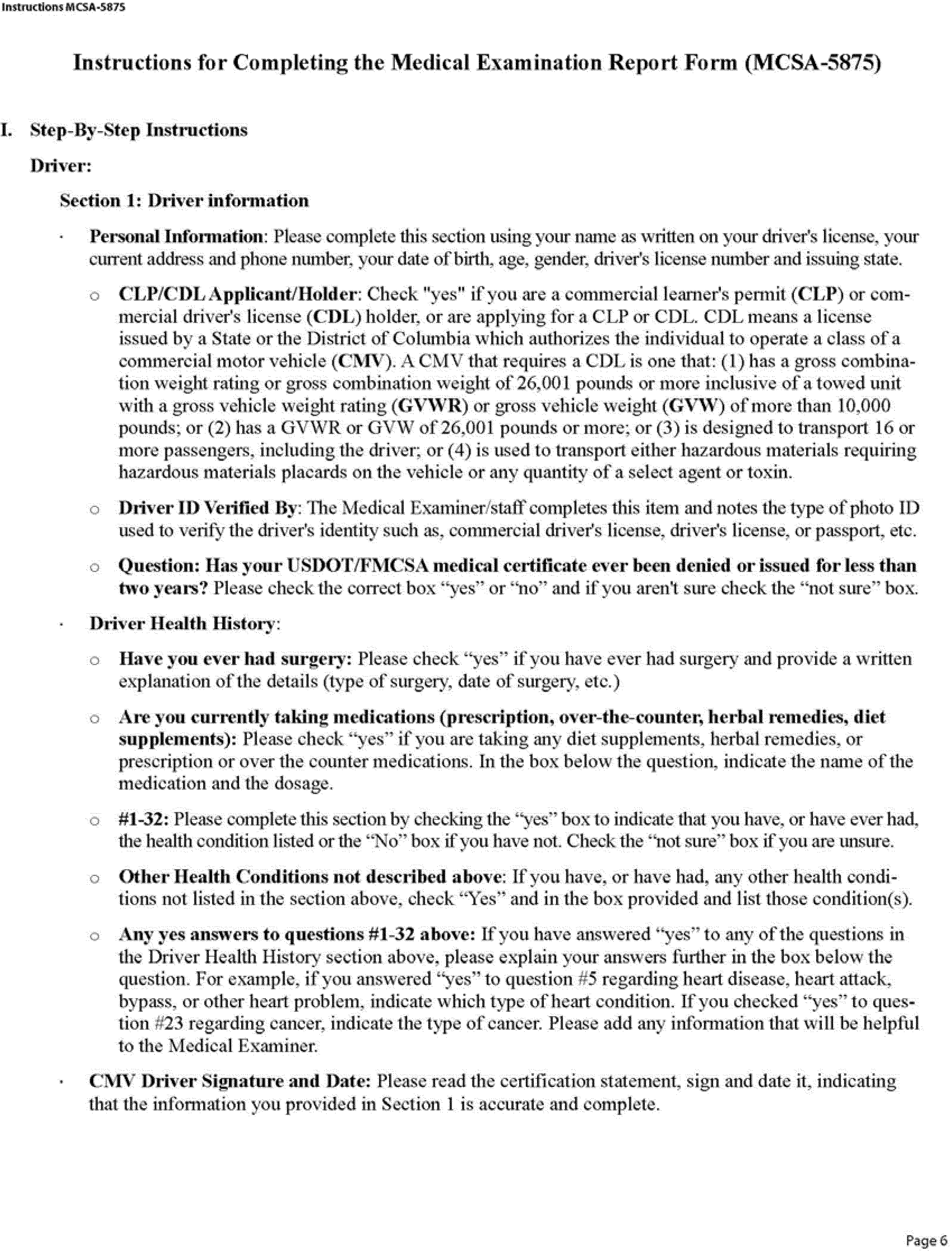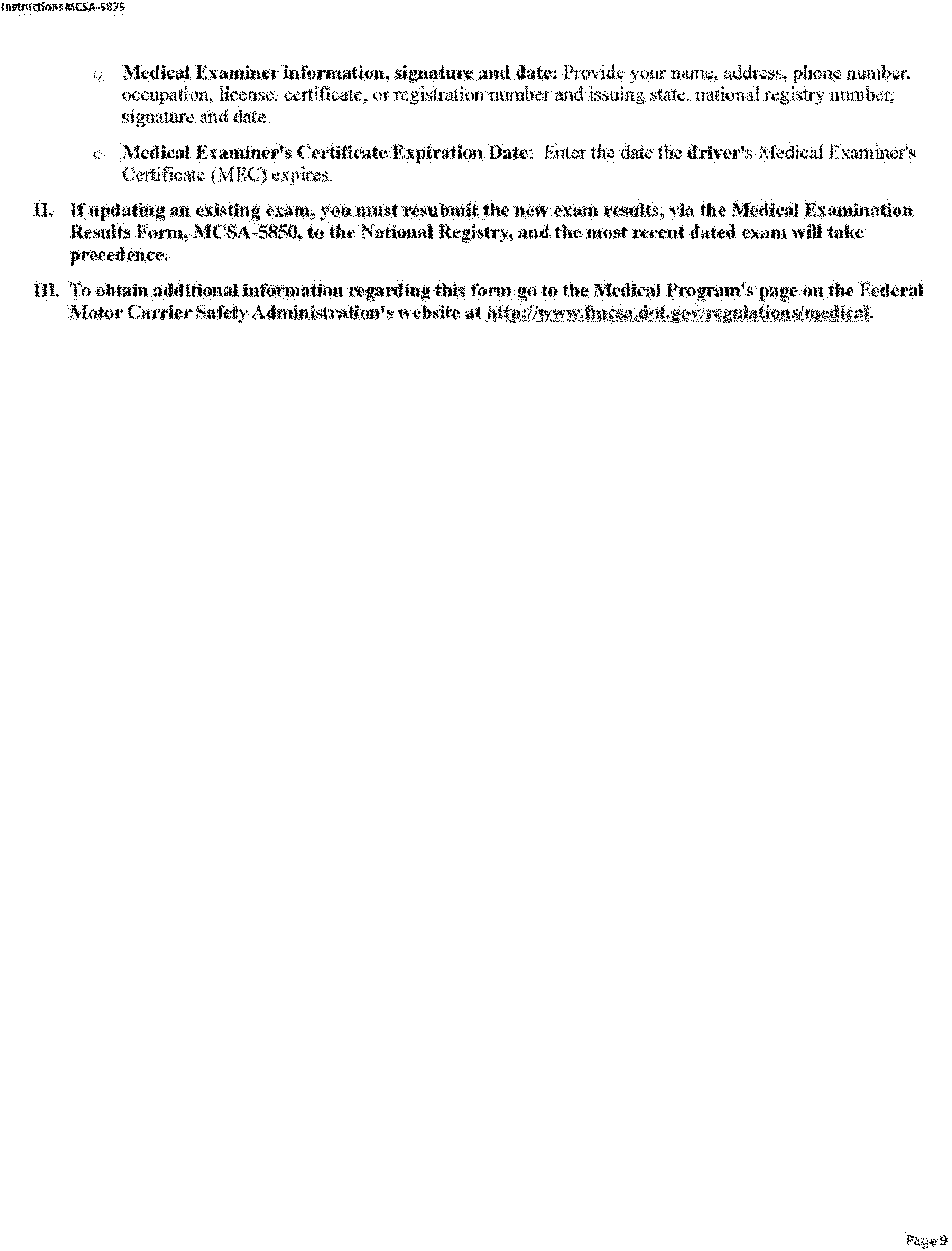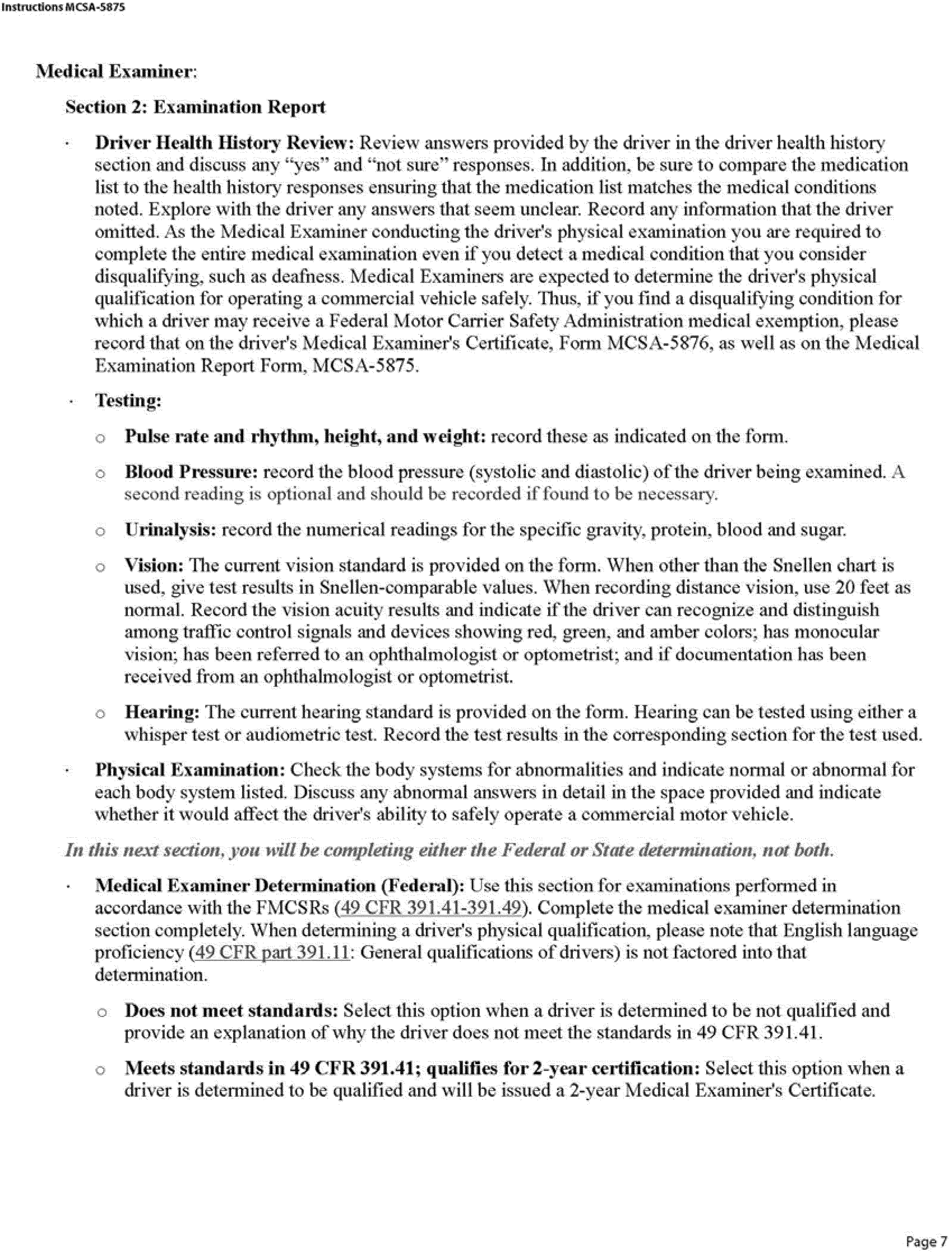 (h) The medical examiner's certificate shall be completed in accordance with the following Form MCSA-5876, Medical Examiner's Certificate: