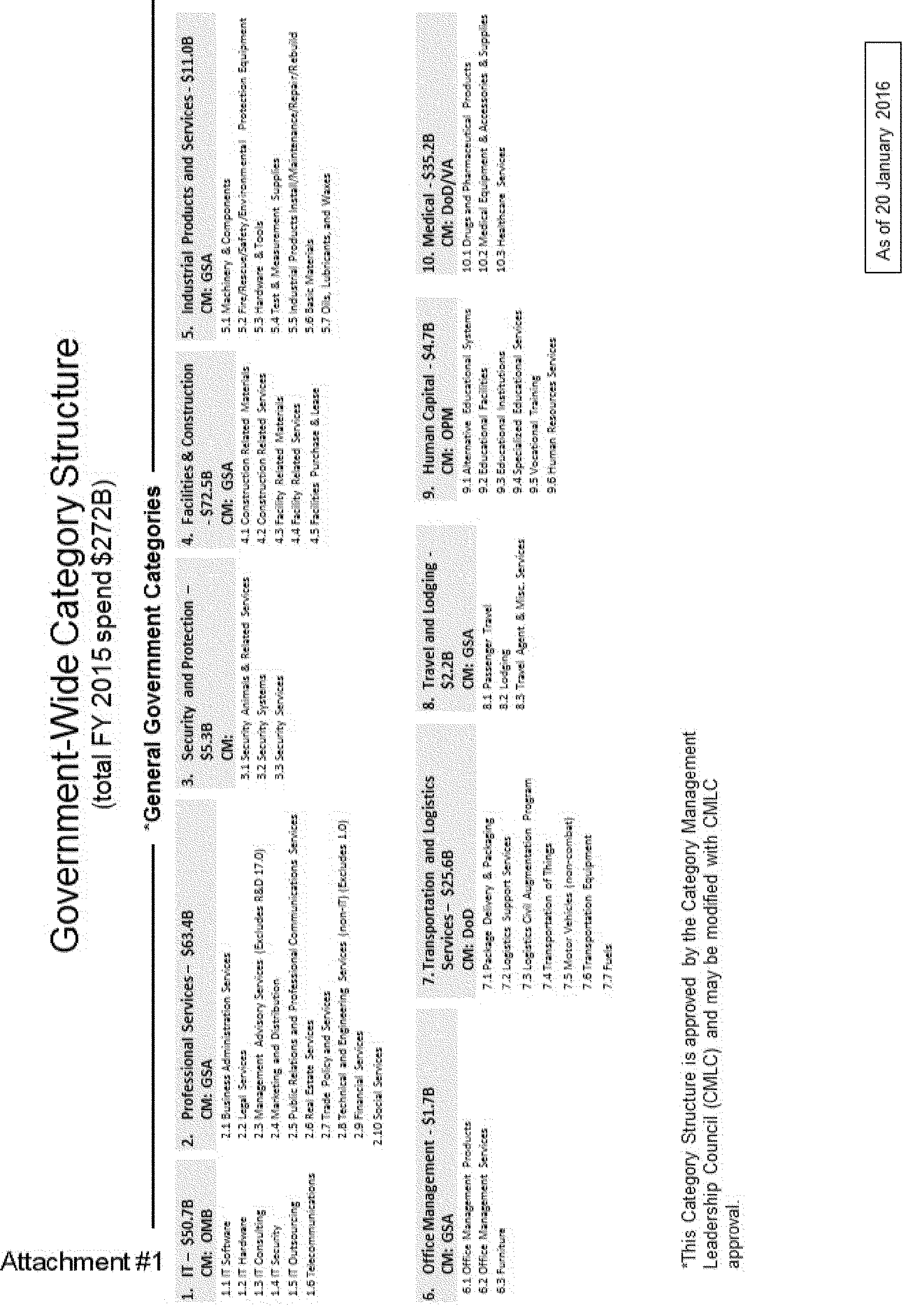 Based on fiscal year 2015 data from the Federal Procurement Data System, agencies spent over $270 billion—over half of all federal contract spending—on common requirements like information technology (IT) hardware, office supplies, and other basic needs. As further detailed in Attachment 1, the ten core (Level 1) categories are shown below. The acquisition and management of requirements in these ten CM categories are subject to this Circular. This Circular does not address unique, agency/mission-specific requirements determined by the appropriate agency leadership to fall outside the scope of this directive. OMB category-specific policies (CM policies) will include instructions for making these determinations, as category strategies are developed (see section 8(a) below). The CMLC will approve significant changes to the scope, leadership, or definition of the core categories (to include adding, deleting, or restructuring categories) and update the categories as needed. The most current list is available on the Acquisition Gateway.[8]