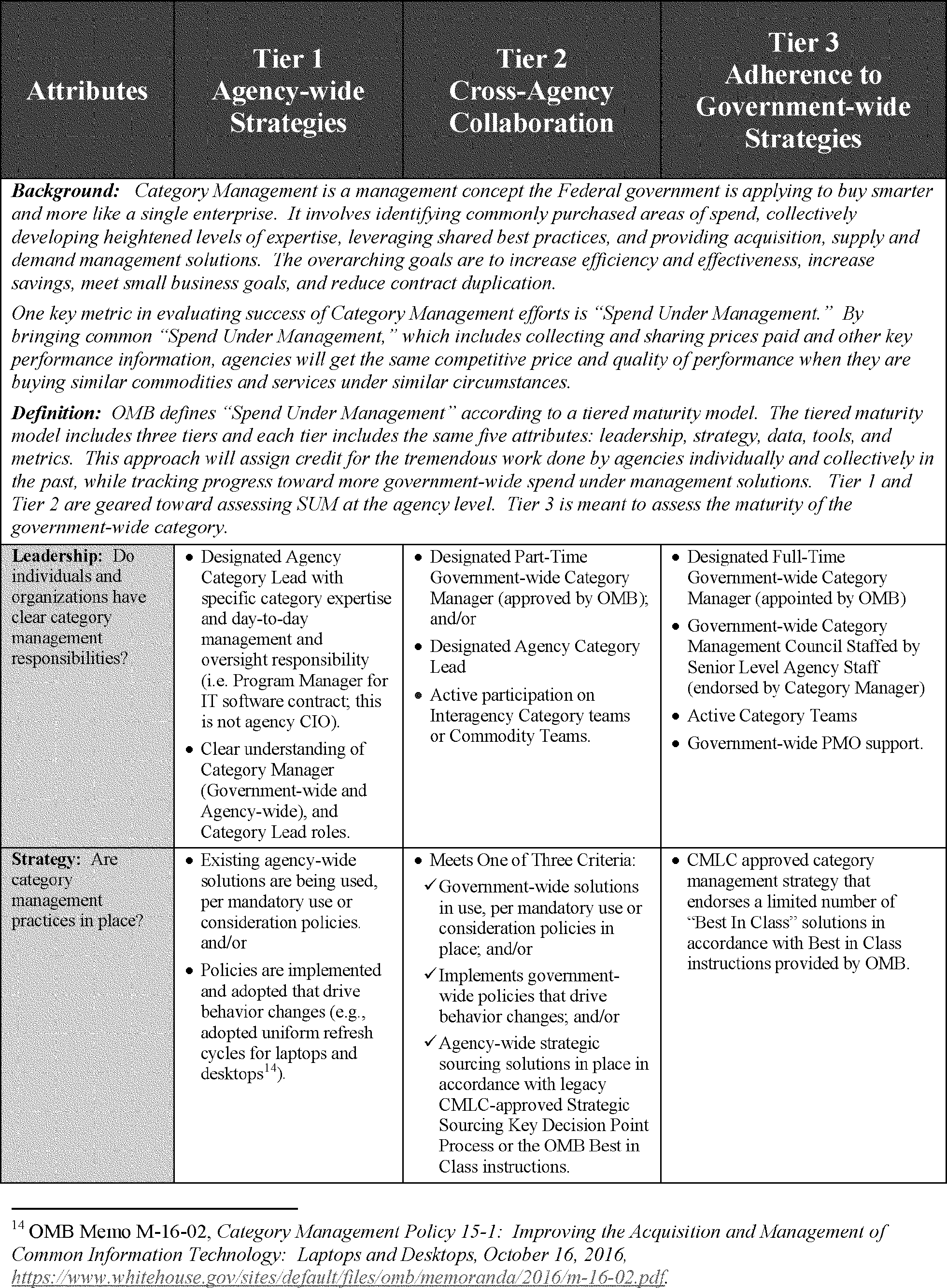 The SUM model provides an assessment of CM maturity for each of the ten Government-wide categories and the CFO Act Federal Agencies using a three-tiered maturity model that evaluates CM against five attributes: Leadership, strategy, data, tools, and metrics (reference attachment 3). As the government gains experience, the model will be updated and made available on the Acquisition Gateway, as needed.
