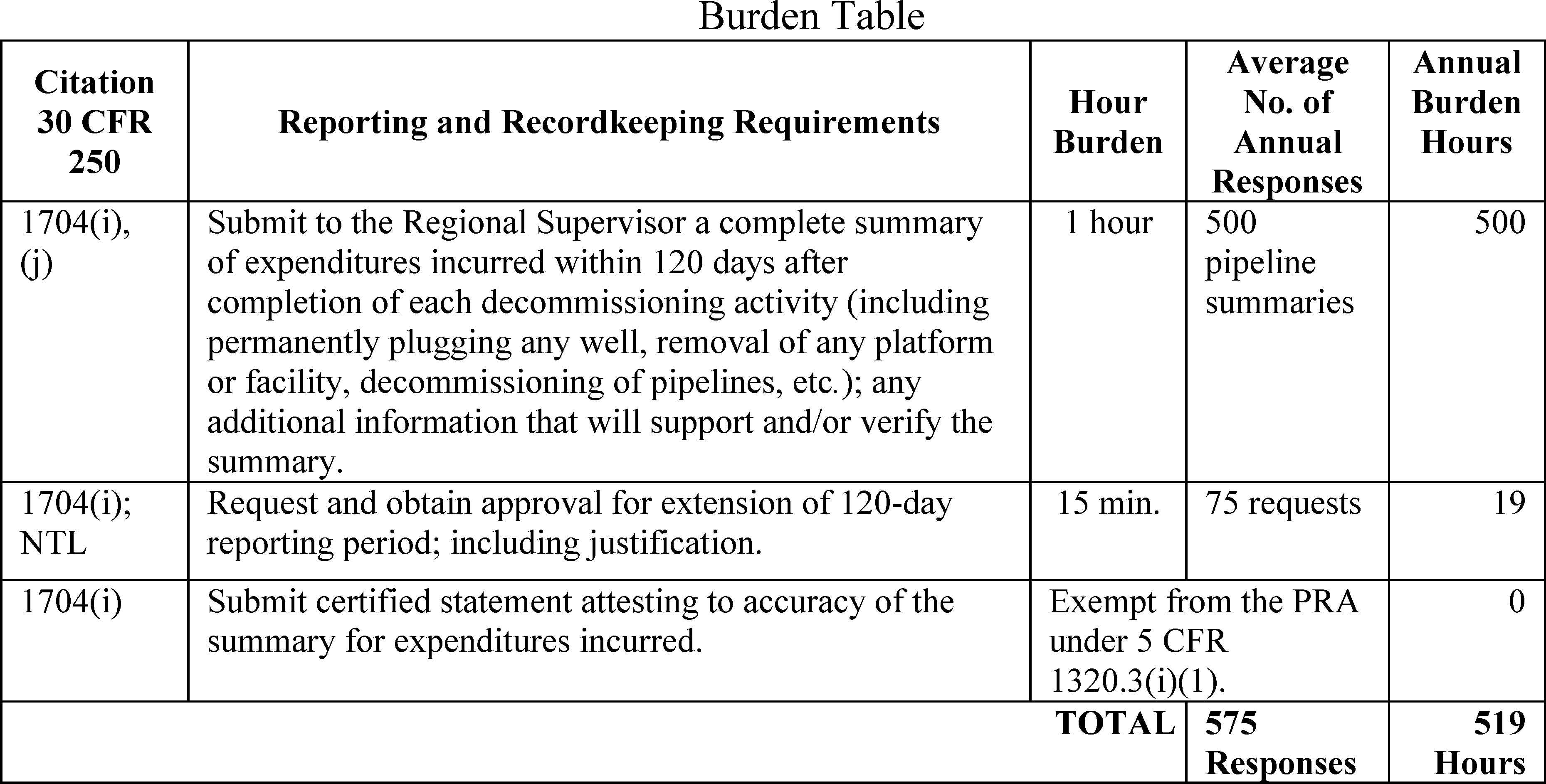 BSEE did not include reporting of expenditures for pipeline decommissioning in the December 2015 final rule because the 2009 proposed rule did not expressly refer to pipeline decommissioning expenditures. BSEE has determined, however, that accurate information about expenditures incurred for pipeline decommissioning activities is needed to better estimate future decommissioning costs for those activities.