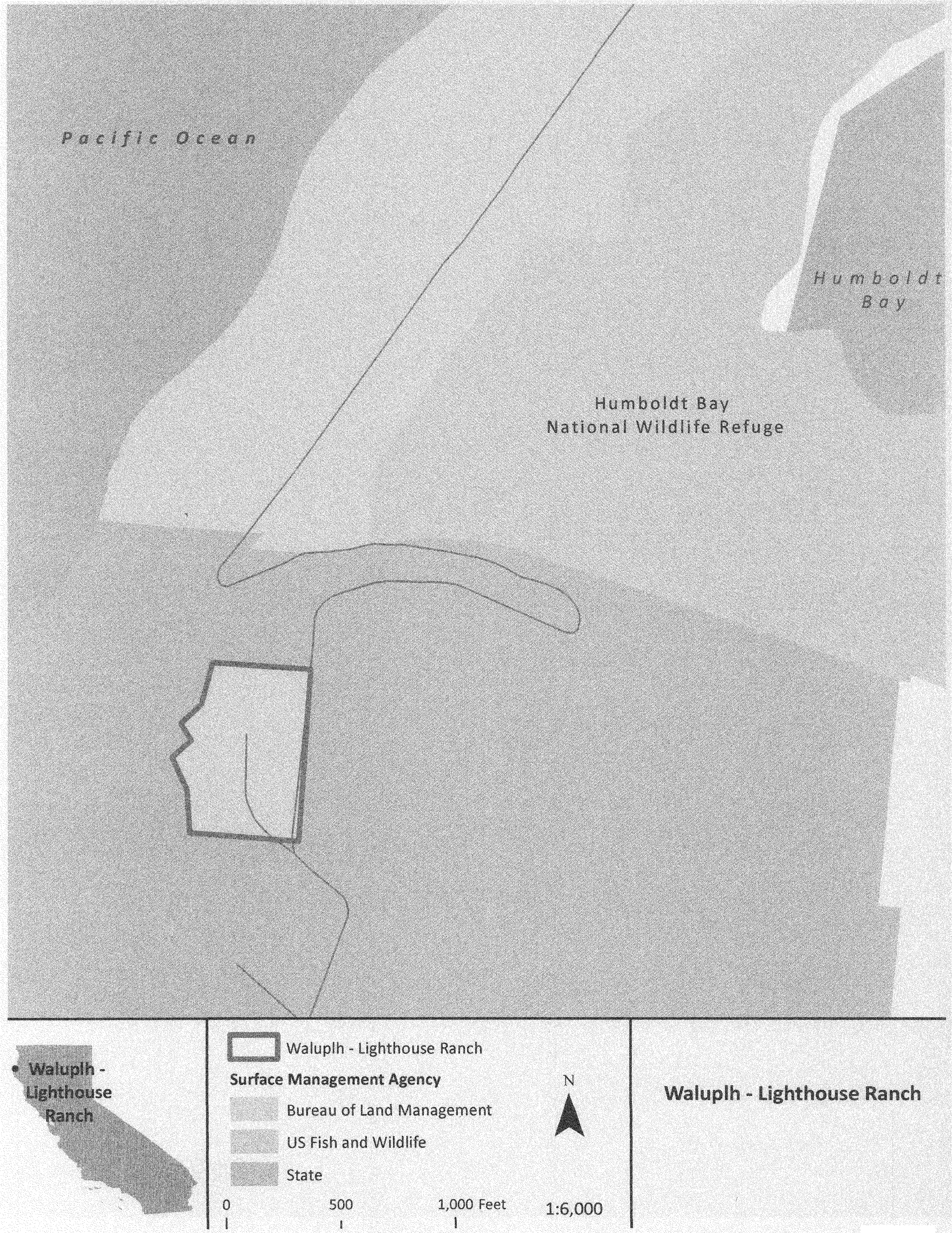 ( printed page 6132)Perched on the edge of Table Bluff, 12 miles south of Eureka, Waluplh-Lighthouse Ranch has spectacular panoramic views of the Pacific Ocean, Eel River Delta, and the south spit of Humboldt Bay. In addition to outstanding scenery, visitors to Waluplh-Lighthouse Ranch can view migratory raptors, songbirds, and the endangered marbled murrelet.