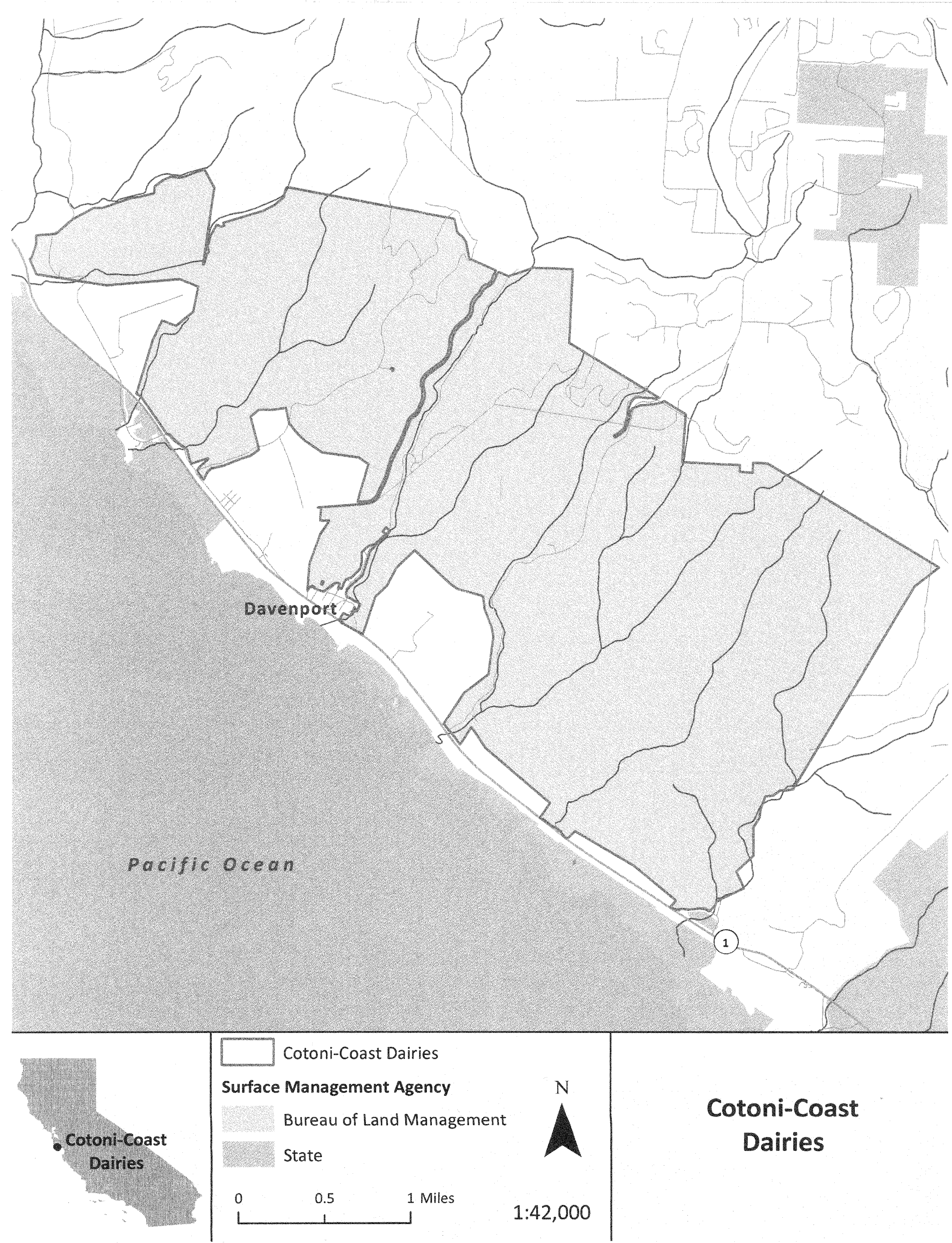 Near Davenport in Santa Cruz County, Cotoni-Coast Dairies extends from the steep slopes of the Santa Cruz Mountains to the marine coastal terraces overlooking the Pacific Ocean. Sitting atop the soft Santa Cruz Mudstone ( printed page 6133) Formation and the hard, silica-rich Monterey Formation, the area's bedrock supports a diversity of soils and vegetation that have sustained wildlife and people alike for millennia.