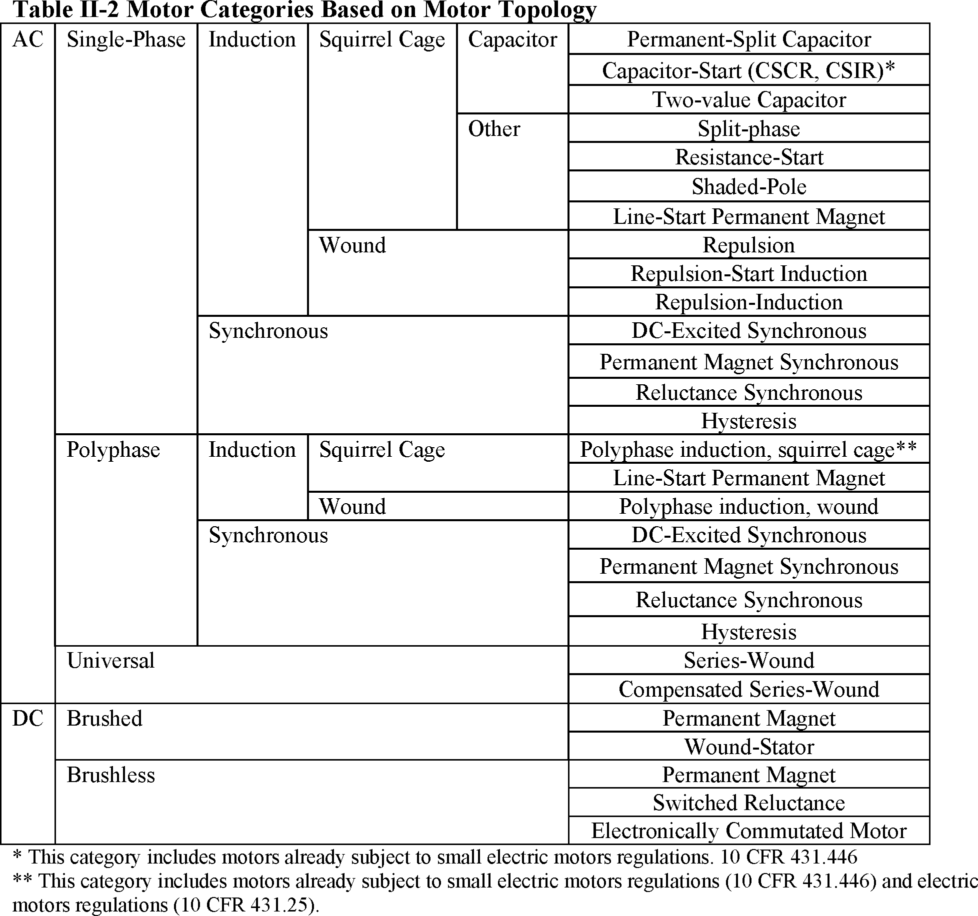 Based on the existing definitions discussed above, Table II-1 lists the motor categories, by horsepower and frame size, that may be considered for test procedures in any rulemaking. Frame size is not used as a limiting factor except in the case of polyphase motors for purposes of preventing overlap with the electric motors regulations listed at 10 CFR 431.25. The final list of motors subject to test procedures may be more limited than Table II-1 based on properties other than horsepower and frame size, as discussed later in this section.