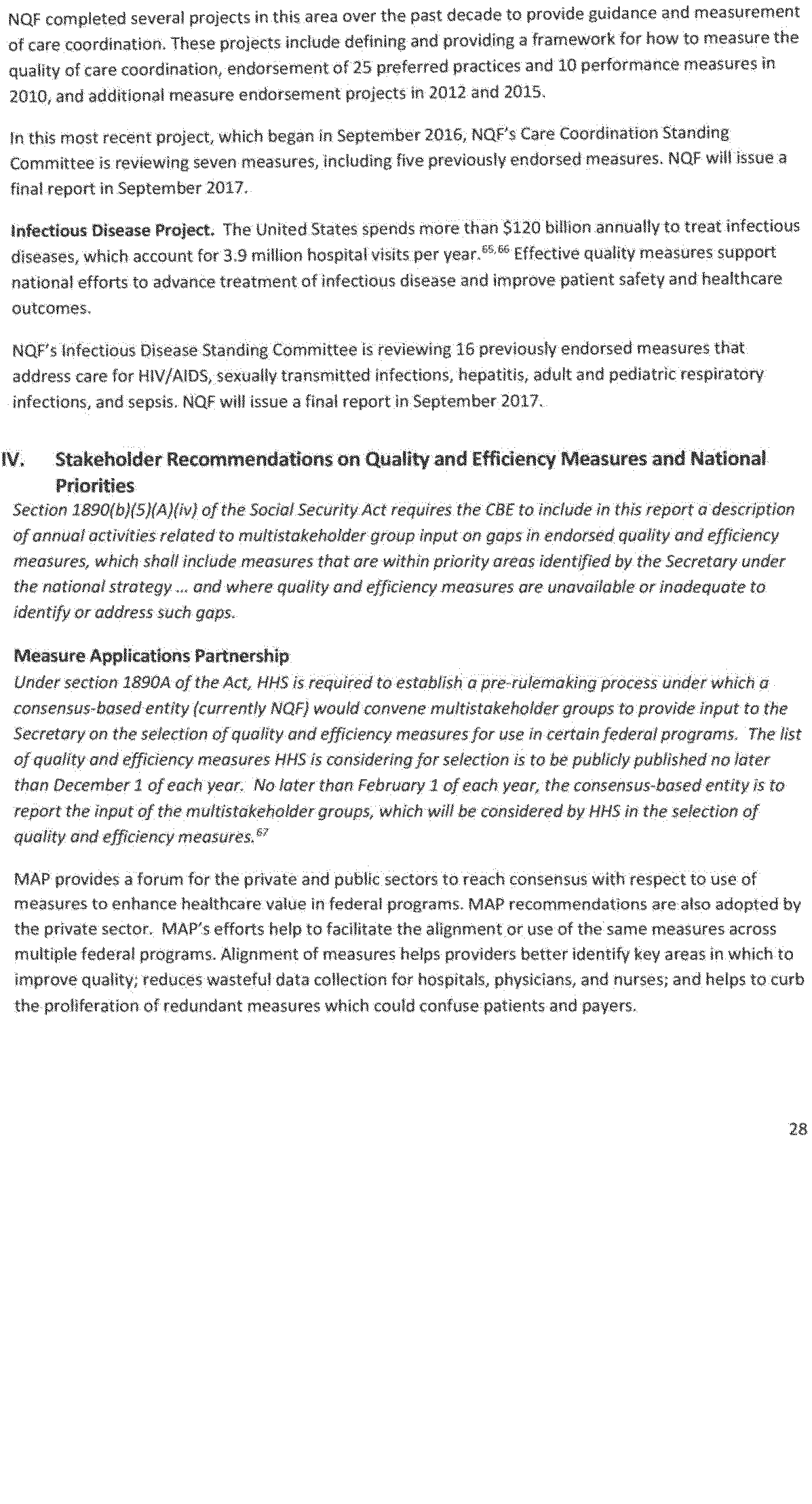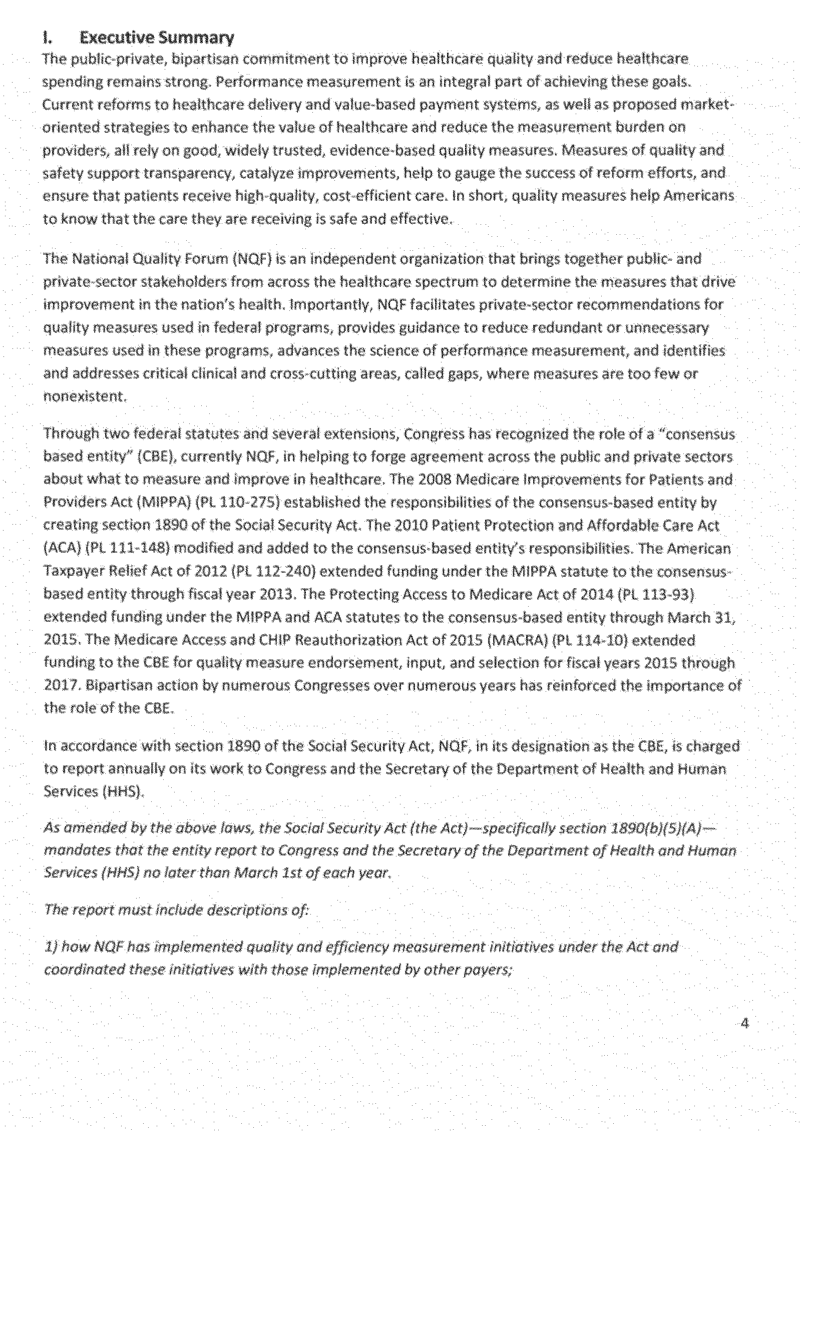 The Secretary of the Department of Health and Human Services (the Secretary) has long recognized that a high functioning health care system that provides higher quality care requires accurate, valid, and reliable measurement of quality and efficiency. Section 1890(a) of the Social Security Act (the Act), as added by section 183(a)(1) of the Medicare Improvements for Patients and Providers Act of 2008 (MIPPA) (Pub. L. 110-275), requires the Secretary to identify and have in effect a contract with a consensus-based entity (CBE) to perform multiple duties described in subsection (b) that are designed to help improve performance measurement. The duties described in subsection (b) originally included a priority setting process, measure endorsement, measure maintenance, electronic health record promotion, and the preparation of an annual Report to Congress and the Secretary. Section 3003(b) of the Patient Protection and Affordable Care Act (Pub. L. 111-148) as amended by the Health Care and Education Reconciliation Act (Pub. L. 111-152) (collectively, the Affordable Care Act) expanded the duties of the CBE to require the CBE to review and, as appropriate, endorse the episode grouper developed by the Secretary under the Physician Feedback Program. Section 3014(a)(1) of the Affordable Care Act further expanded the duties to require the CBE to convene multi-stakeholder groups to provide input on the selection of quality and efficiency measures and national priorities for improvement in population health and in the delivery of health care services for consideration under the national strategy, and to transmit such input to the Secretary. Section 3014(a)(2) of the Affordable Care Act expanded the requirements for the annual report that must be submitted under section 1890(b)(5)(A) of the Act.