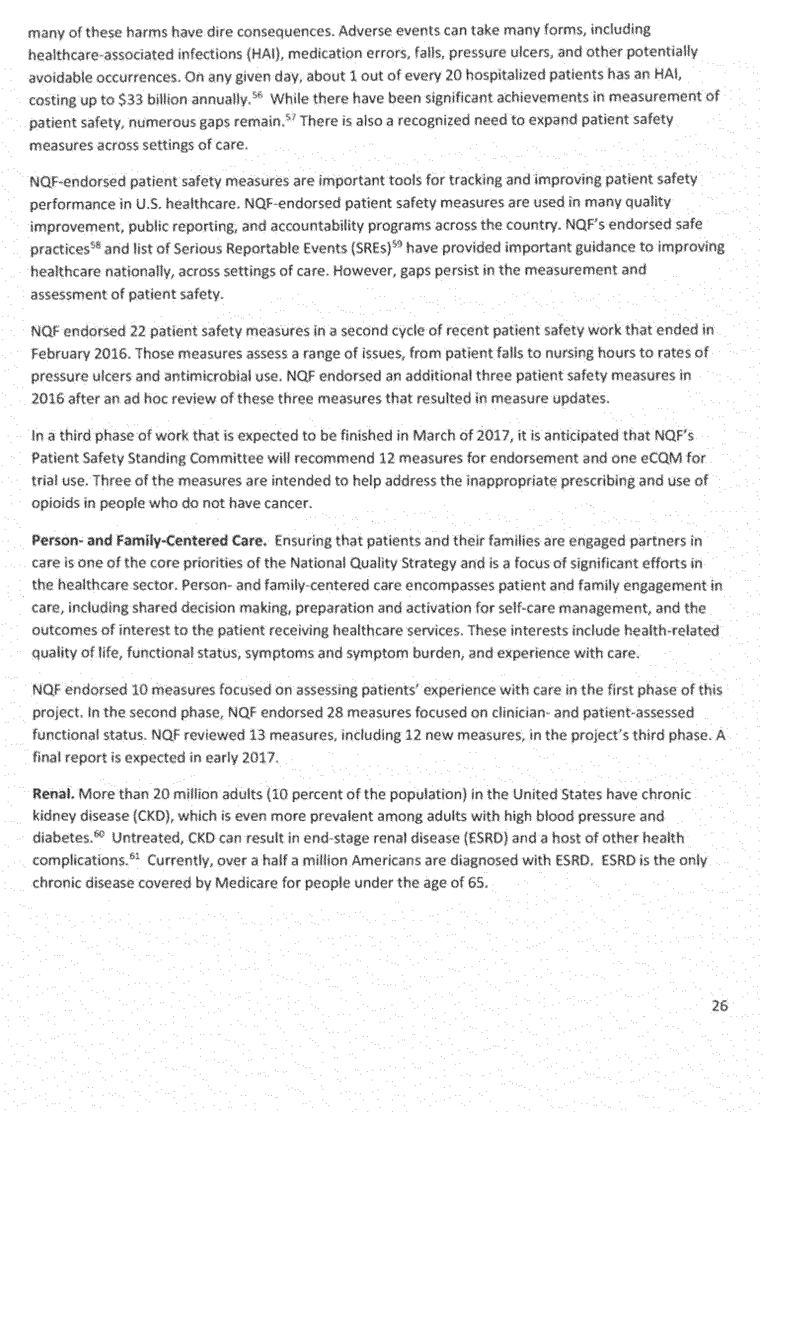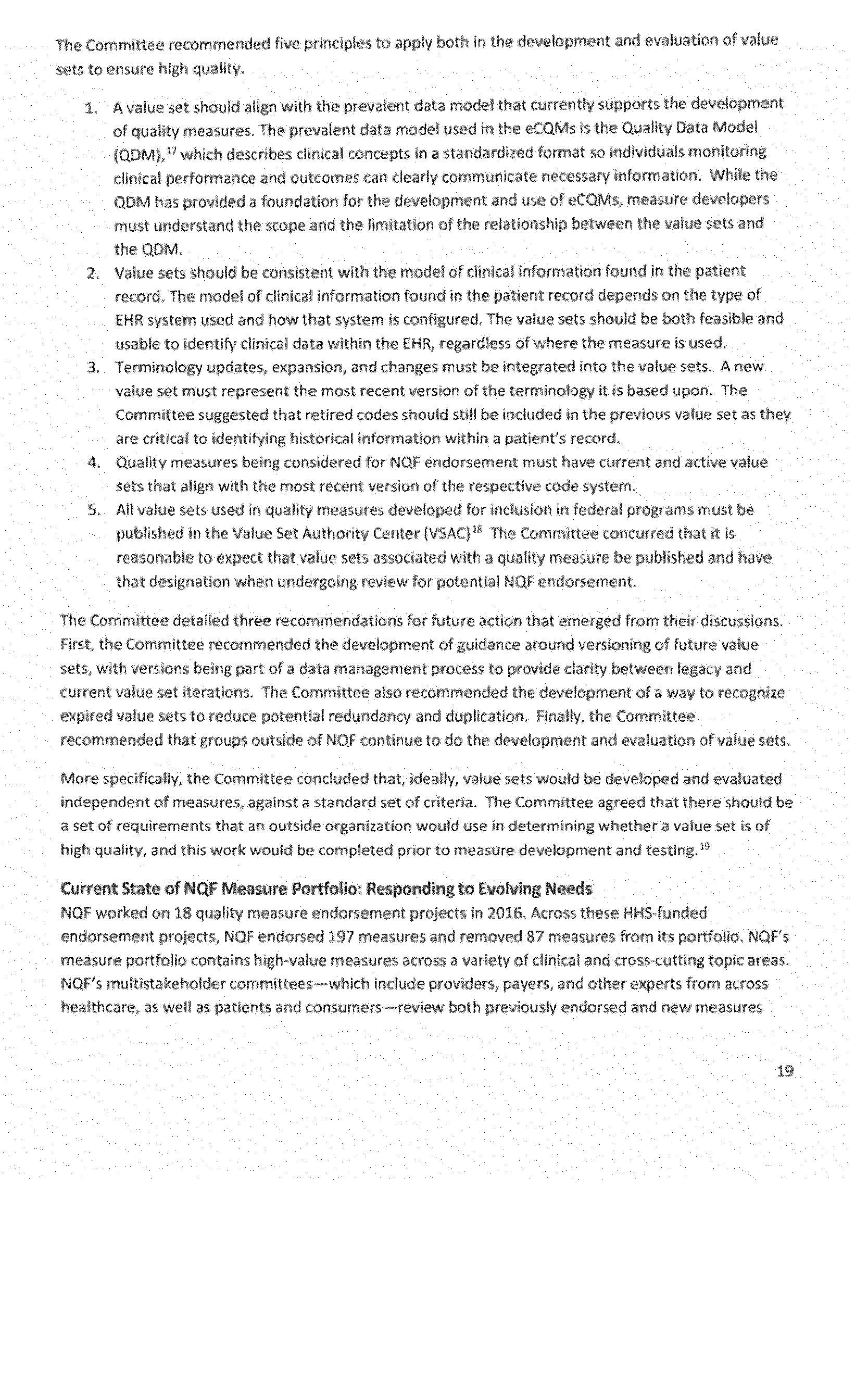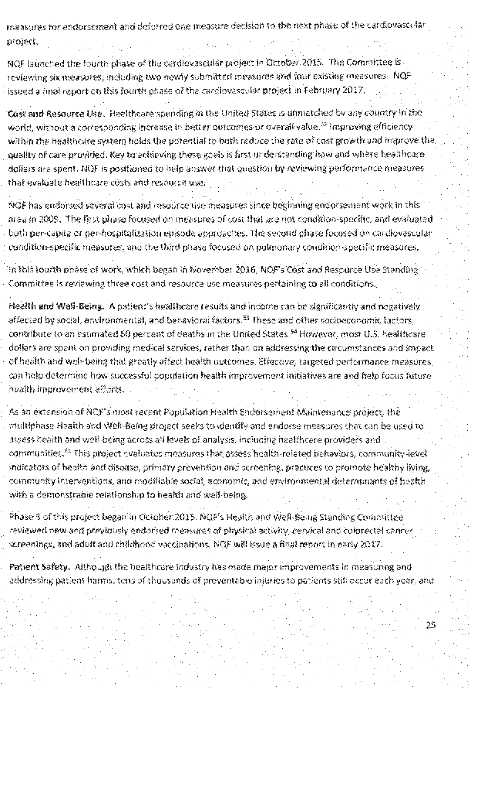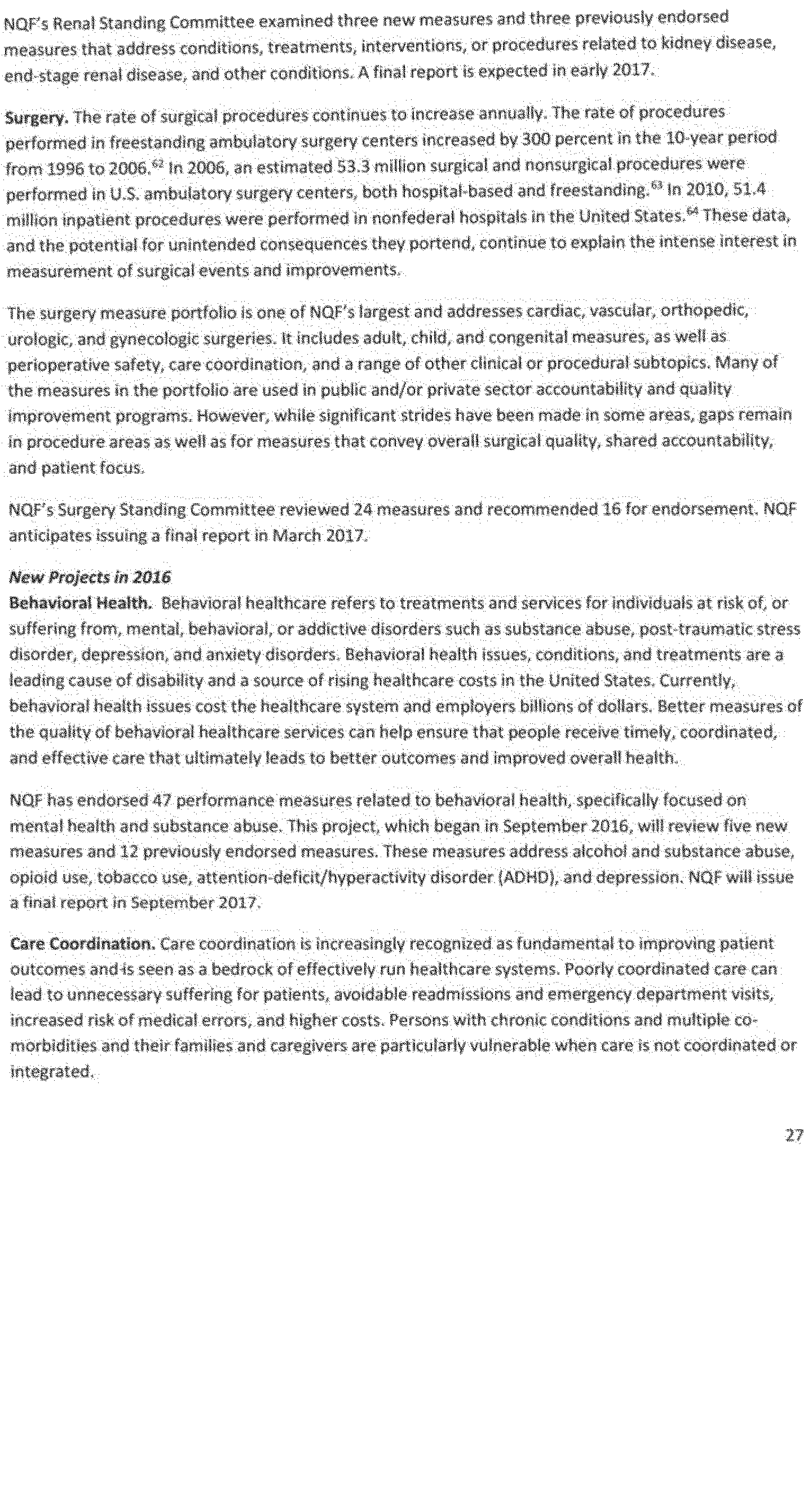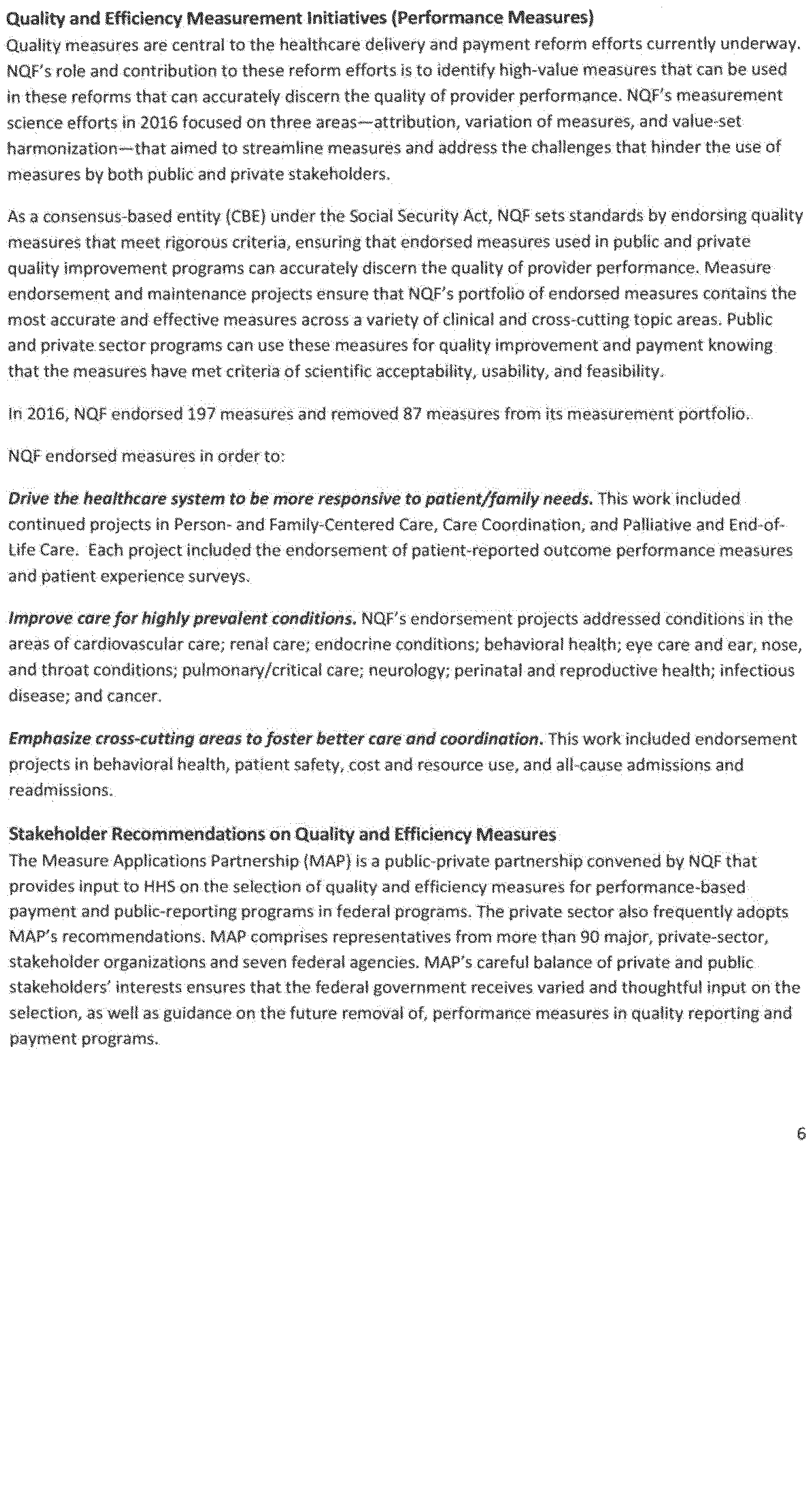 Once again we thank the National Quality Forum (NQF) and the many stakeholders who participate in NQF projects for helping to advance the science and utility of health care quality measurement. As part of its annual recurring work to maintain a strong portfolio of endorsed measures for use across varied providers, settings of care, and health conditions, NQF reports that in 2016 it updated its portfolio of approximately 600 endorsed measures by reviewing and endorsing or re-endorsing 197 measures and removing 87 measures. Endorsed measures facilitate the goals of improving care for highly prevalent conditions, fostering better care and coordination, and making the healthcare system more responsive to patient and family needs. These endorsed measures address a wide range of health care topics relevant to HHS programs, including: Person- and family-centered care; care coordination; palliative and end-of-life care; cardiovascular care; behavioral health; pulmonary/critical care; perinatal care; cancer treatment; patient safety; and cost and resource use.
