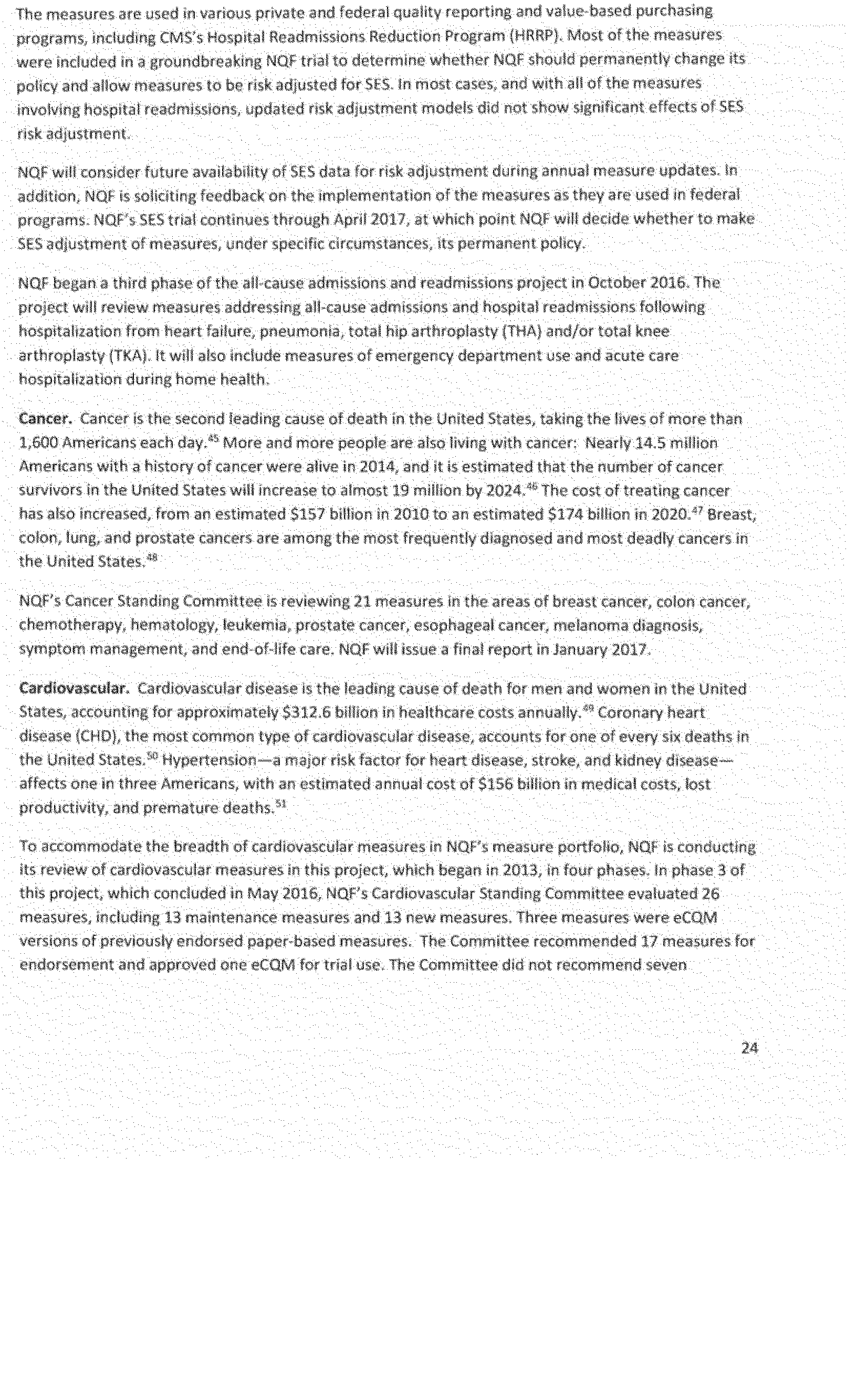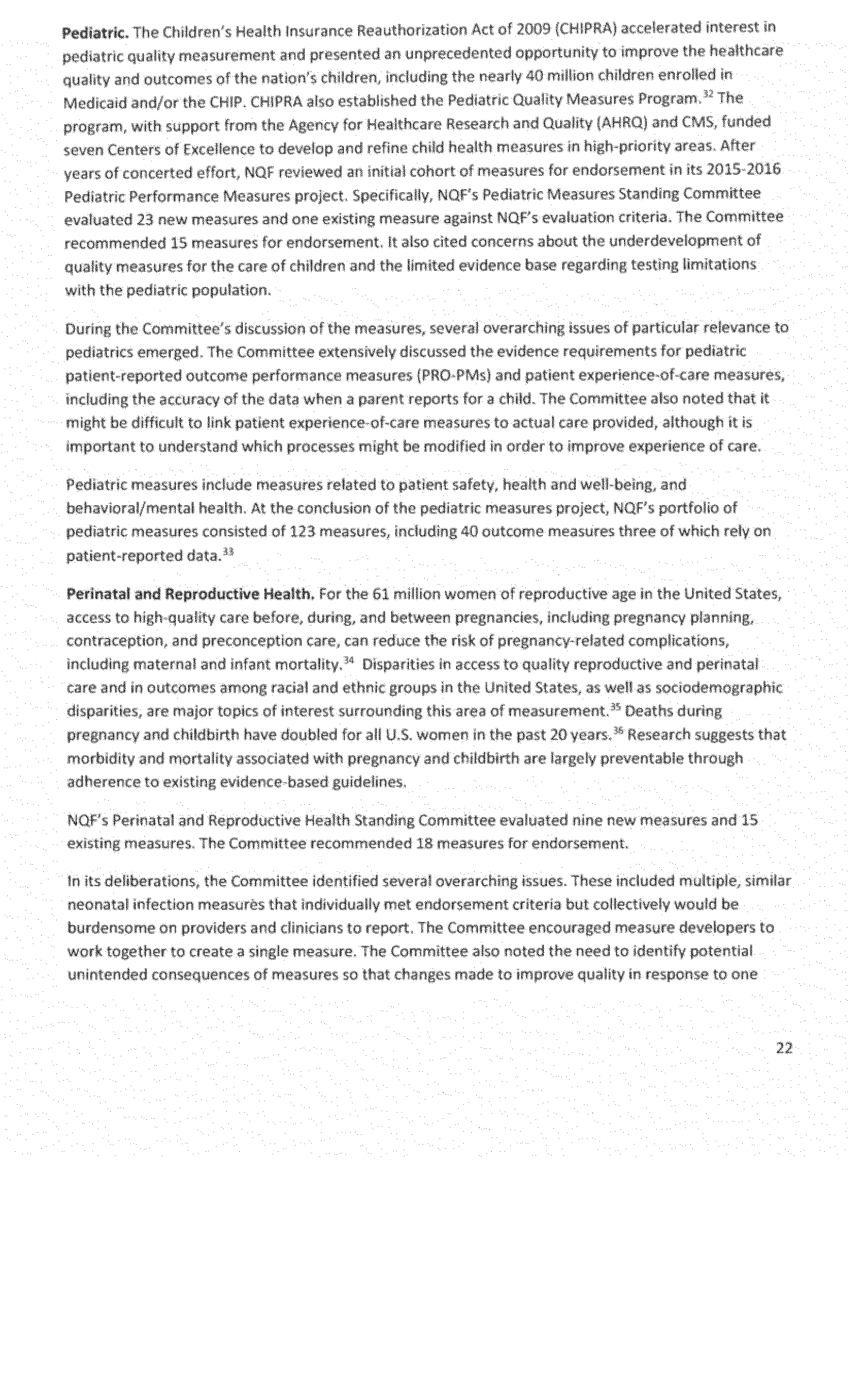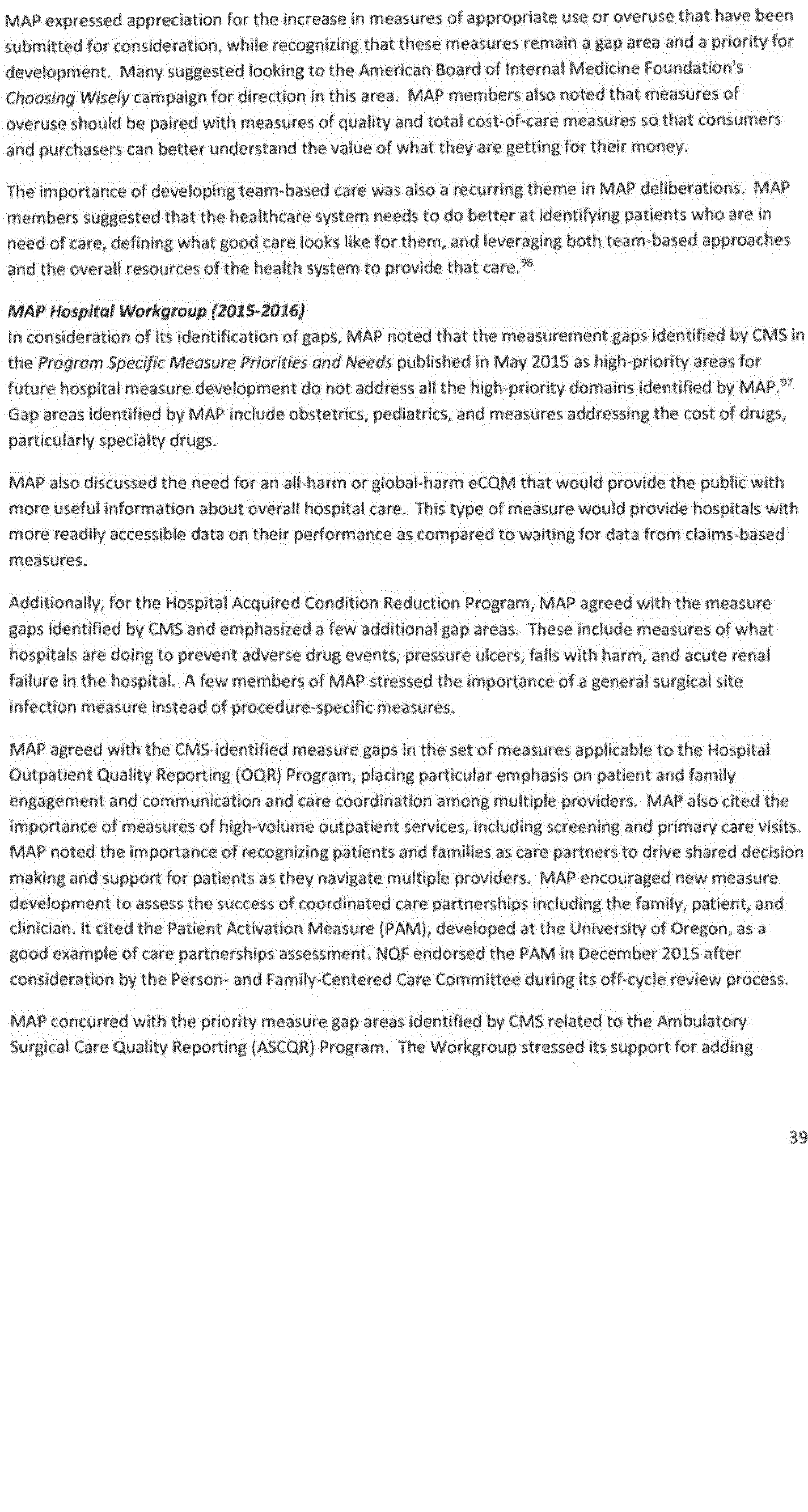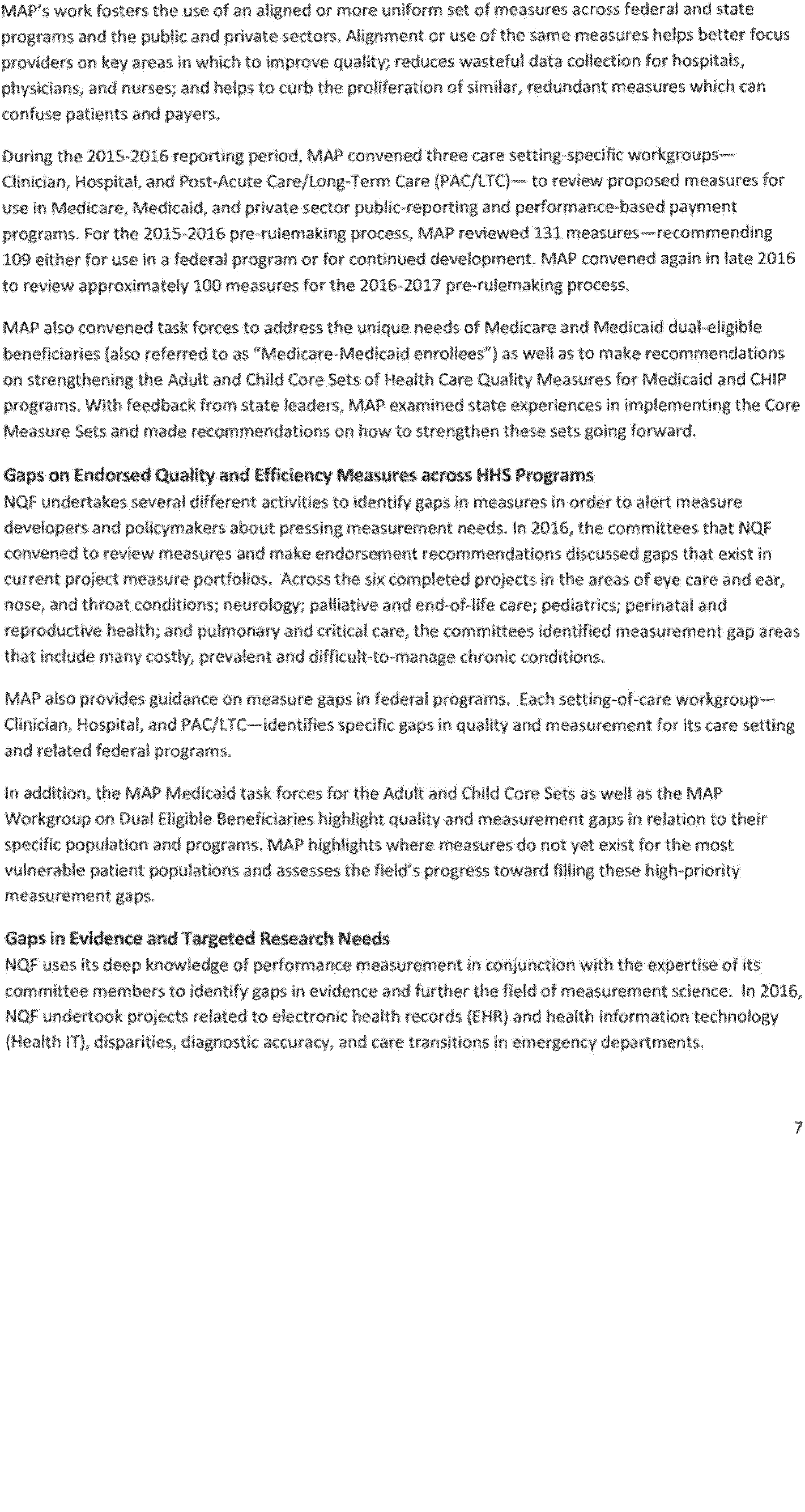 Once again we thank the National Quality Forum (NQF) and the many stakeholders who participate in NQF projects for helping to advance the science and utility of health care quality measurement. As part of its annual recurring work to maintain a strong portfolio of endorsed measures for use across varied providers, settings of care, and health conditions, NQF reports that in 2016 it updated its portfolio of approximately 600 endorsed measures by reviewing and endorsing or re-endorsing 197 measures and removing 87 measures. Endorsed measures facilitate the goals of improving care for highly prevalent conditions, fostering better care and coordination, and making the healthcare system more responsive to patient and family needs. These endorsed measures address a wide range of health care topics relevant to HHS programs, including: Person- and family-centered care; care coordination; palliative and end-of-life care; cardiovascular care; behavioral health; pulmonary/critical care; perinatal care; cancer treatment; patient safety; and cost and resource use.