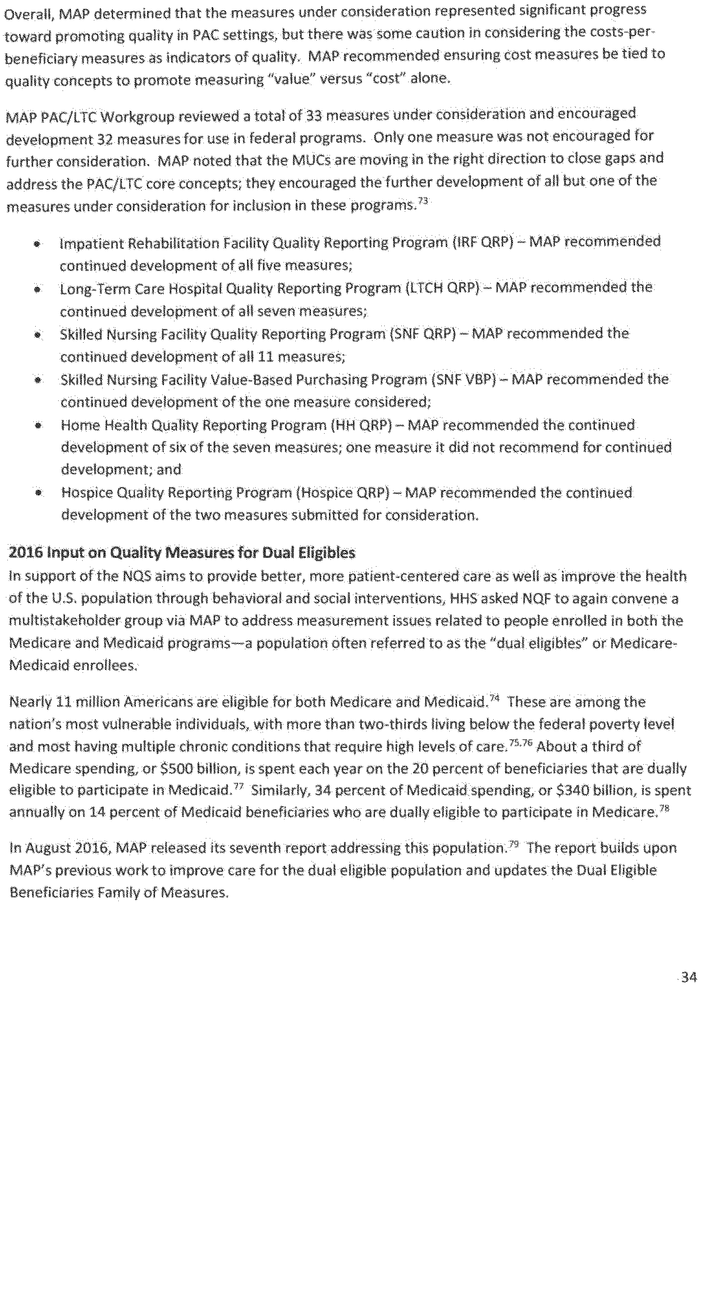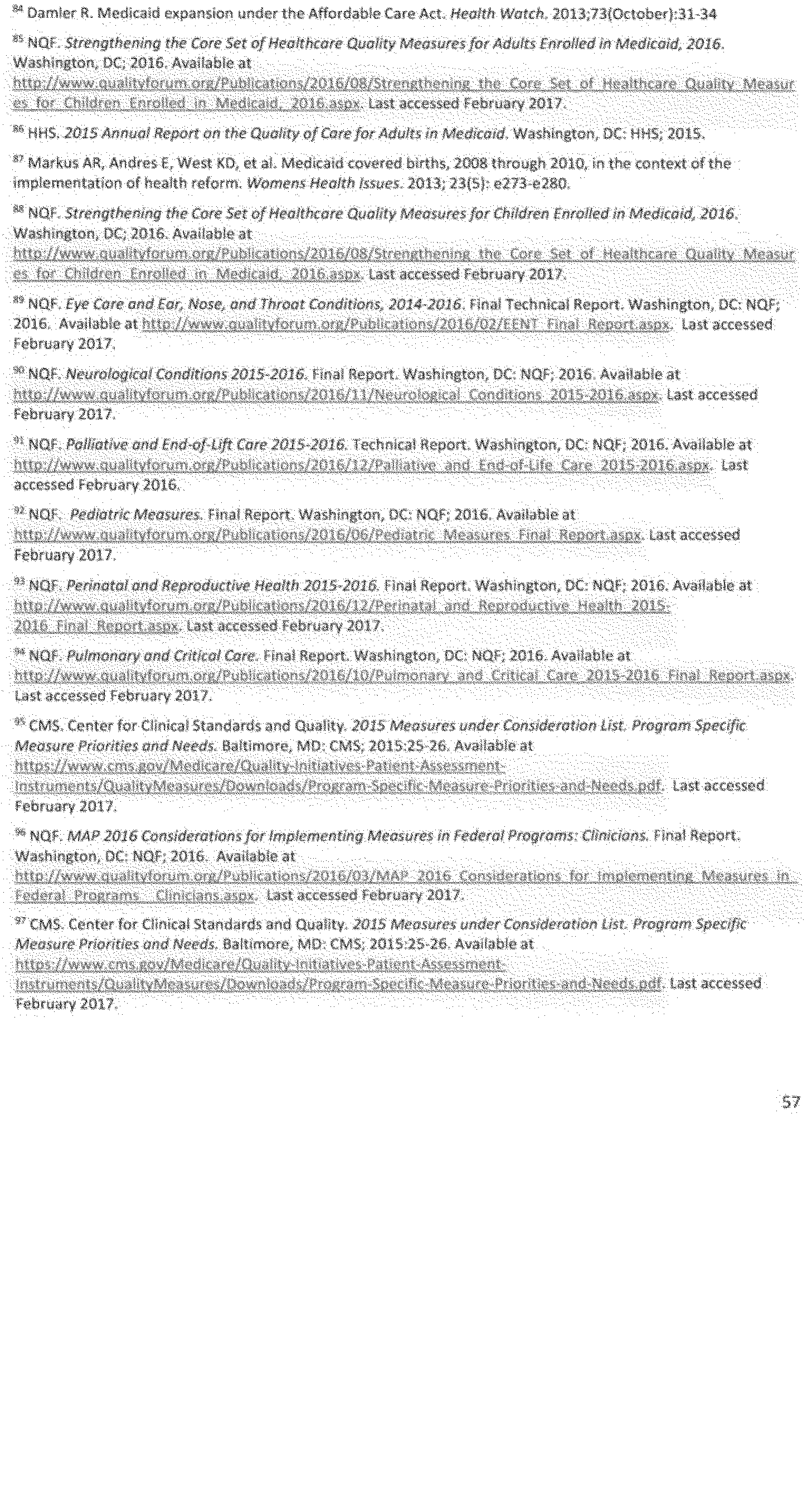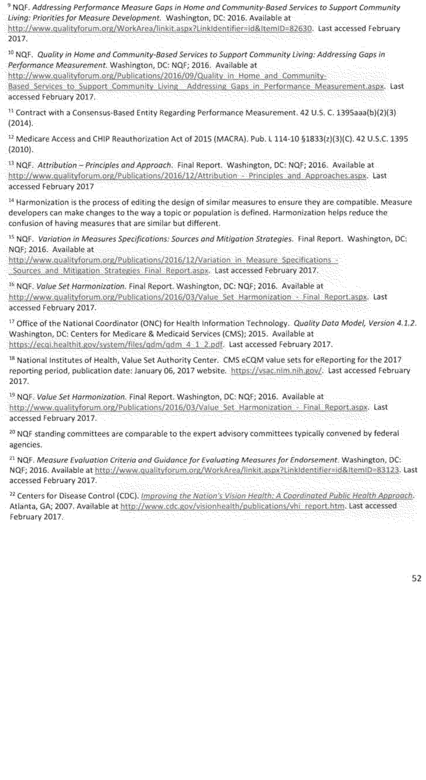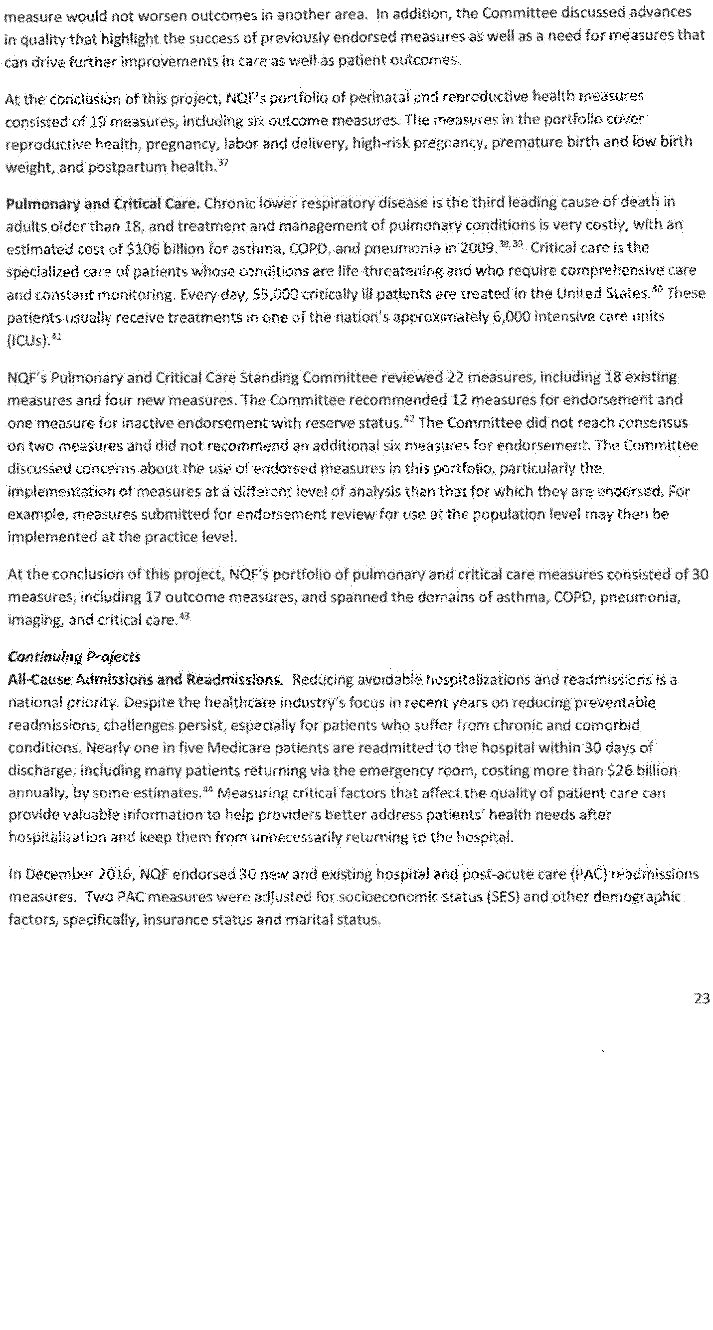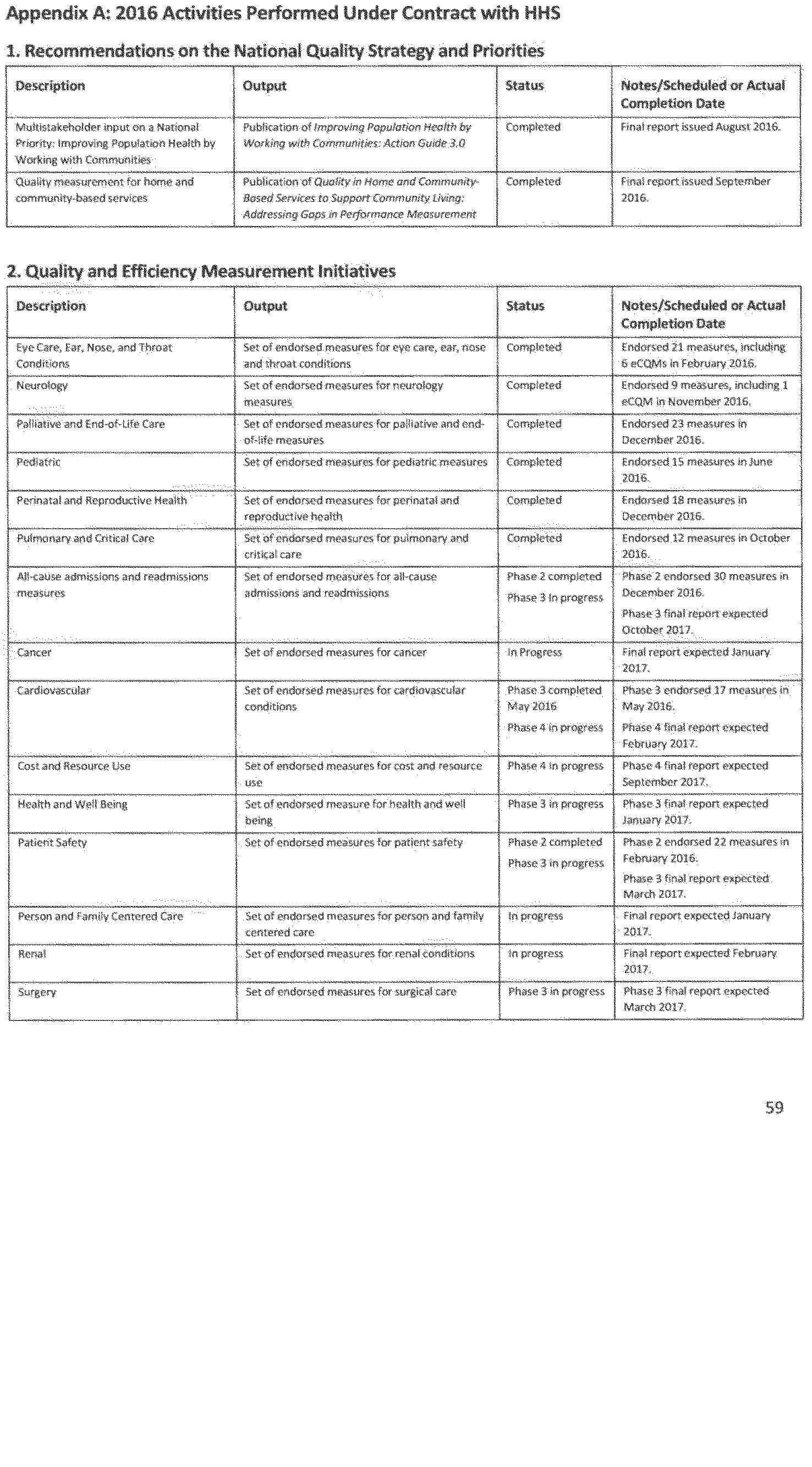 Once again we thank the National Quality Forum (NQF) and the many stakeholders who participate in NQF projects for helping to advance the science and utility of health care quality measurement. As part of its annual recurring work to maintain a strong portfolio of endorsed measures for use across varied providers, settings of care, and health conditions, NQF reports that in 2016 it updated its portfolio of approximately 600 endorsed measures by reviewing and endorsing or re-endorsing 197 measures and removing 87 measures. Endorsed measures facilitate the goals of improving care for highly prevalent conditions, fostering better care and coordination, and making the healthcare system more responsive to patient and family needs. These endorsed measures address a wide range of health care topics relevant to HHS programs, including: Person- and family-centered care; care coordination; palliative and end-of-life care; cardiovascular care; behavioral health; pulmonary/critical care; perinatal care; cancer treatment; patient safety; and cost and resource use.