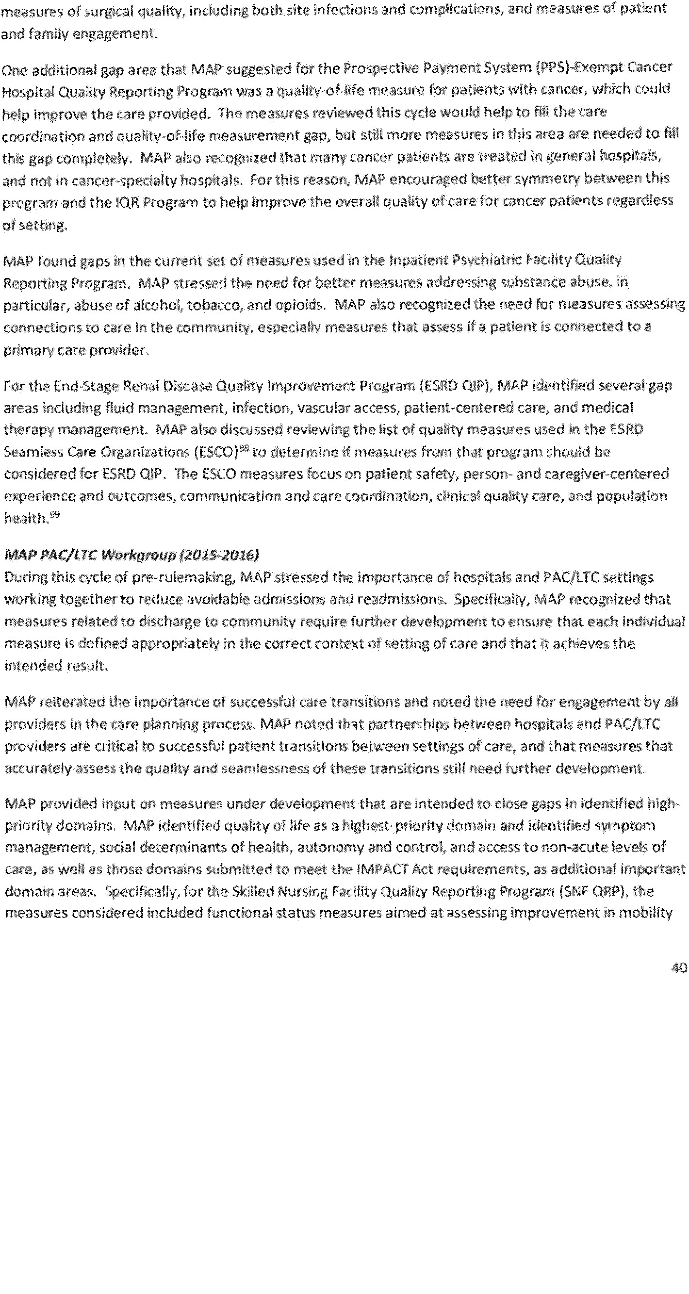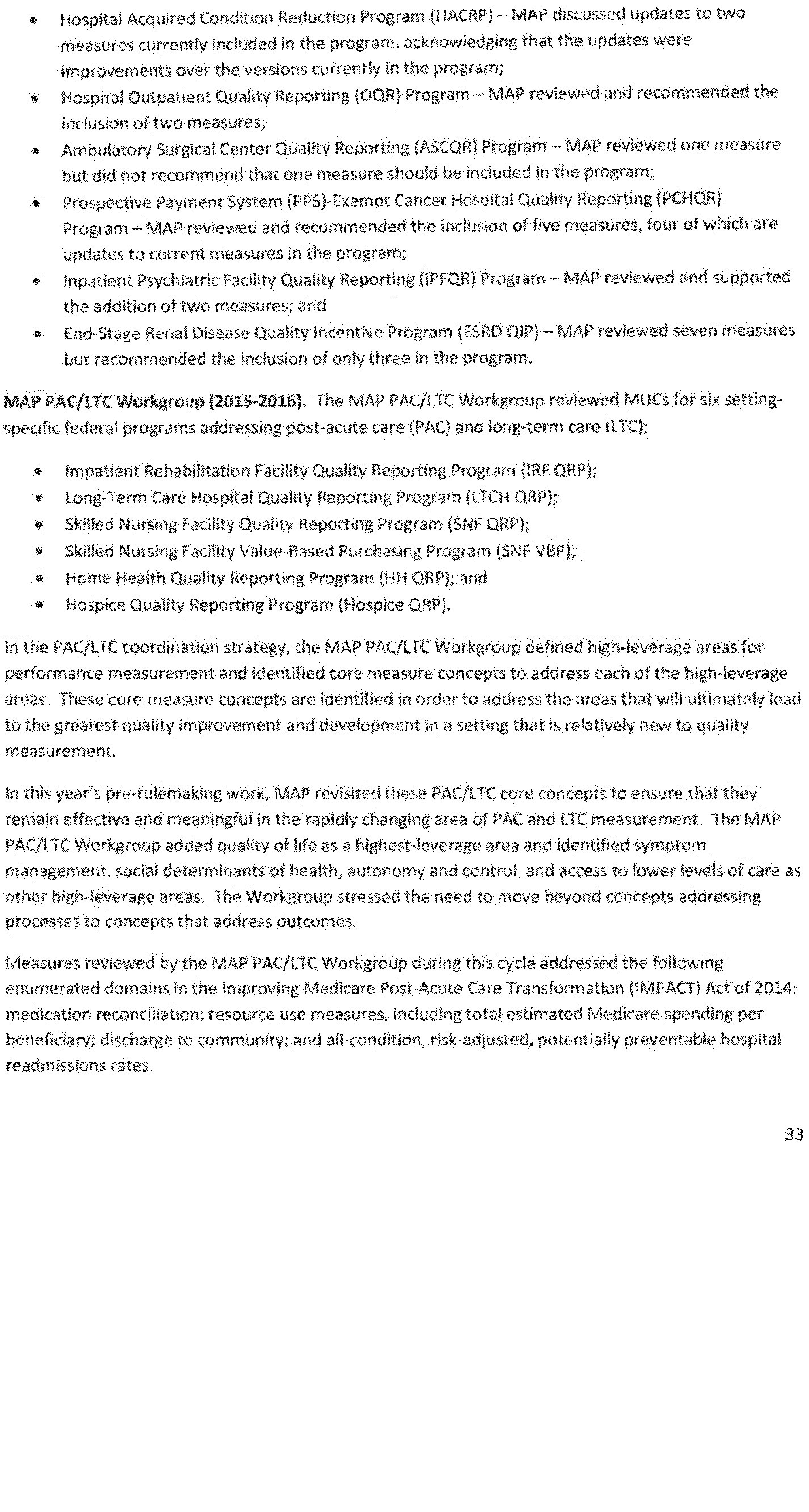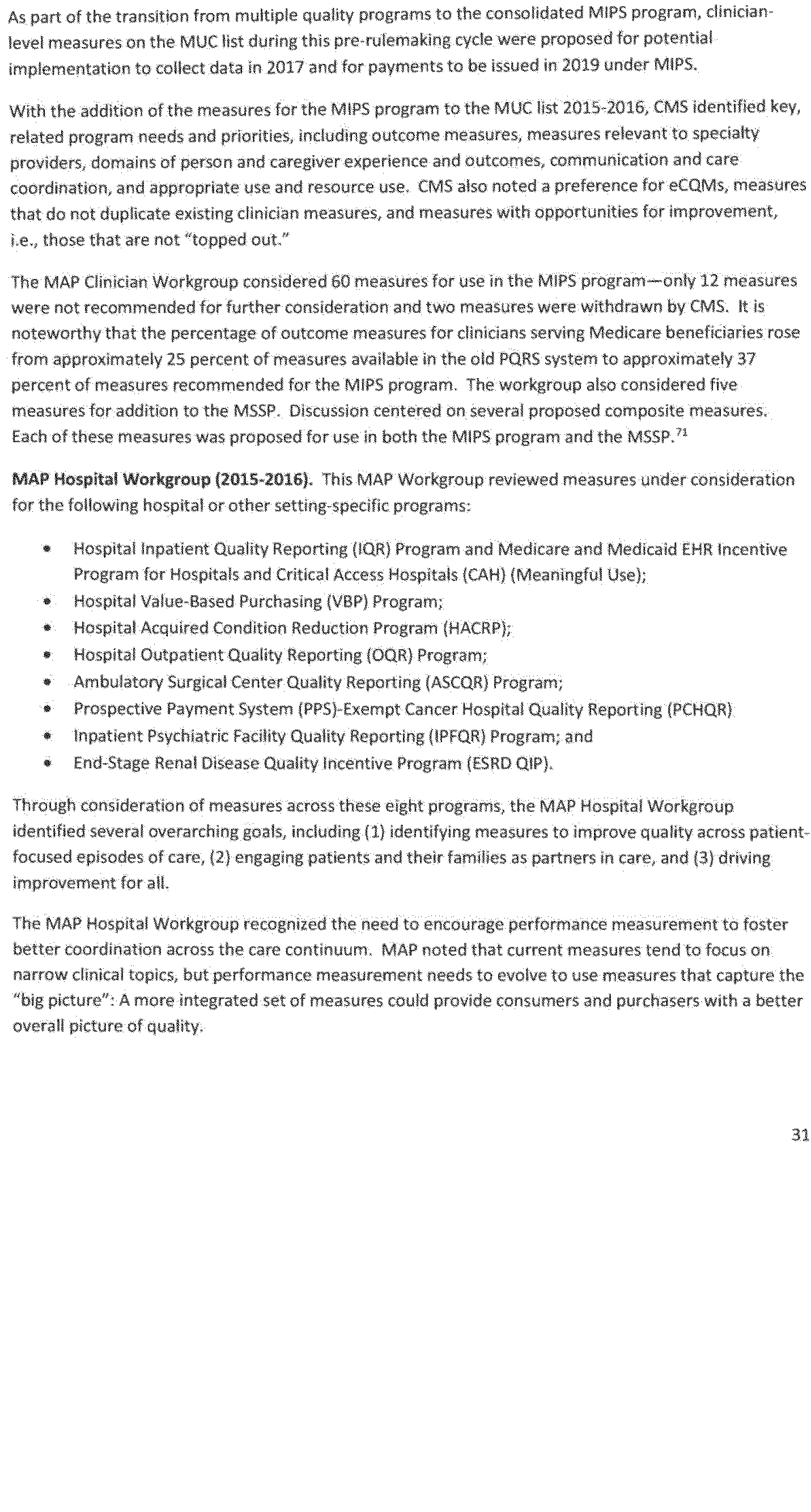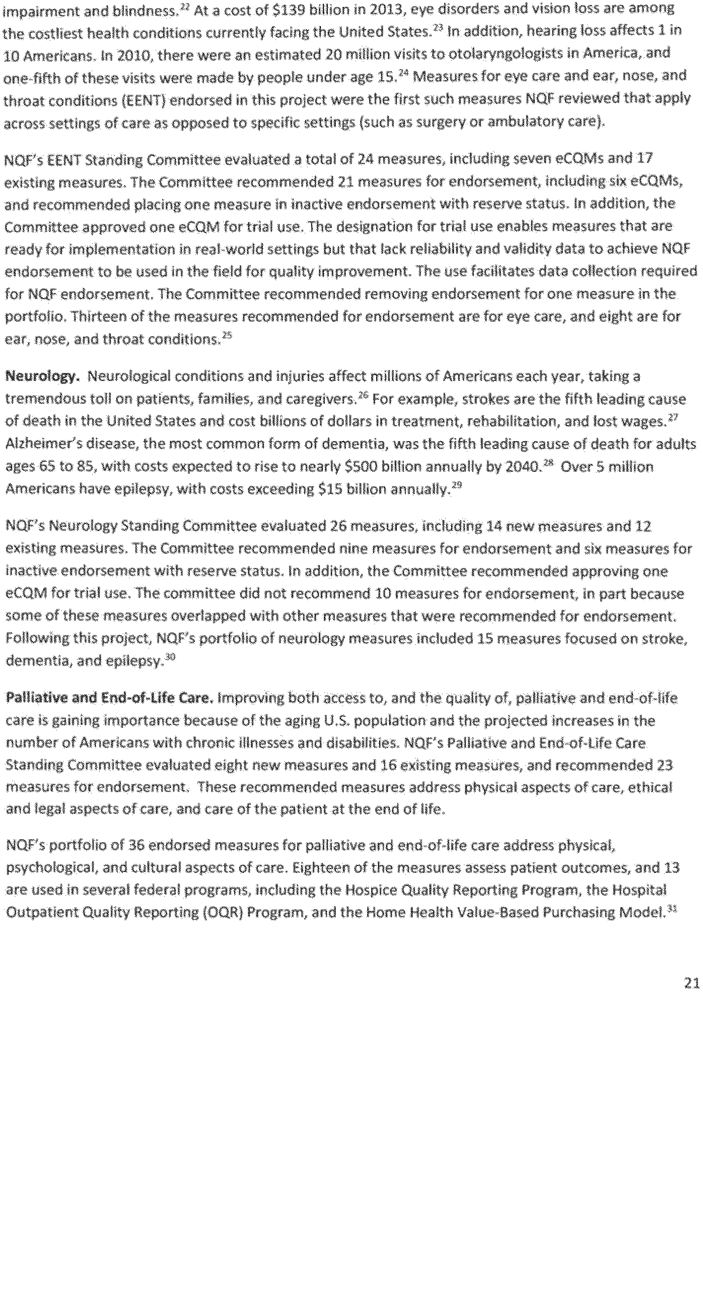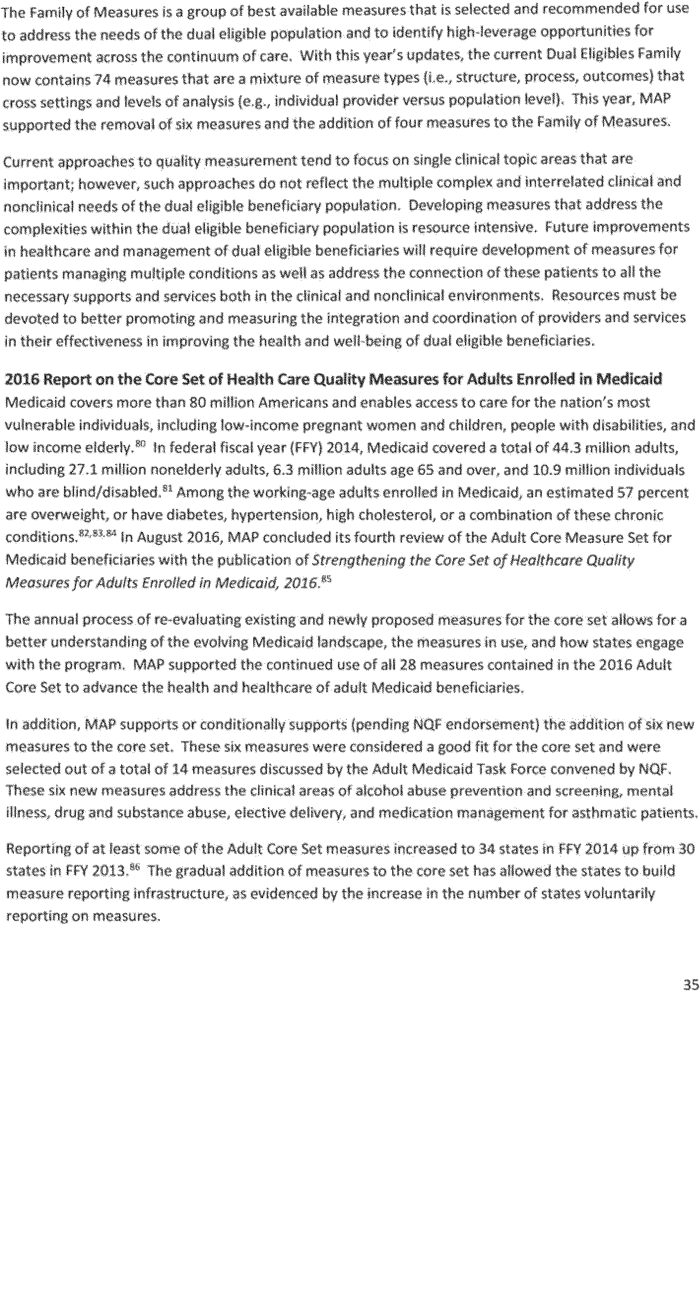 Once again we thank the National Quality Forum (NQF) and the many stakeholders who participate in NQF projects for helping to advance the science and utility of health care quality measurement. As part of its annual recurring work to maintain a strong portfolio of endorsed measures for use across varied providers, settings of care, and health conditions, NQF reports that in 2016 it updated its portfolio of approximately 600 endorsed measures by reviewing and endorsing or re-endorsing 197 measures and removing 87 measures. Endorsed measures facilitate the goals of improving care for highly prevalent conditions, fostering better care and coordination, and making the healthcare system more responsive to patient and family needs. These endorsed measures address a wide range of health care topics relevant to HHS programs, including: Person- and family-centered care; care coordination; palliative and end-of-life care; cardiovascular care; behavioral health; pulmonary/critical care; perinatal care; cancer treatment; patient safety; and cost and resource use.
