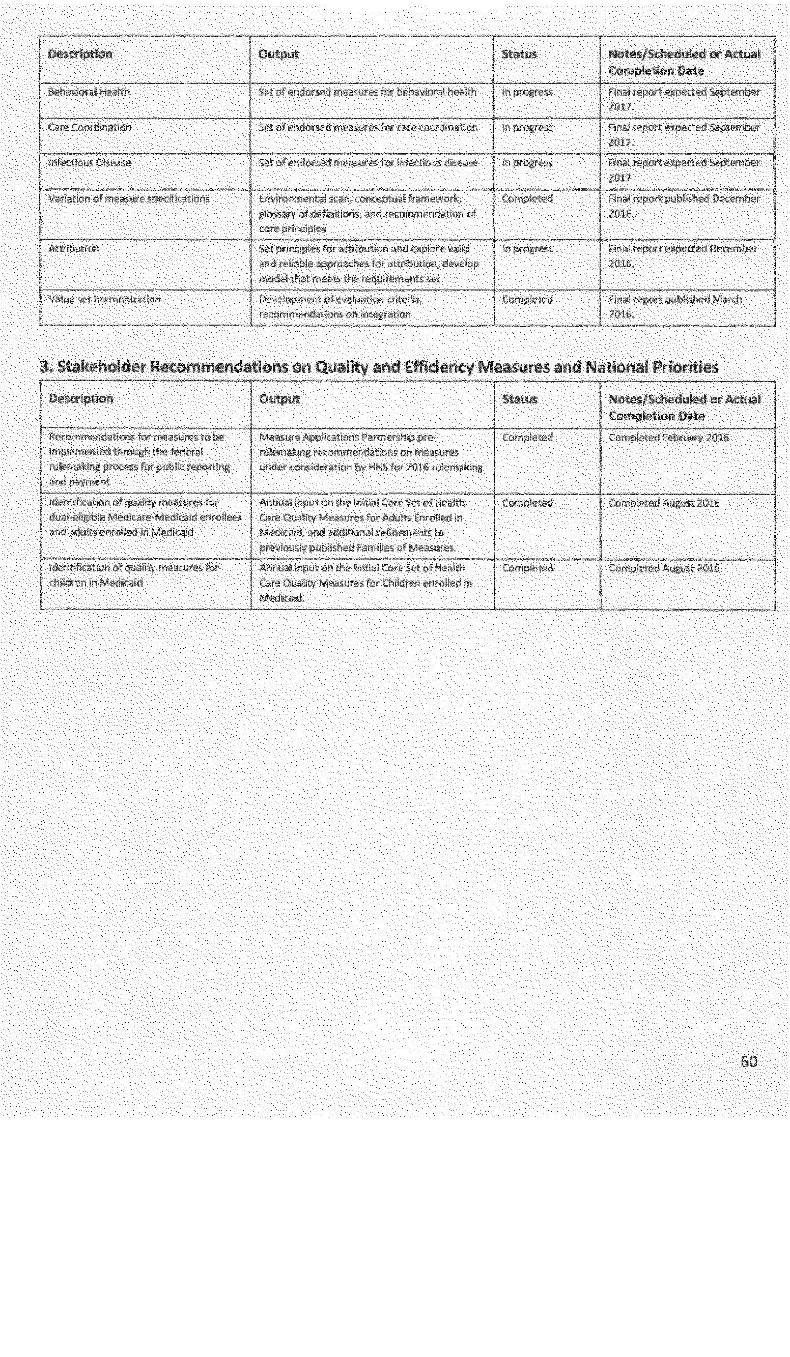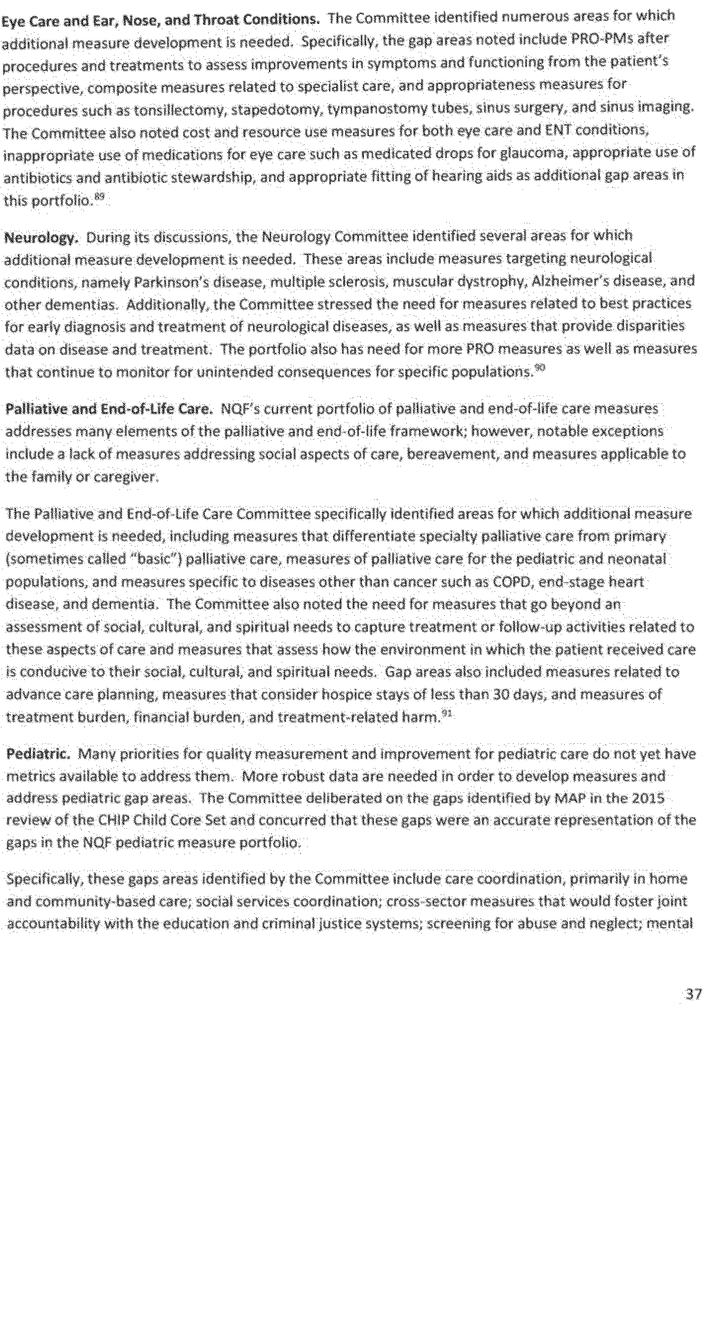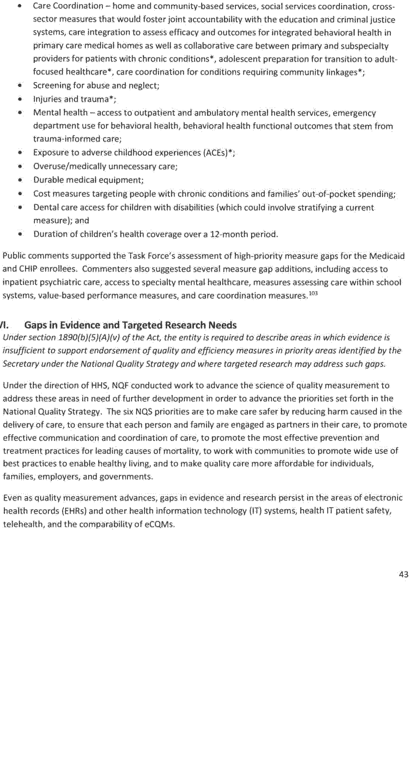 - Gaps in endorsed quality and efficiency measures, including measures that are within priority areas identified by the Secretary under the national strategy established under section 399HH of the Public Health Service Act (National Quality Strategy), and where quality and efficiency measures are unavailable or inadequate to identify or address such gaps;