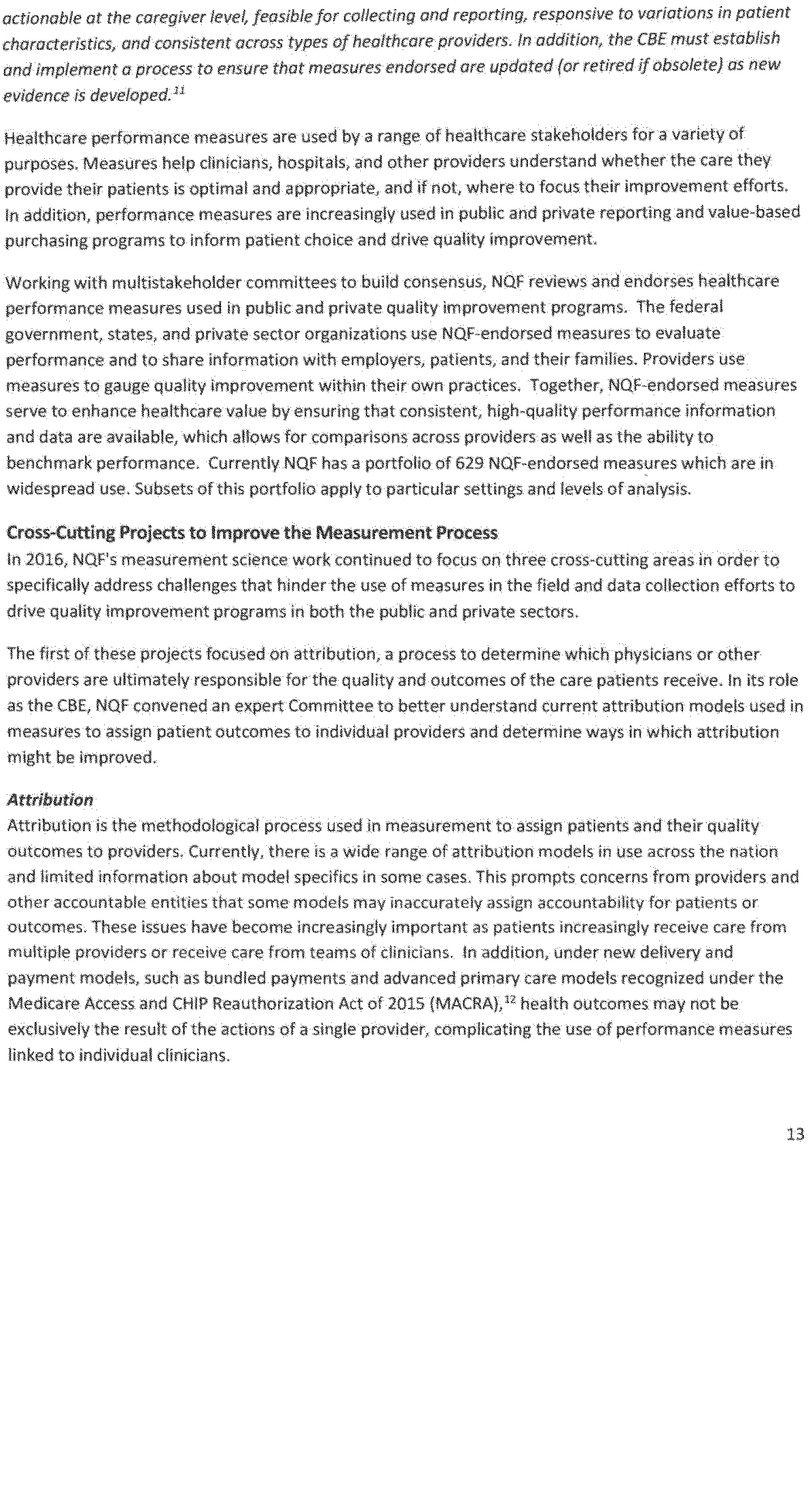 In addition, in 2016 NQF undertook and continued a number of projects to address difficult quality measurement issues and reduce the burden of quality measures for clinicians. An important area that NQF continued to address was the issue of attribution, or the process used to assign accountability for a patient and his or her quality outcomes to a clinician, a group of clinicians, or a facility. HHS agrees that engaging clinicians and clearly communicating the methods and benchmarks used to determine attribution are foundational principles in quality measurement. Having clear methods for attribution helps clinicians understand the information given to them from quality measures, and allows for clinicians to make actionable changes to their clinical practices. When clinicians receive meaningful feedback regarding performance measurement, they can use it to implement best practices. Clear performance data reduce clinicians' burden in deciphering quality measurement information and allows them to focus on how best to improve care. While attribution models may differ, clinician engagement, transparency, and clear, usable data remain fundamental to quality measurement.