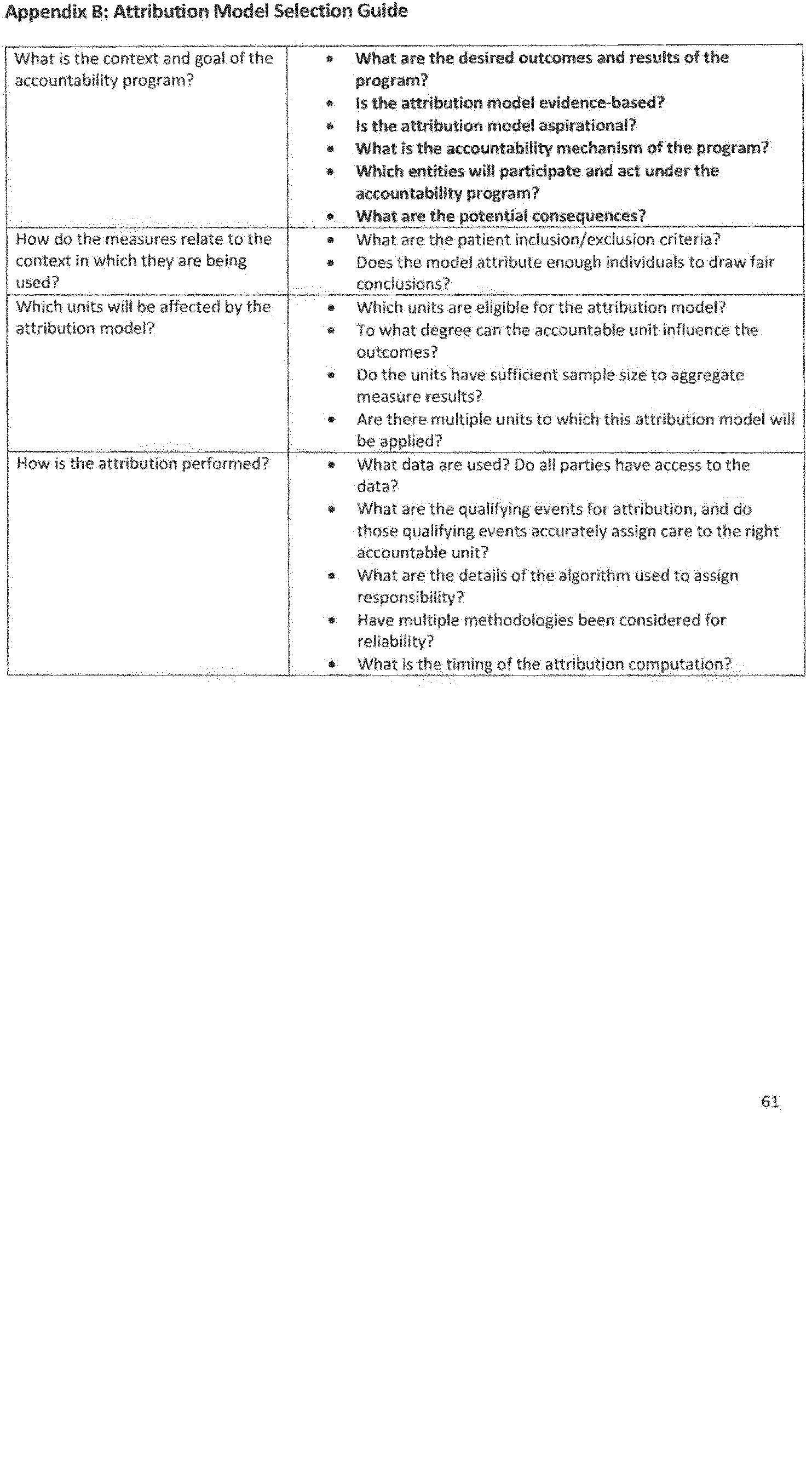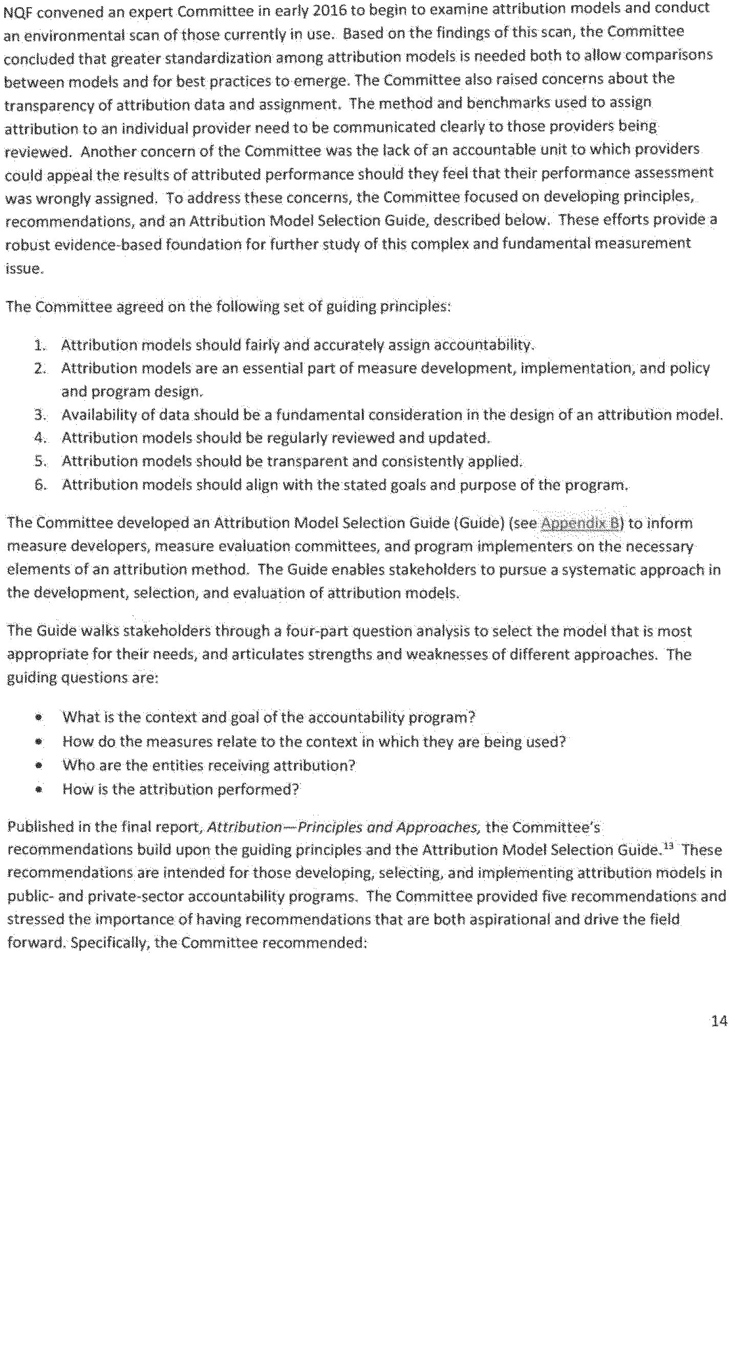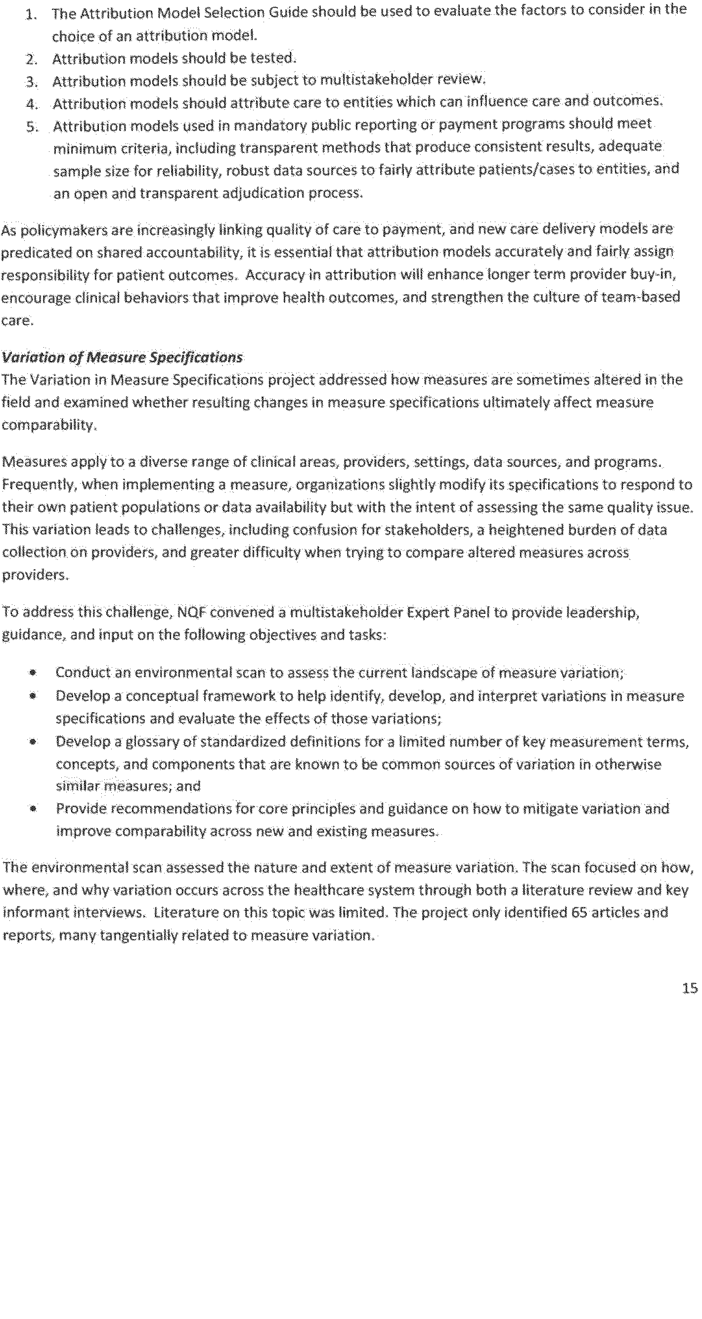 NQF's work on attribution began in 2015 when NQF convened a multi-stakeholder committee to examine attribution models and recommend principles to guide the selection and implementation of approaches. This work has resulted in a thorough list of potential approaches to validly and reliably attribute performance measurement results to one or more clinicians under different delivery models and to identify models of attribution for potential testing. The committee first convened in December 2015 and performed an environmental scan to identify attribution models currently in use and models that have been proposed but not implemented. The environmental scan identified 171 unique attribution models, 27 of which have been implemented and 144 of which remain proposals only. The models differed across care settings, payment models, and in methodology, but there were also areas of similarity. After reviewing and discussing the scan, the committee defined several guiding principles to inform the development of ( printed page 39799) successful attribution models. In addition, the committee developed an Attribution Model Selection Guide and outlined their findings in a report published in December 2016. See “Attribution—Principles and Approaches”, National Quality Forum, December 2016, https://www.qualityforum.org/Publications/2016/12/Attribution_-_Principles_and_Approaches.aspx.
