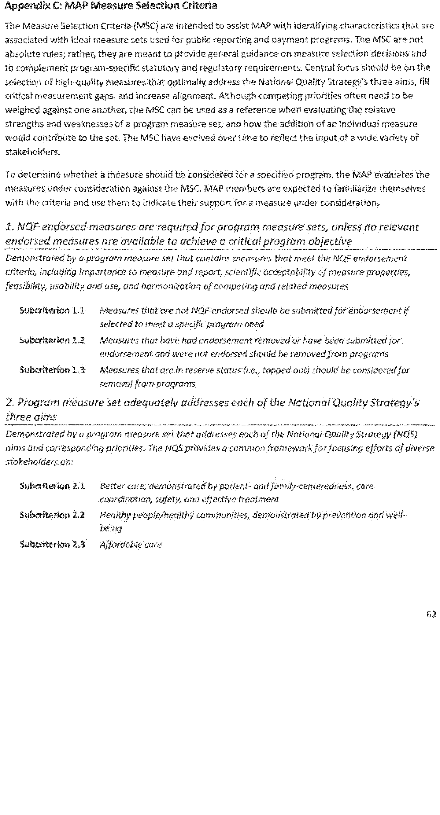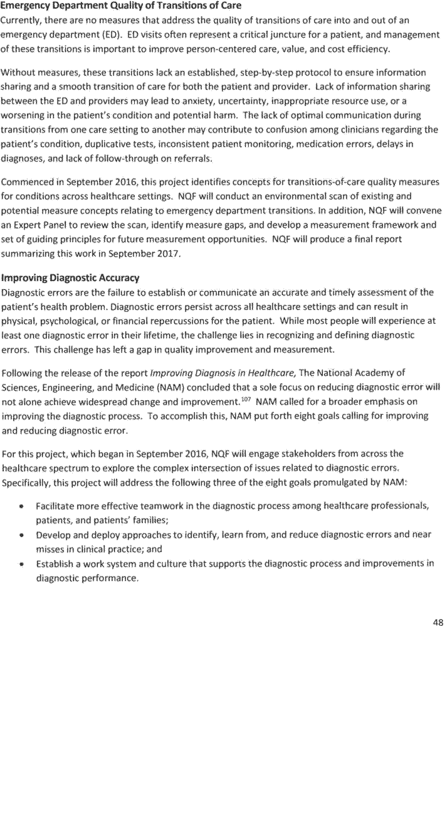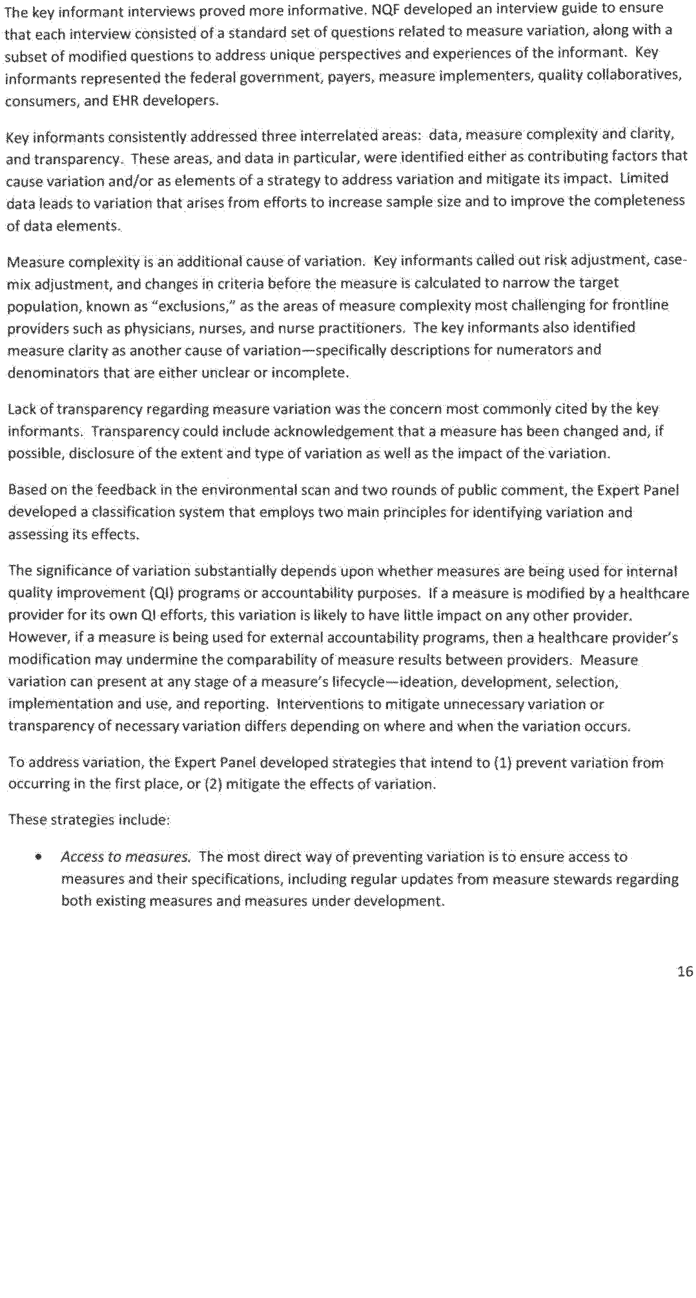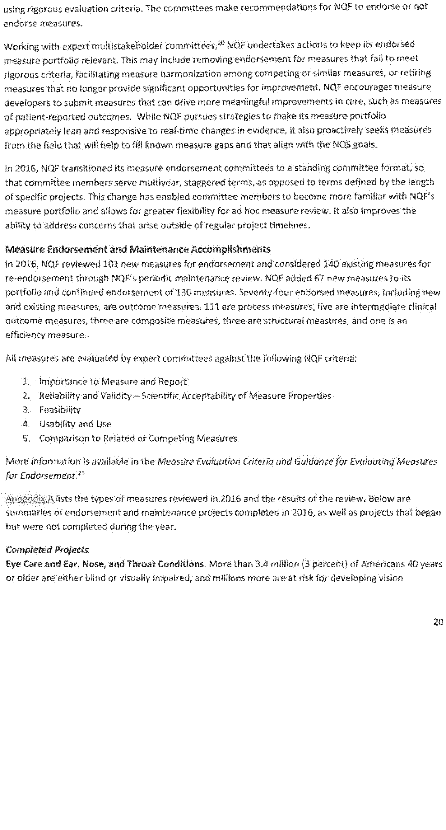 In addition to adding and re-endorsing new and existing measures, some measures were also removed from the portfolio for a variety of reasons (for example, no longer meeting endorsement criteria; harmonization with other similar measures; retirement by the measures developers; replacement with improved measures; and lack of continued need because providers consistently perform at the highest level on those measures). This continuous refinement of the measures portfolio through the measures maintenance process ensures that quality measures remain aligned with current field practices and health care goals. NQF also reports that in 2016 it continued to support the National Quality Strategy (NQS) by endorsing measures linked to the NQS priorities and convening diverse stakeholder groups to reach consensus on key strategies for performance measurement.
