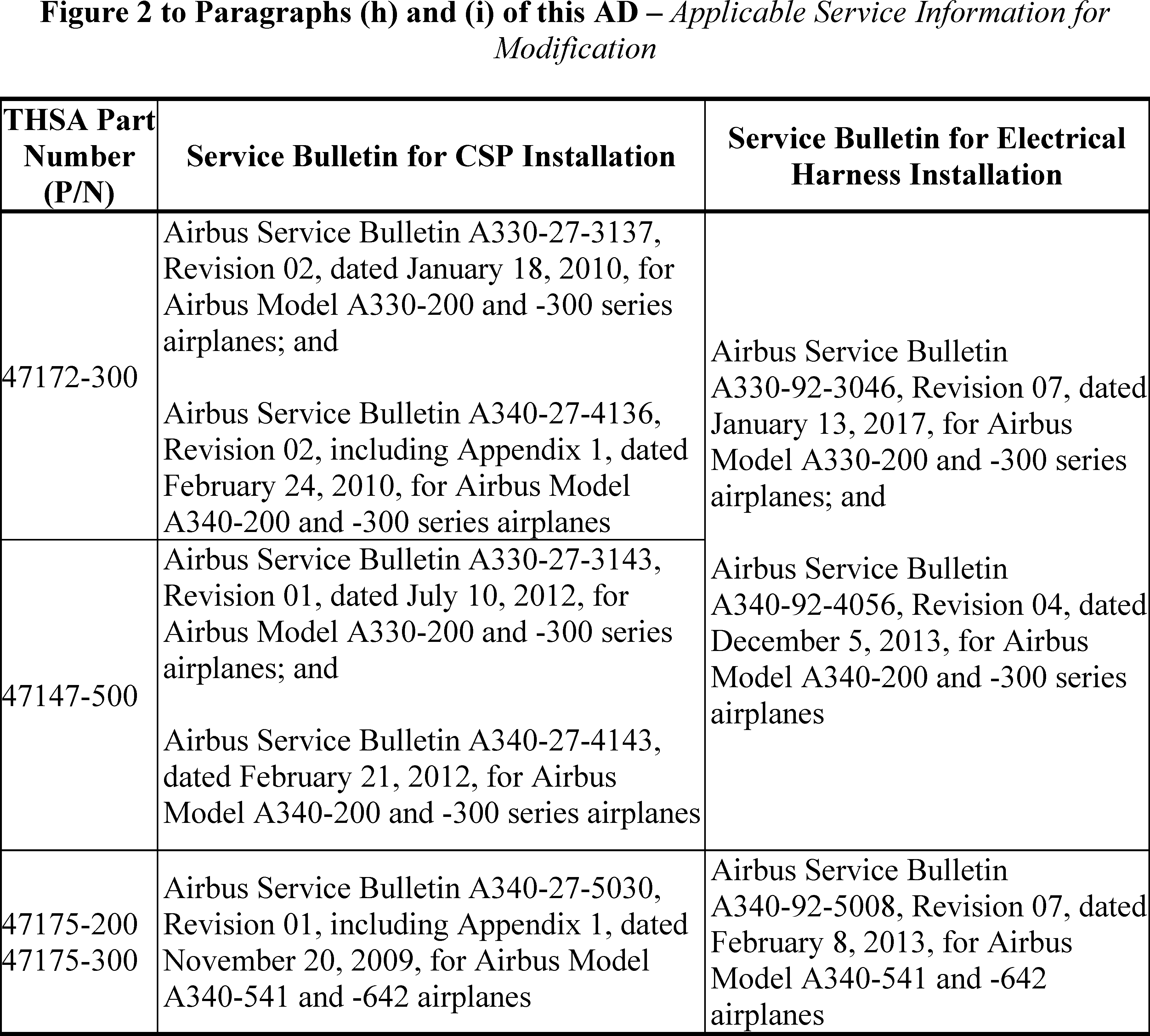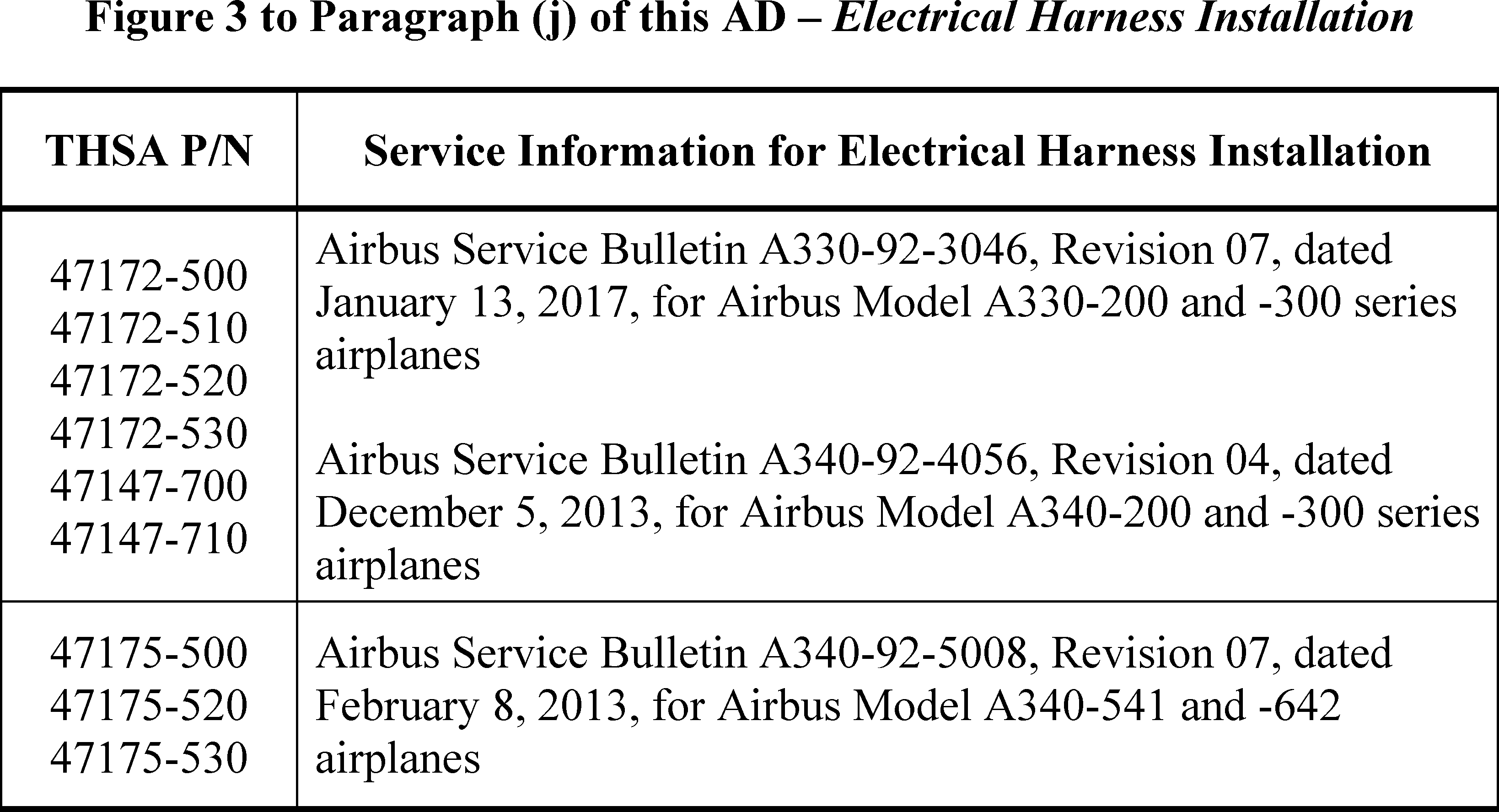 This paragraph restates the requirements of paragraph (j) of AD 2017-13-05, with no changes. For airplanes having one of the THSAs installed with a part number listed in figure 3 to paragraph (j) of this AD, and that have been modified by installing a CSP on the THSA as required by paragraph (h) of this AD: Within 12 months after August 28, 2017 (the effective date of AD 2017-13-05), inspect to determine if the electrical harness identified in the applicable Airbus service information specified in figure 3 to paragraph (j) of this AD is installed on the airplane, and, if not installed, modify the airplane by installing an electrical harness, in accordance with the Accomplishment Instructions of the Airbus service information specified in figure 3 to paragraph (j) of this AD, as applicable to the part number of the THSA installed on the airplane. Airplanes having one of the THSAs installed with a part number listed in figure 3 to paragraph (j) of this AD already have the CSP installed on the THSA, and only the electrical harness must be installed on the airplane.