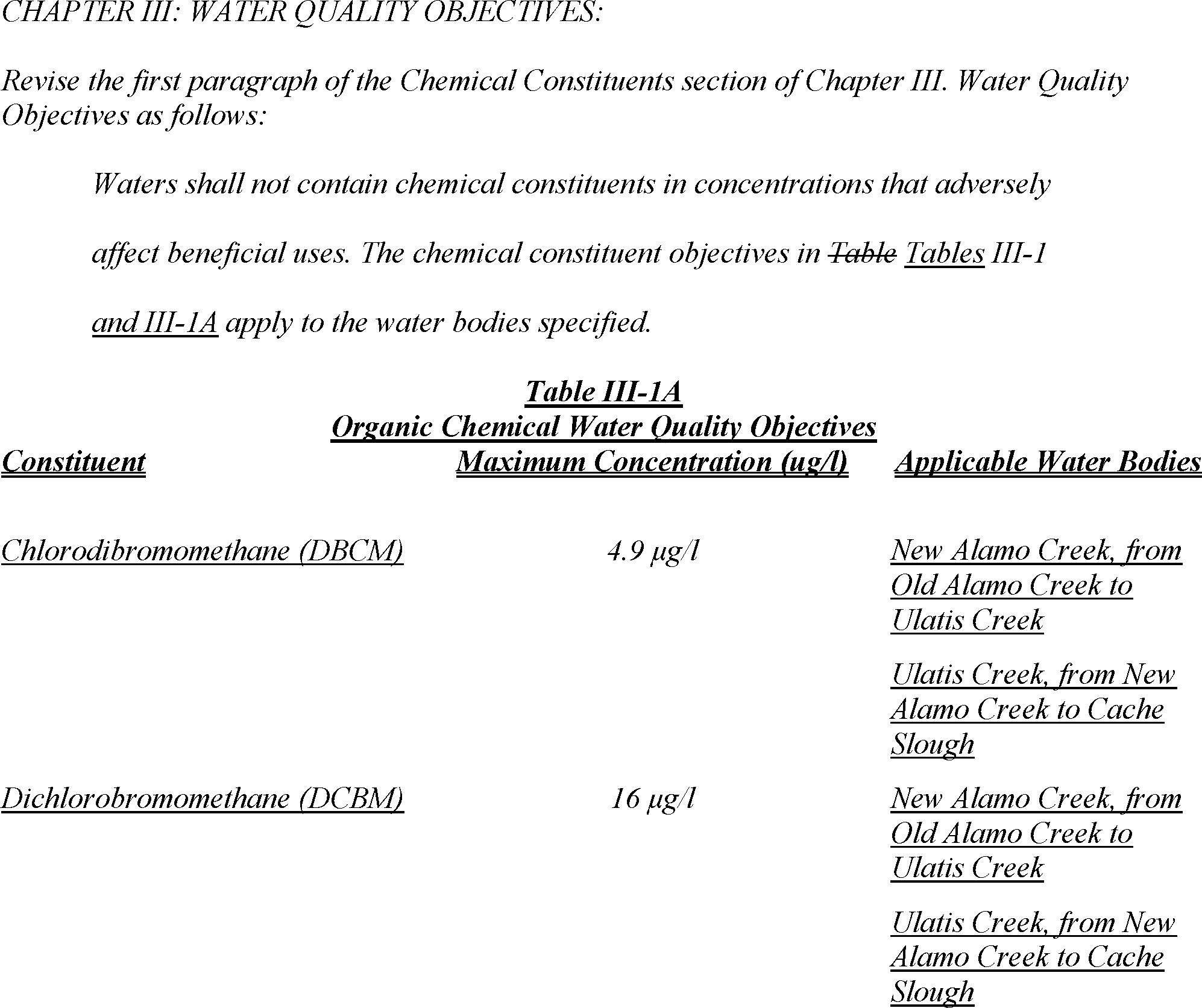 The following has been excerpted from the Water Quality Control Plan for the California Regional Water Quality Control Board—Central Valley Region (Basin Plan)—Resolution No. R5-2010-0047. Attachment 1 includes under the heading “ORGANIC CHEMICAL WATER QUALITY OBJECTIVES,” California's recently adopted site-specific objectives for chlorodibromomethane and dichlorobromomethane, for a segment of New Alamo Creek and a segment of Ulatis Creek.