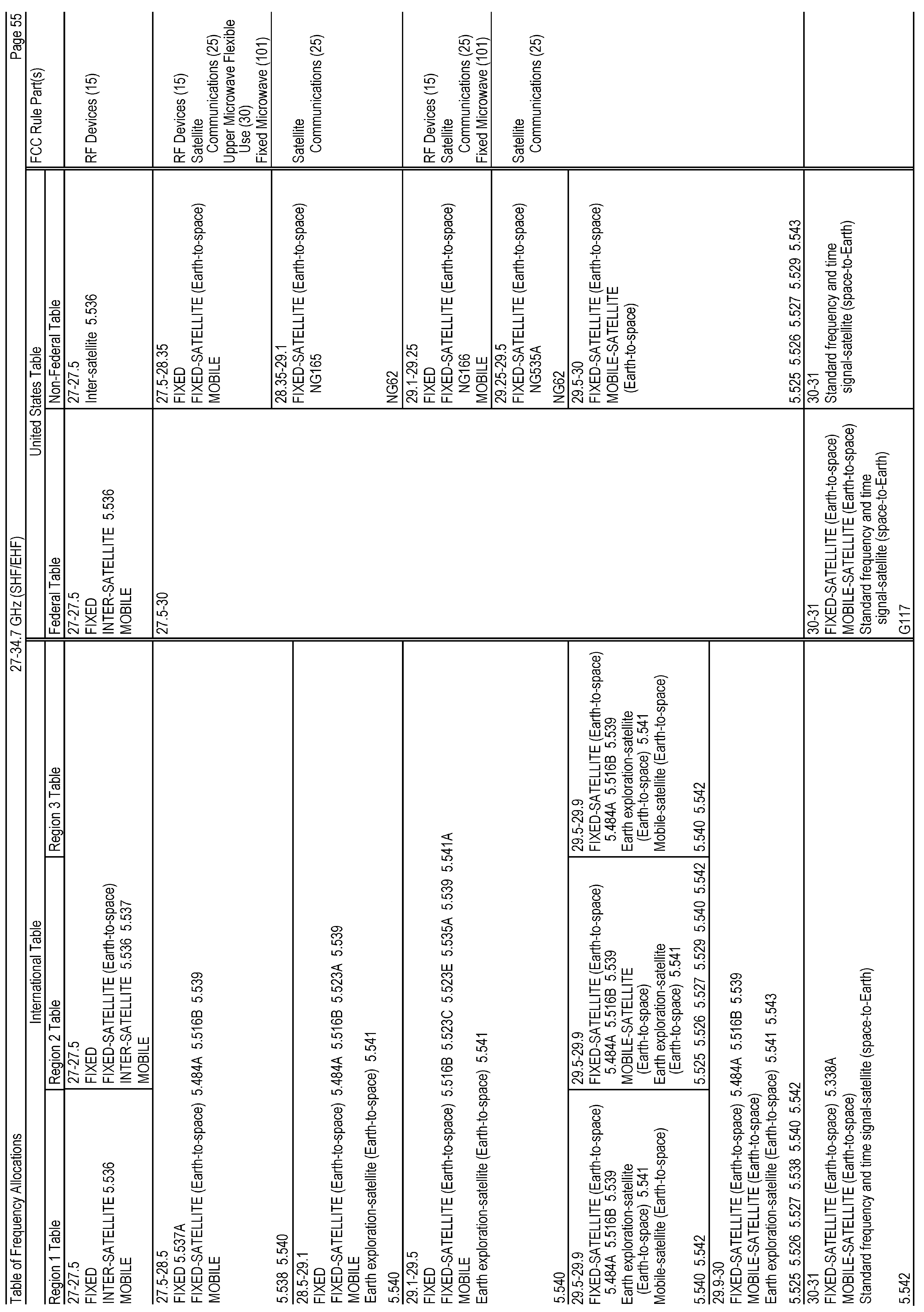 For clarity, the Notice proposed to codify the Ka-band Plan's satellite designations into footnotes to the U.S. Table of Frequency Allocations, and to remove duplicative notes in section 25.202(a)(1), except with respect to those notes concerning terrestrial operations in the 27.5-28.35 GHz and 37.5-40 GHz bands. Similarly, the Commission proposed to incorporate into footnotes to the Table the remaining frequency-use restrictions in section 25.202(a)(1) that were not recently amended in the Commission's Spectrum Frontiers proceeding. Commenters uniformly support this proposal, which we adopt for clarity. As proposed, we also codify the Ka-band Plan in the 27.5 29.5 GHz band by removing the primary fixed and mobile service entries from the 28.35-29.1 GHz and 29.25-29.5 GHz bands within the non-Federal Table of Frequency Allocations. We also add new footnote NG62 to the Allocation Table in order to permit incumbent fixed service licensees to continue to operate as authorized.