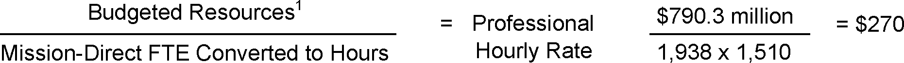 The NRC's professional hourly rate is derived by adding budgeted resources for: (1) Mission-direct program salaries and benefits; (2) mission-indirect program support; and (3) agency support (corporate support and the IG), and then subtracting certain offsetting receipts, and then dividing this total by the mission-direct full-time equivalents (FTE) converted to hours. The NRC is proposing to add the definitions for “mission-direct program salaries and benefits,” “mission-indirect program support,” and “agency support (corporate support and the IG)” to 10 CFR 170.3, “Definitions.” The mission-direct FTE converted to hours is the product of the mission-direct FTE multiplied by the estimated annual mission-direct FTE productive hours. The only budgeted resources excluded from the professional hourly rate are those for mission-direct contract resources, which are generally billed to licensees separately. The following shows the professional hourly rate calculation: