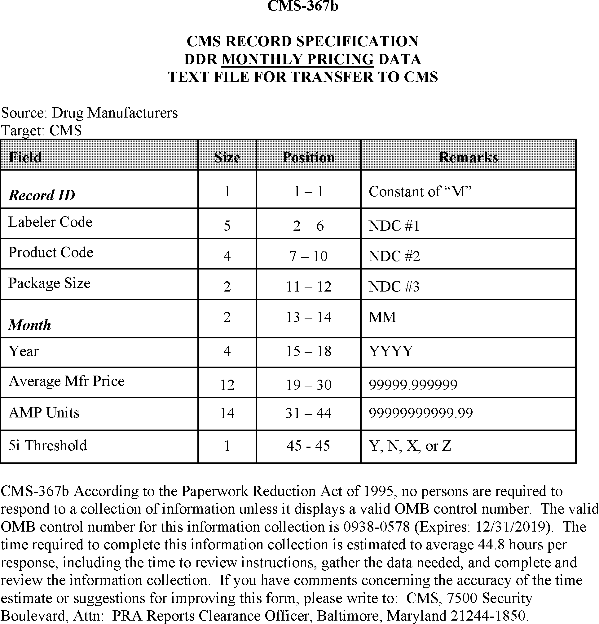 (e) In accordance with the OMB-approved CMS-367b form (OMB control number 0938-0578), report information including monthly AMPs and monthly AMP units for all covered outpatient drugs in accordance with 42 CFR 447.510. The manufacturer agrees to provide such information not later than 30 days after the end of the month of the effective date, and not later than 30 days after the end of each month thereafter.