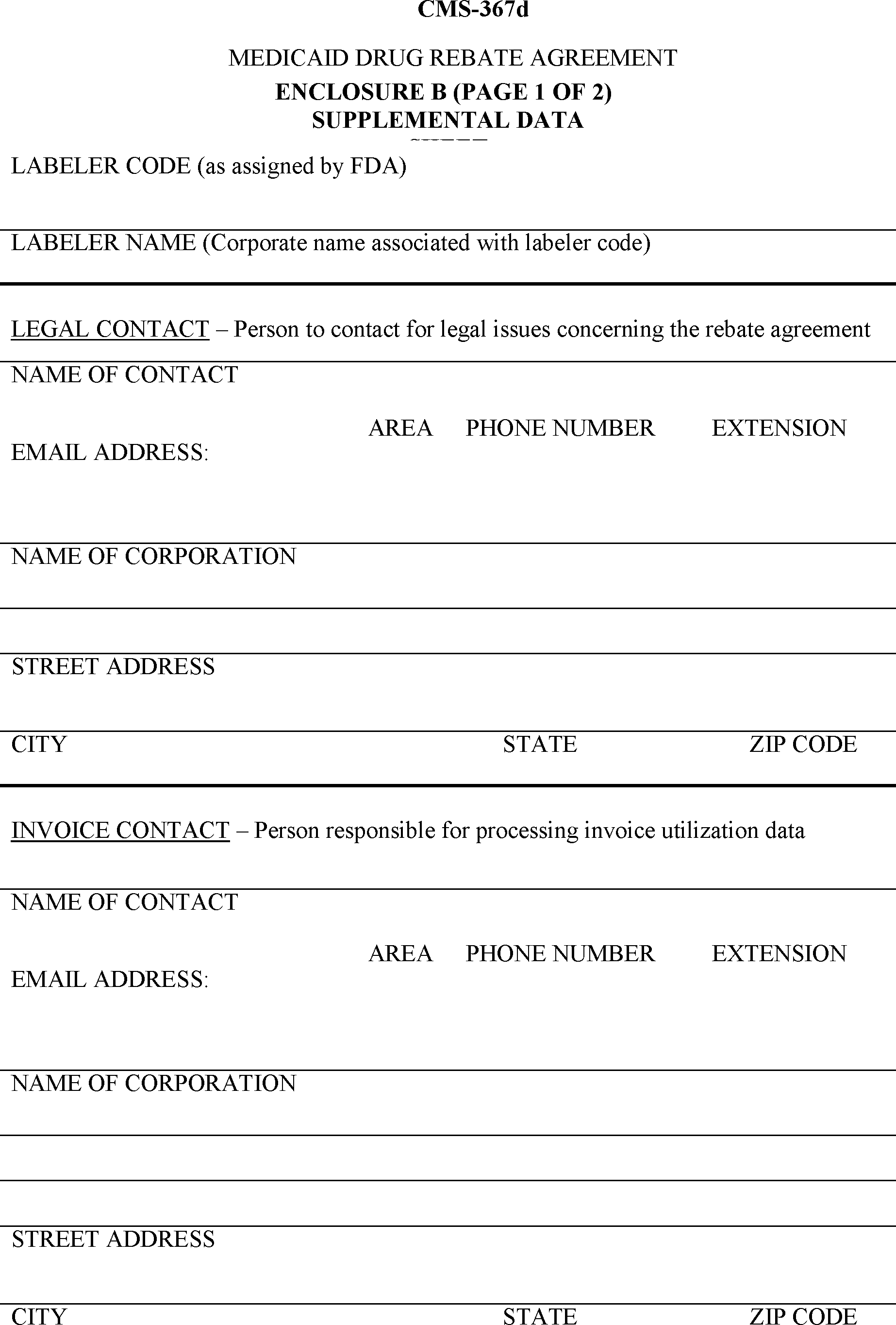 The CMS-367(d) allows the manufacturer to identify one main contact for each of the following issues: Legal, Invoice, and Technical, and the NDRA has been updated at section II.(a). to specify the three contacts required on the CMS-367(d). Therefore, section II.(a). will now specifically state that “[t]he manufacturer shall identify an individual point of contact for the Legal, Invoice, and Technical contacts at a United States address to facilitate the necessary communications with states with respect to rebate invoice issues.”