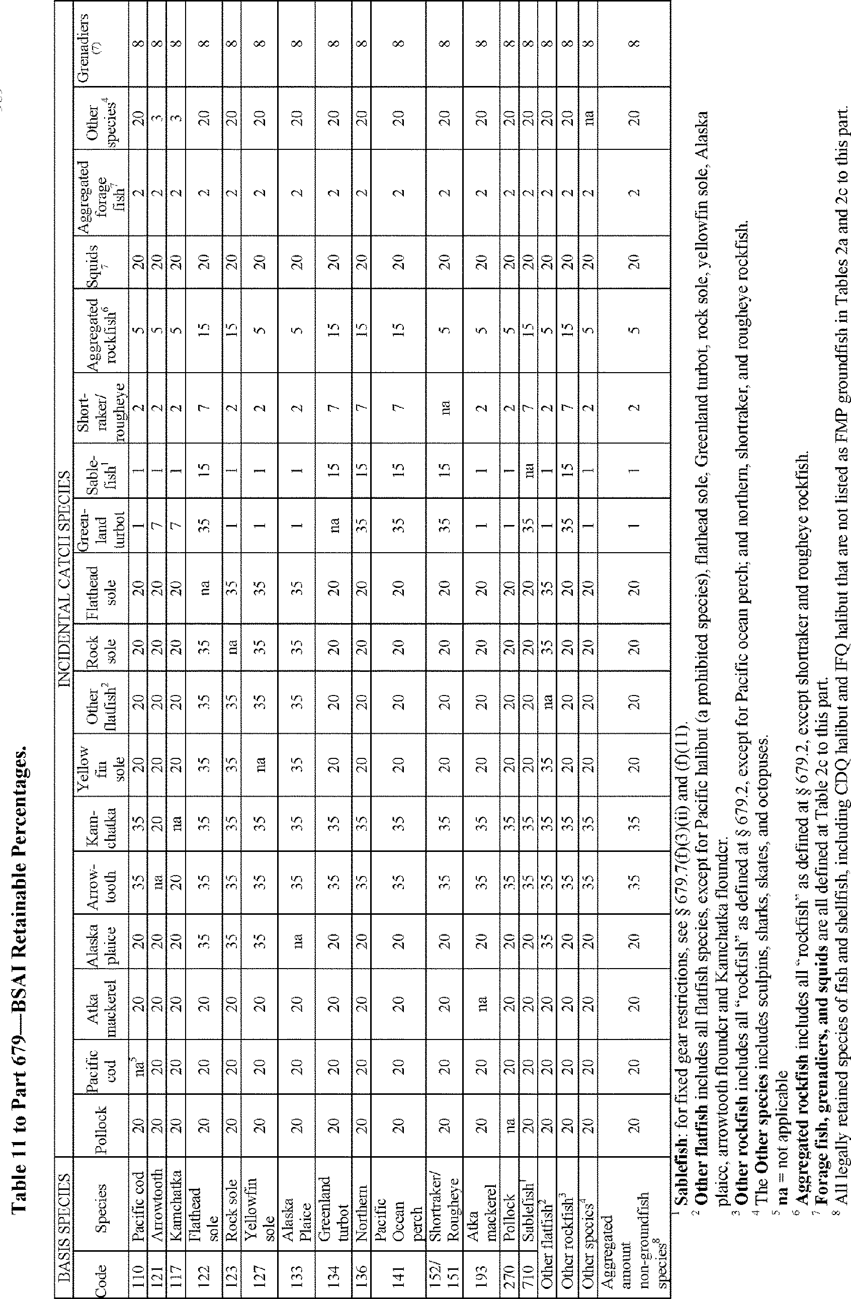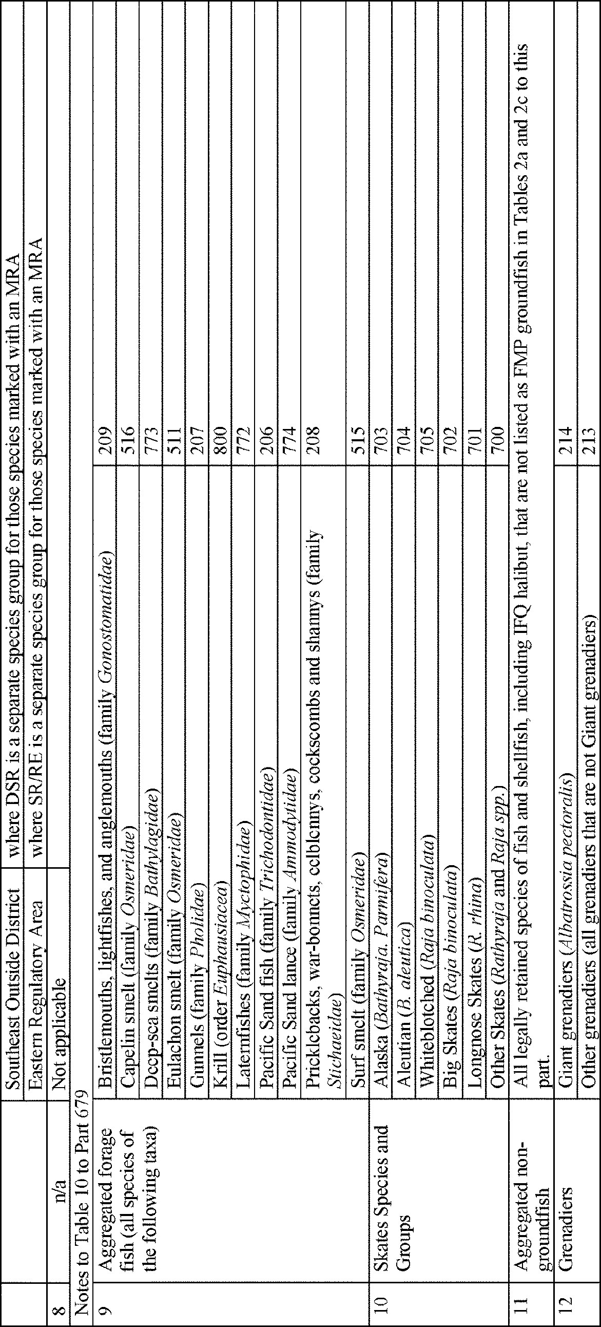 The MRA is the proportion or percentage of retained catch of a species closed for directed fishing (incidental catch species) to the retained catch of a species open for directed fishing (basis species). This proposed rule would move squids out of the basis species category and into the incidental catch species category consistent with the prohibition on directed fishing for squids under this proposed rule. In the GOA, squids are included in the “other species” category (along with sculpins, octopus, and sharks) for MRA purposes under the existing regulations. To specify a separate MRA for squids in the GOA, this proposed rule would remove squids from footnote 6, “other species” in Table 10 to 50 CFR part 679 and add squids as an incidental catch species with an MRA of 20 percent. This proposed rule would similarly revise Table 11 to 50 CFR part 679 to remove squids as a basis species in the BSAI and add squids and grenadiers footnote 7 to indicate that forage fish, grenadiers, and squids are all defined in Table 2c. This proposed change would render obsolete, footnote 9 to Table 11 at 50 CFR part 679, and it would be removed.
