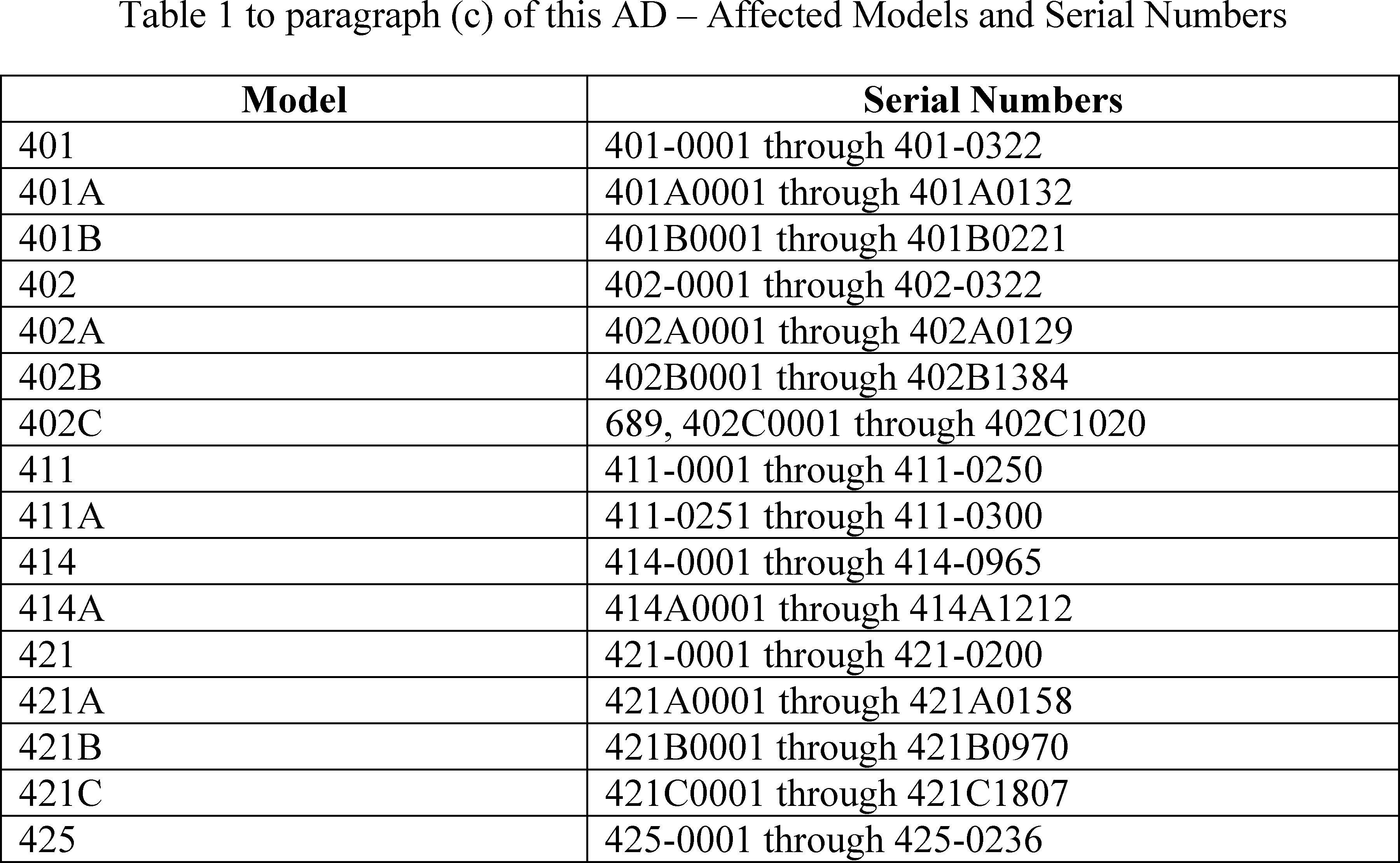 Models 401, 401A, 401B, 402, 402A, 402B airplanes: